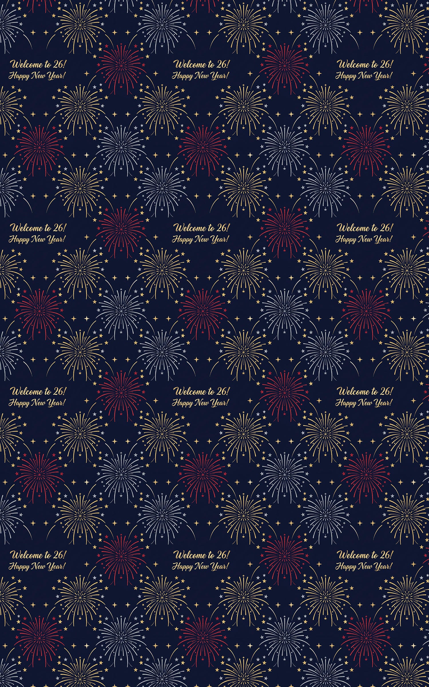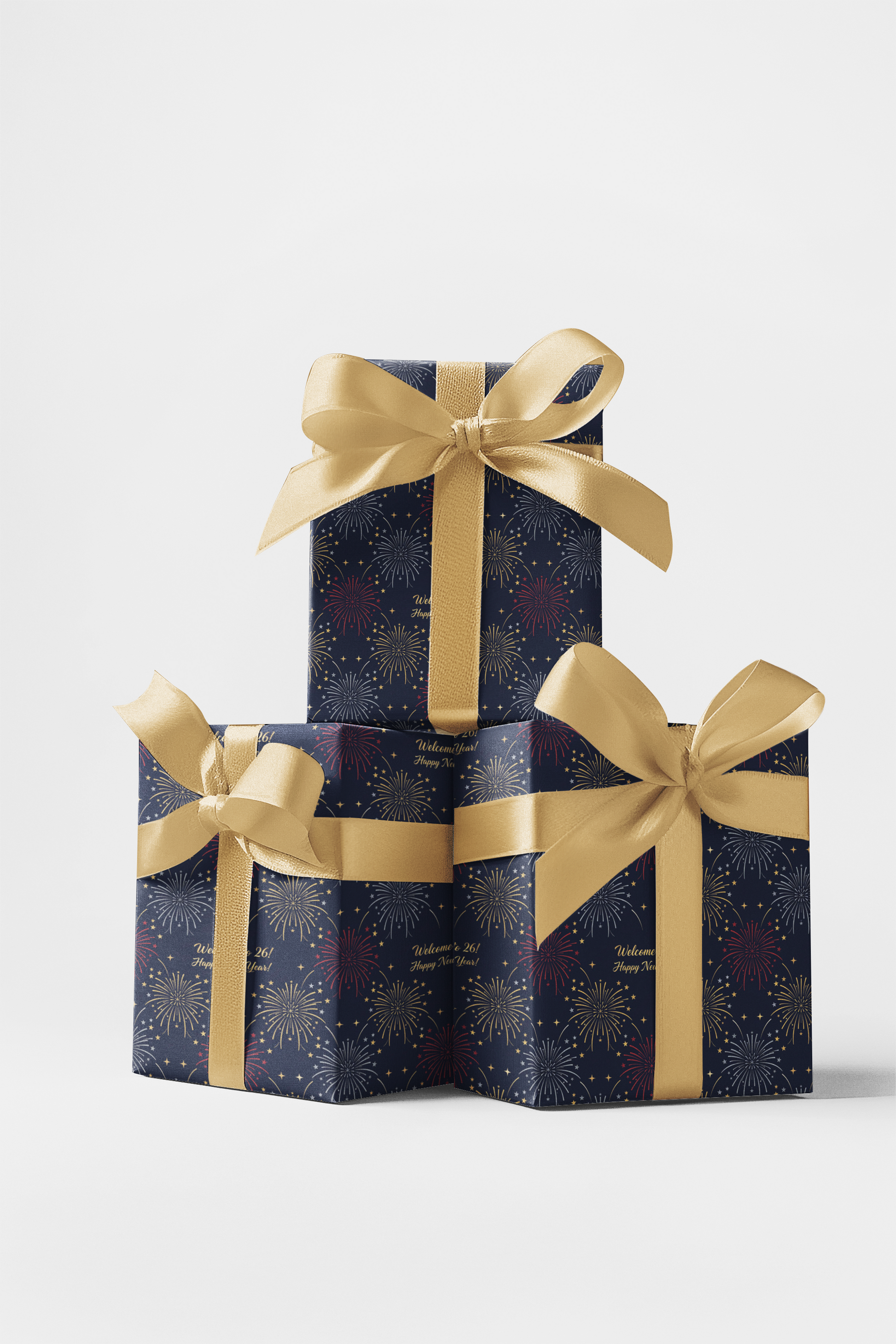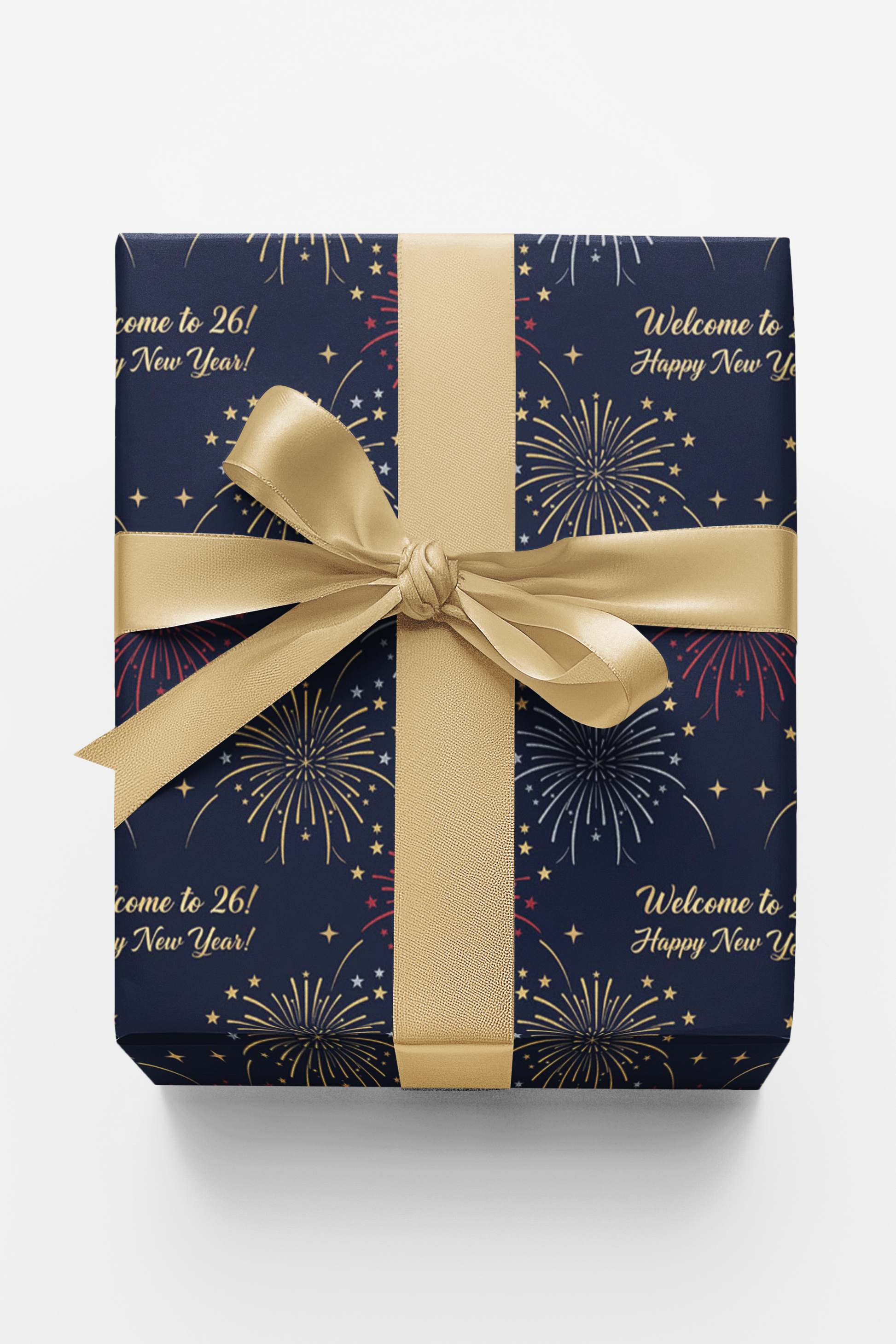 Light up the party with our 26 & Shining wrapping paper! This elegant, celebratory design features a continuous, seamless pattern of stylized fireworks bursting in gold, silver, and crimson lines across a deep, midnight-blue background. Subtle text reading 'Welcome to 26! Happy New Year!' is integrated throughout, making it the perfect dual-purpose paper for a 26th birthday bash or ringing in the new year. It offers a sophisticated, festive aesthetic that adds sparkle and excitement to any gift.