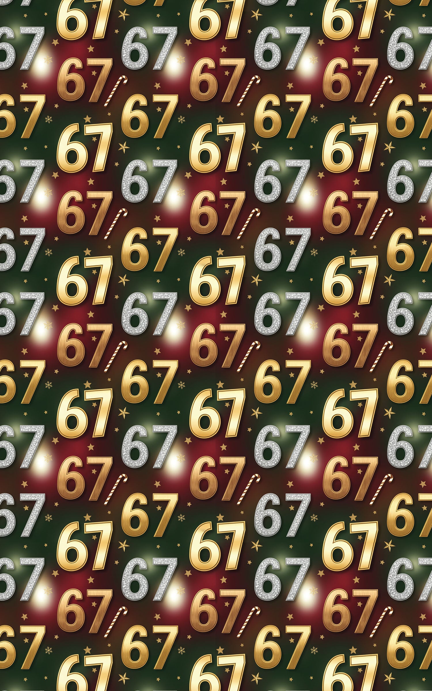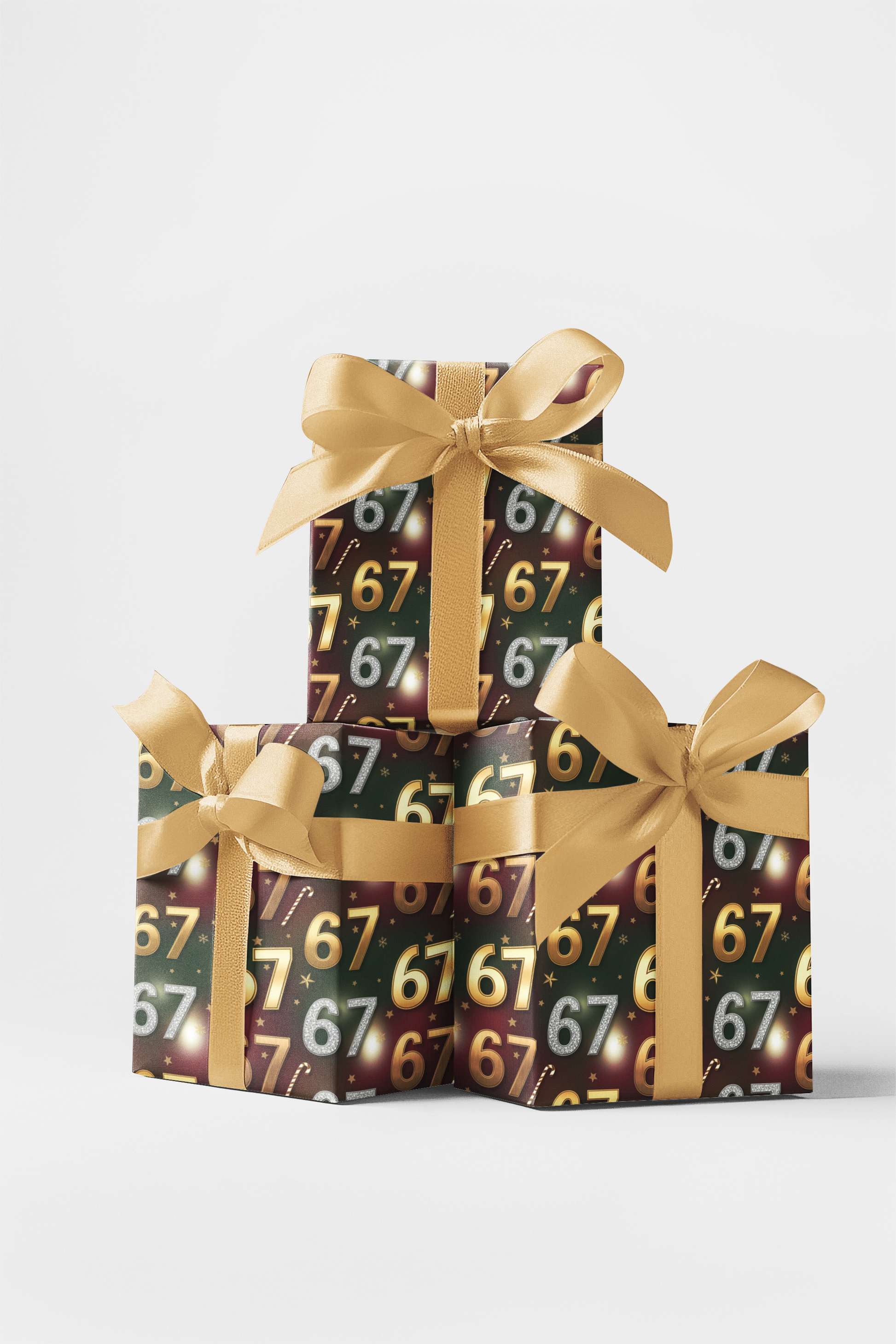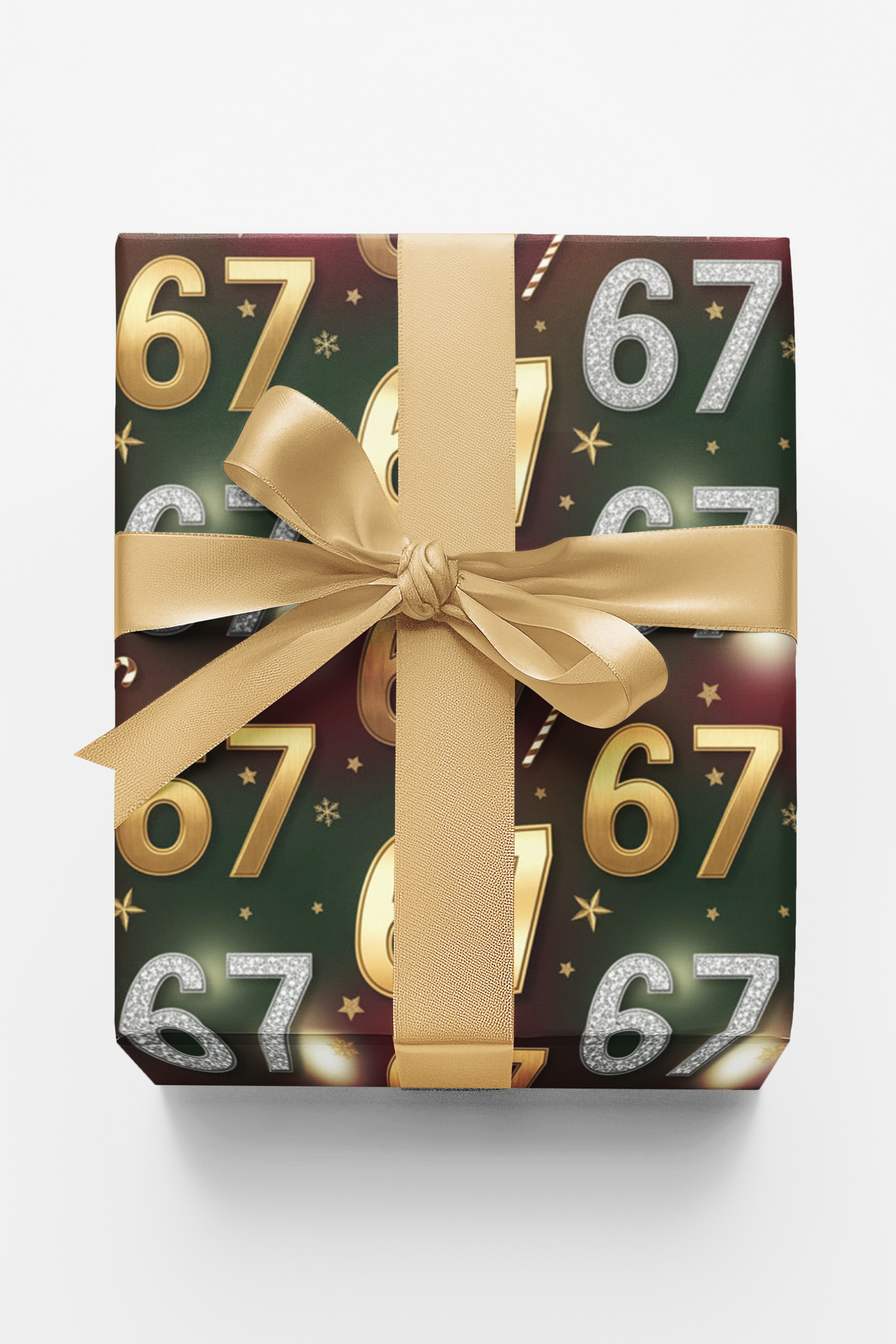 Add cheerful holiday charm to your gifts with 67 Candy Cane Splash wrapping paper. The seamless pattern features large, playful numerals, with the “6” wearing an oversized Santa hat for a fun touch. Candy canes and colorful baubles are scattered like confetti for extra movement and festivity. Bright green numbers paired with pink, red, and pastel accents create a lively holiday look. Crisp printing and vibrant colors make this wrap a fun, standout choice for Christmas gifts and celebrations.