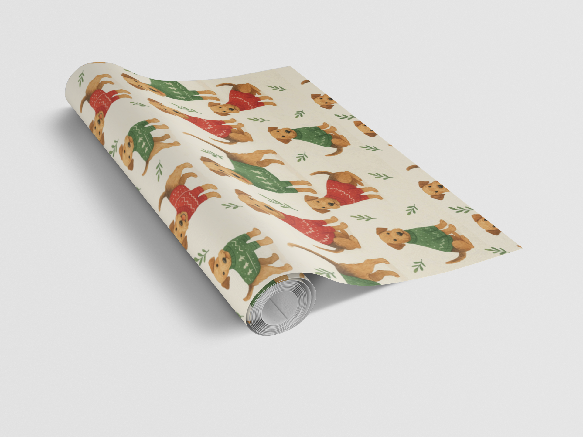 Add a cheerful touch to your holiday gifts with this charming wrapping paper featuring Airedale Terriers dressed in festive holiday sweaters. Illustrated in a warm watercolor style, this design captures the joyful spirit of the season with a playful yet cozy feel. Perfect for dog lovers and holiday enthusiasts alike, it’s an adorable way to make every present feel extra special.