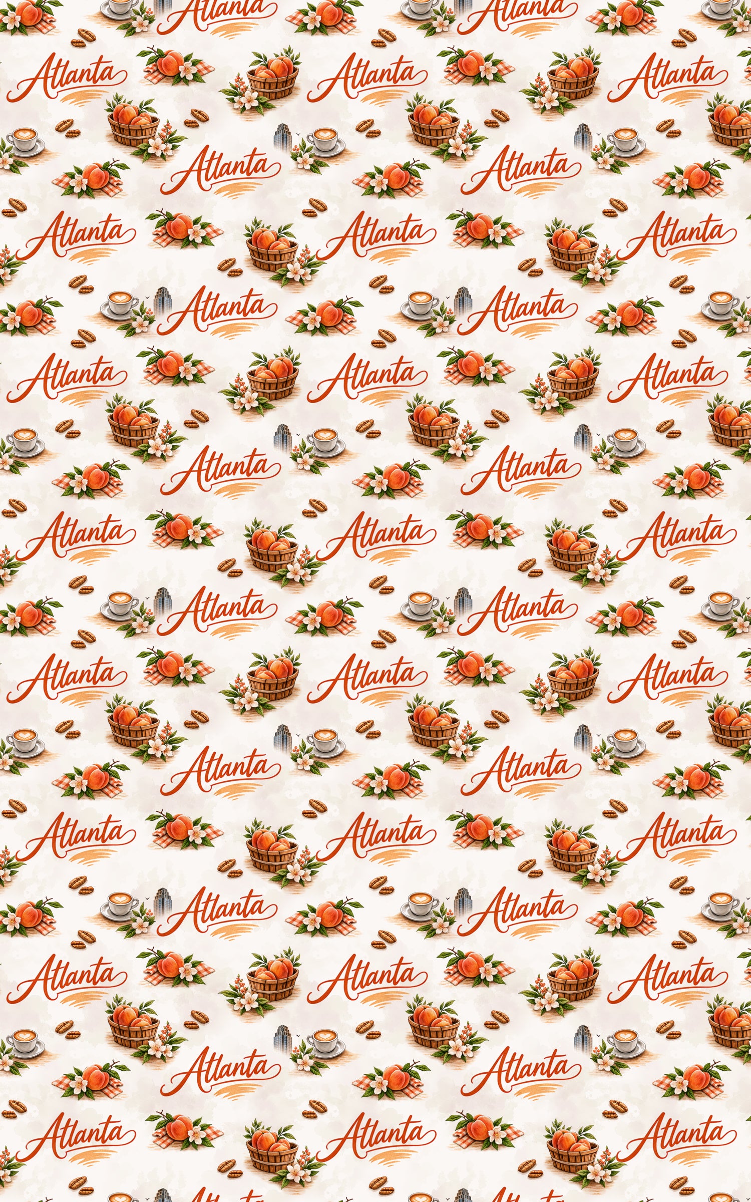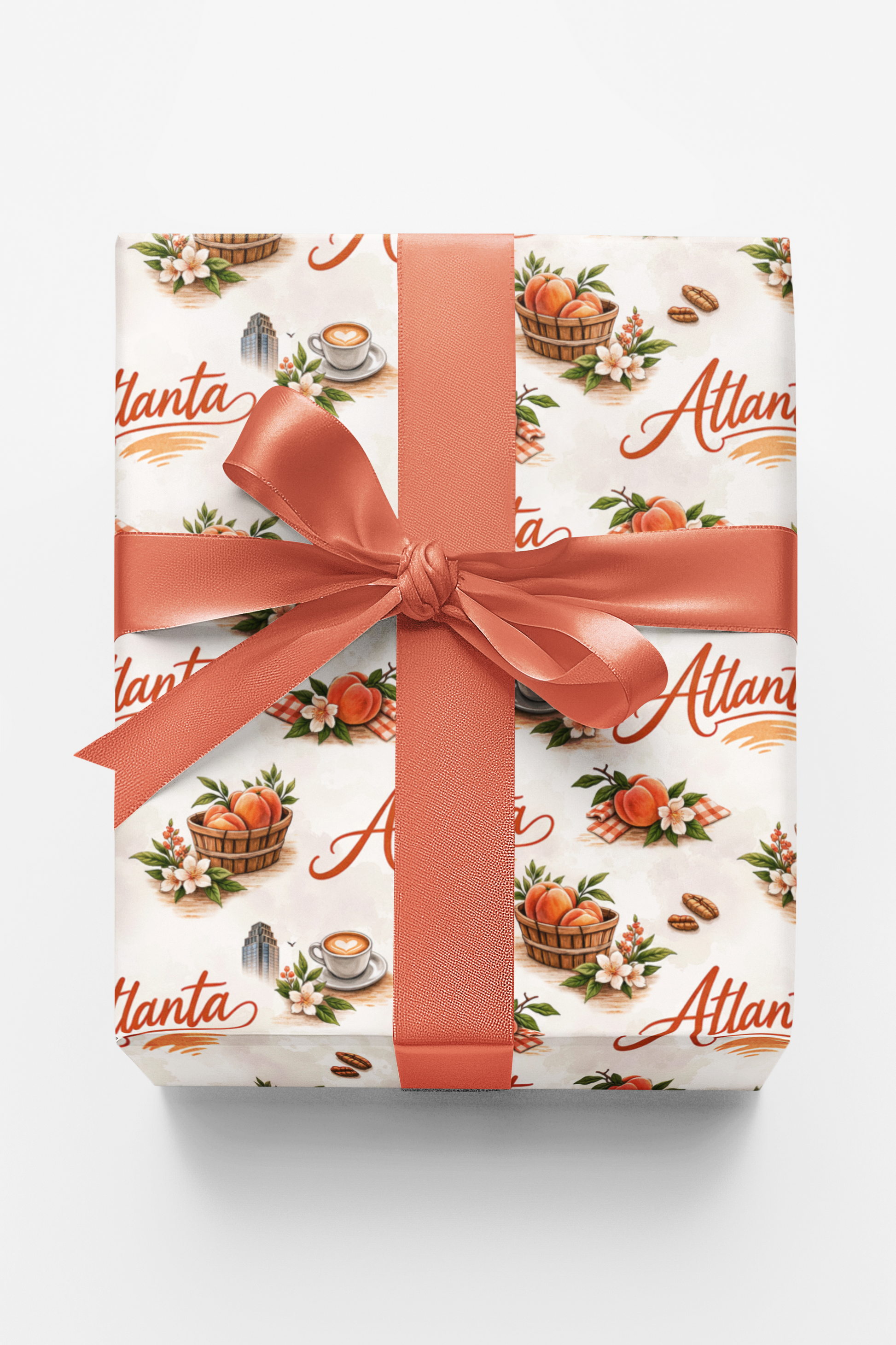 Atlanta Peachy Retro celebrates Southern charm with a nostalgic, illustrated pattern featuring ripe Georgia peaches, woven baskets, delicate peach blossoms, coffee cups, and subtle skyline details—all anchored by a bold retro “Atlanta” script. Rendered in warm peach, coral, soft orange, creamy ivory, leafy green, and rich espresso brown tones, this design blends vintage flair with fresh, modern sweetness. Perfect for birthdays, housewarmings, hostess gifts, holidays, or year-round gifting, it captures the heart of Atlanta with a cozy café-meets-farmers-market feel. Pair it with satin peach ribbon, crisp white accents, or warm gold metallic touches for an effortlessly polished presentation full of Southern personality