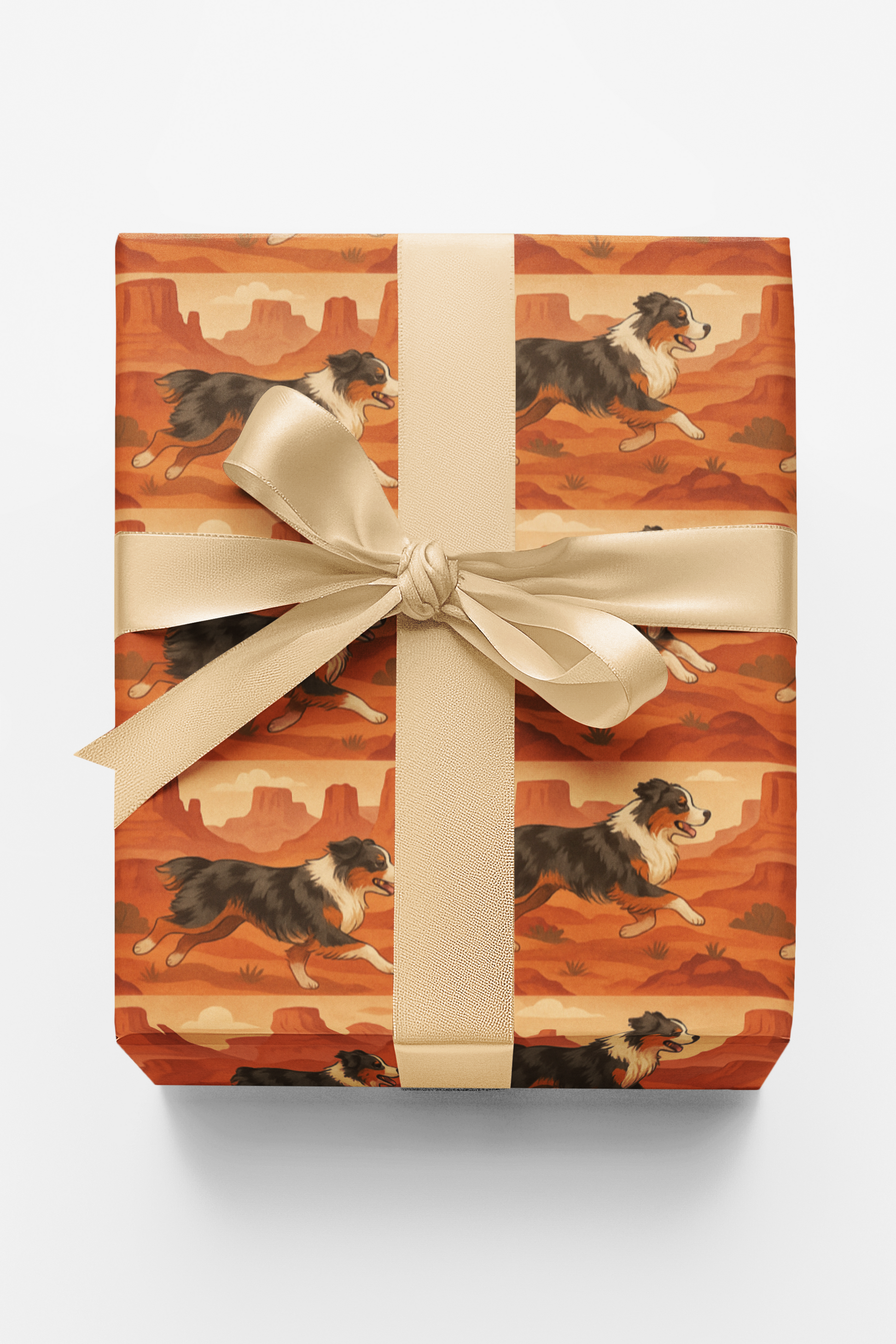 Set out on a journey of color and spirit with our Aussie Adventure Wrapping Paper! This dynamic design features Australian Shepherds running freely across canyon landscapes, brought to life in a warm, earthy color palette of rust, sand, and sienna tones. Perfect for dog lovers, outdoor enthusiasts, and anyone drawn to the beauty of the open wilderness, this wrap captures the joyful energy and natural grace of the Aussie in motion.