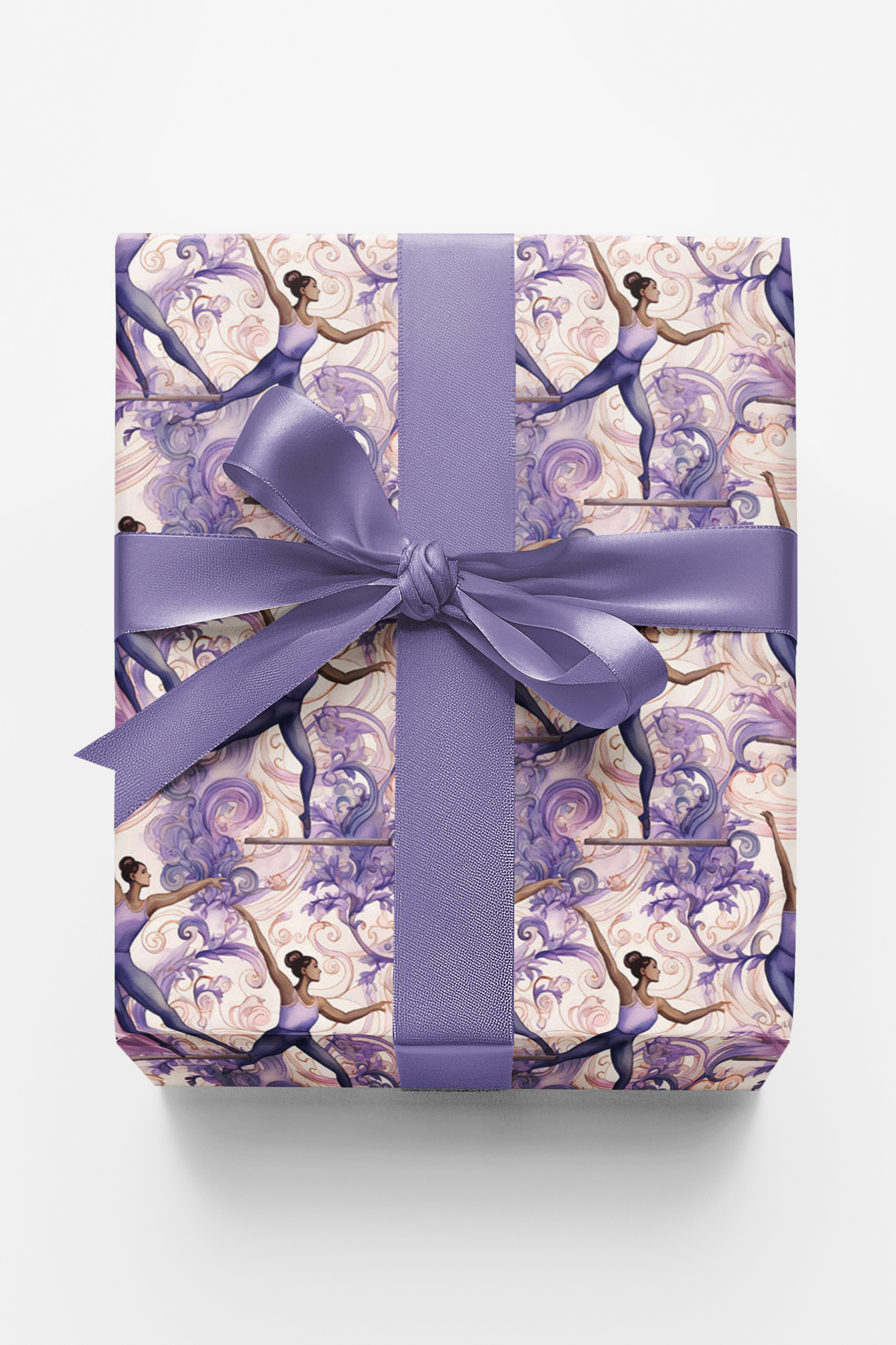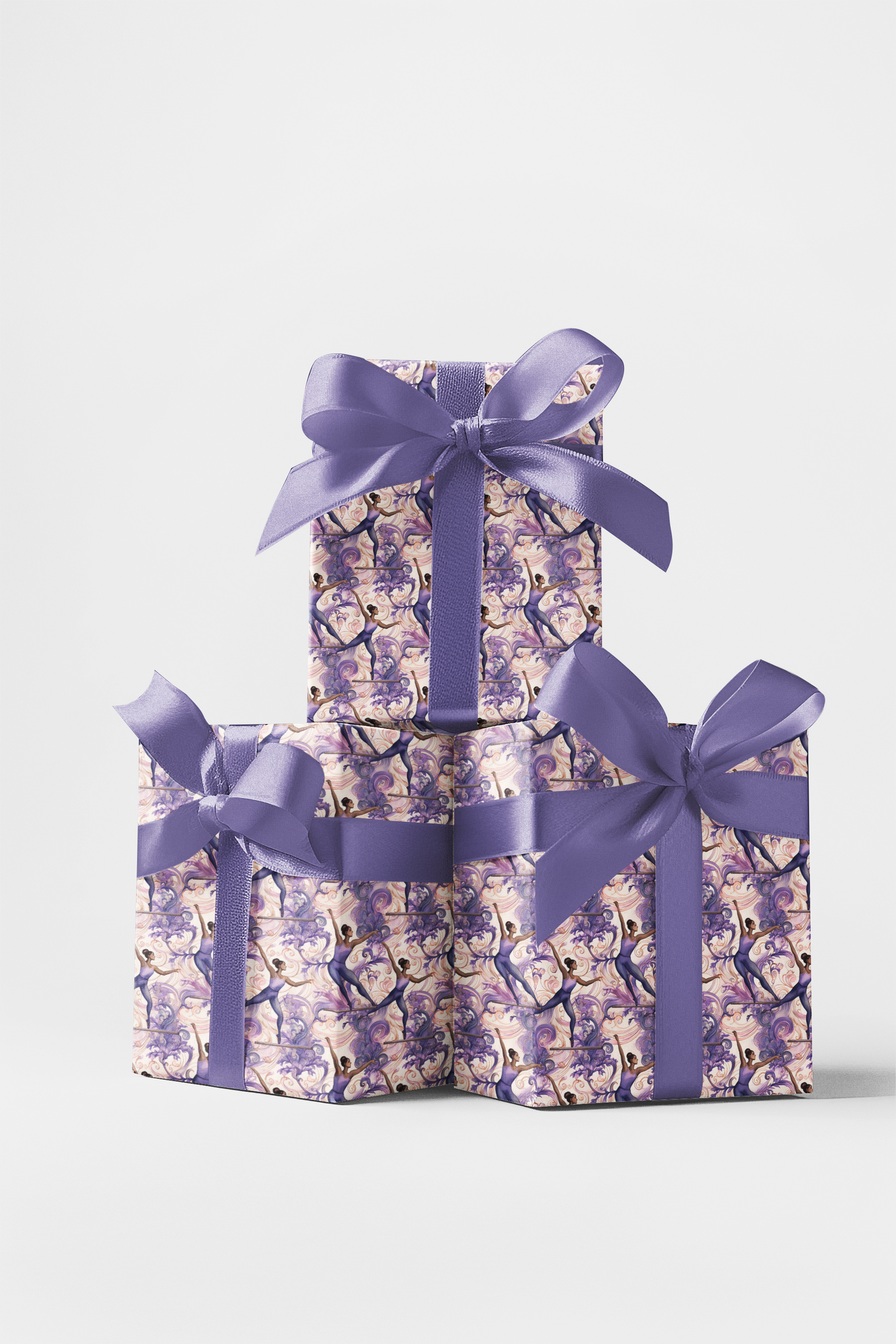 Elevate your gifting with our Beam & Elegance. Featuring elegant gymnasts performing on balance beams framed by intricate scrollwork, this design blends artistry and athletic grace. Rendered in soft lilac and champagne tones, it evokes sophistication and poise—perfect for those who appreciate beauty, strength, and refined detail. Ideal for birthdays, recitals, or special celebrations, this wrapping paper turns every gift into a work of art.