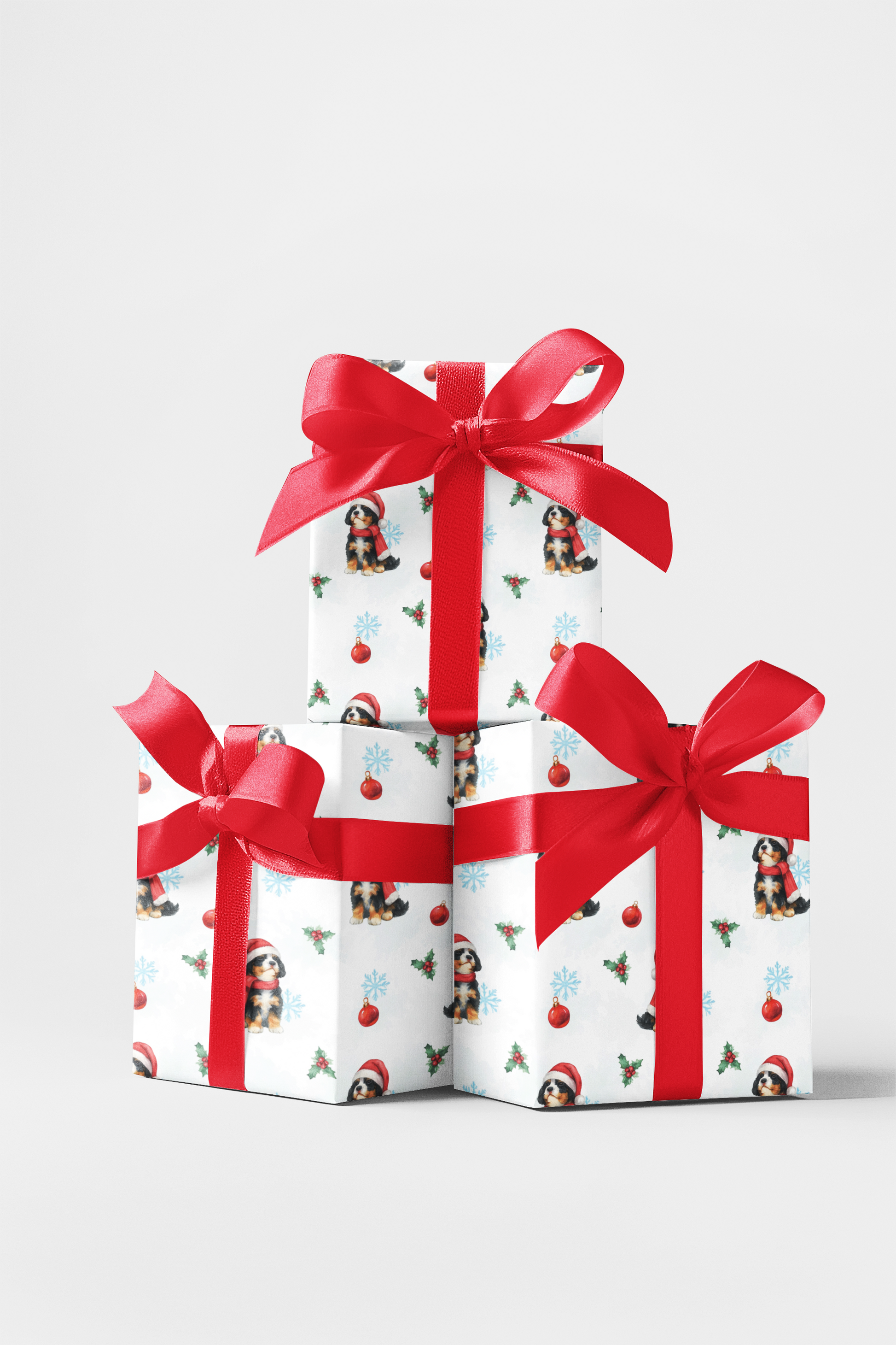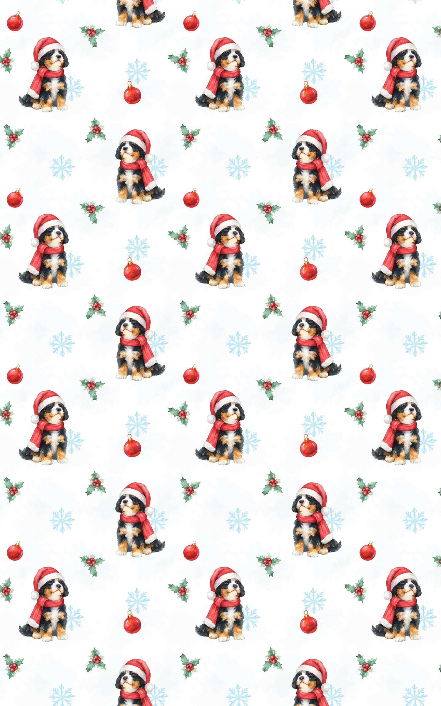 A Joyful Winter Wonderland of Cuteness brings pure holiday cheer with an irresistibly charming twist. This delightful pattern features an adorable Bernedoodle puppy dressed in a festive Santa hat and bright red scarf, surrounded by classic Christmas elements like holly sprigs, shiny red ornaments, and soft blue snowflakes. Set against a light, wintery background, the design feels warm, cozy, and full of seasonal magic. Perfect for wrapping paper, holiday décor, and gift-ready products, this pattern radiates sweetness and charm—capturing the playful spirit of Christmas in every repeating scene.