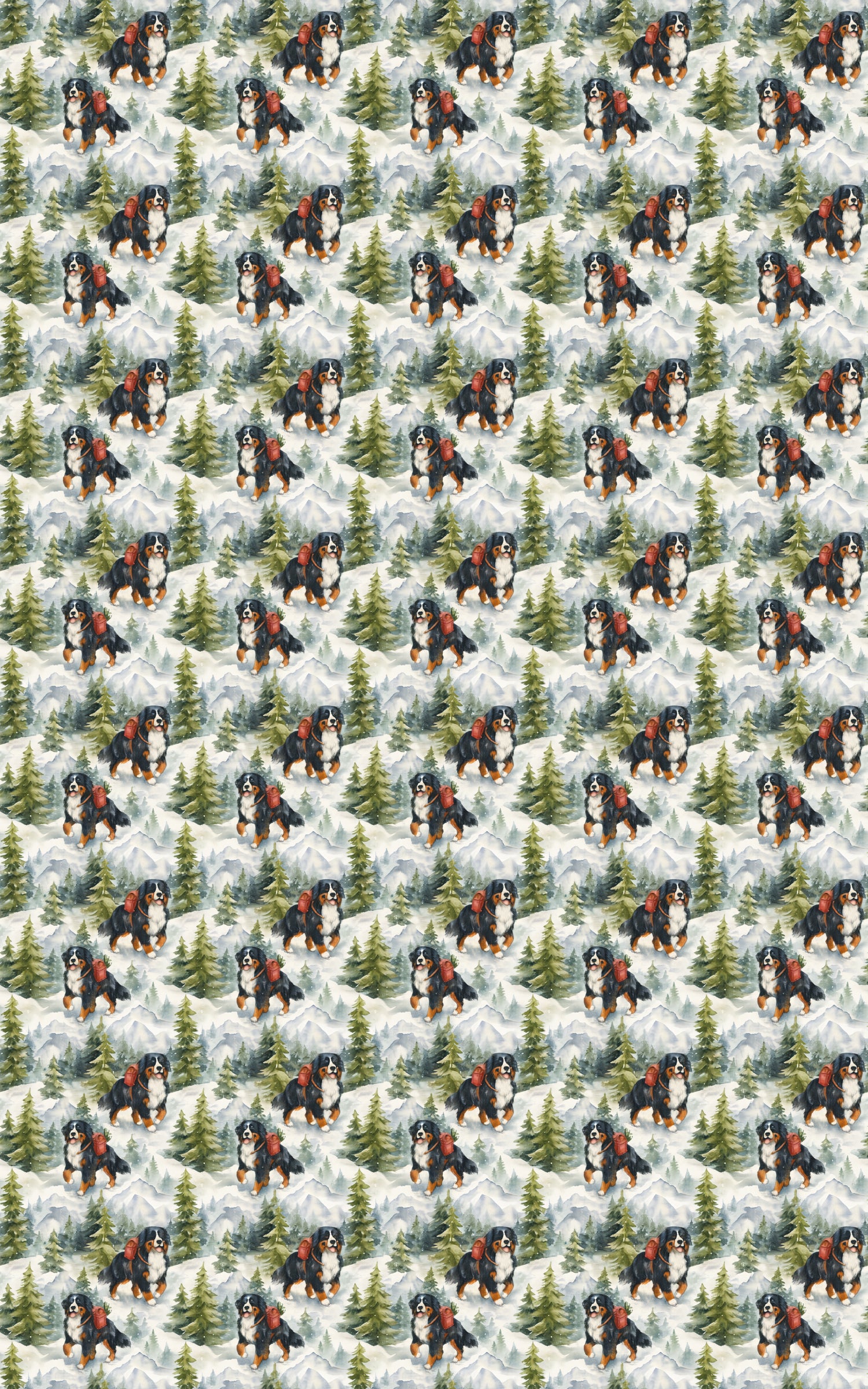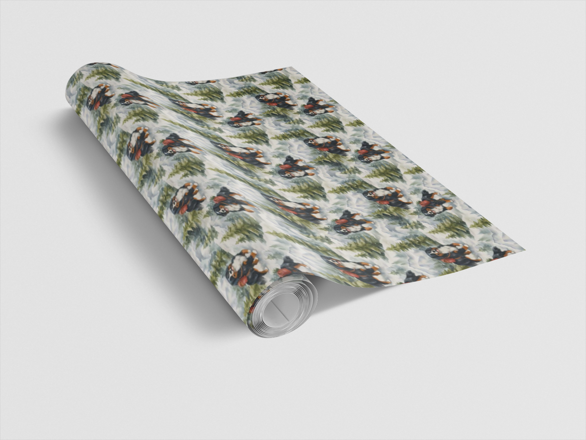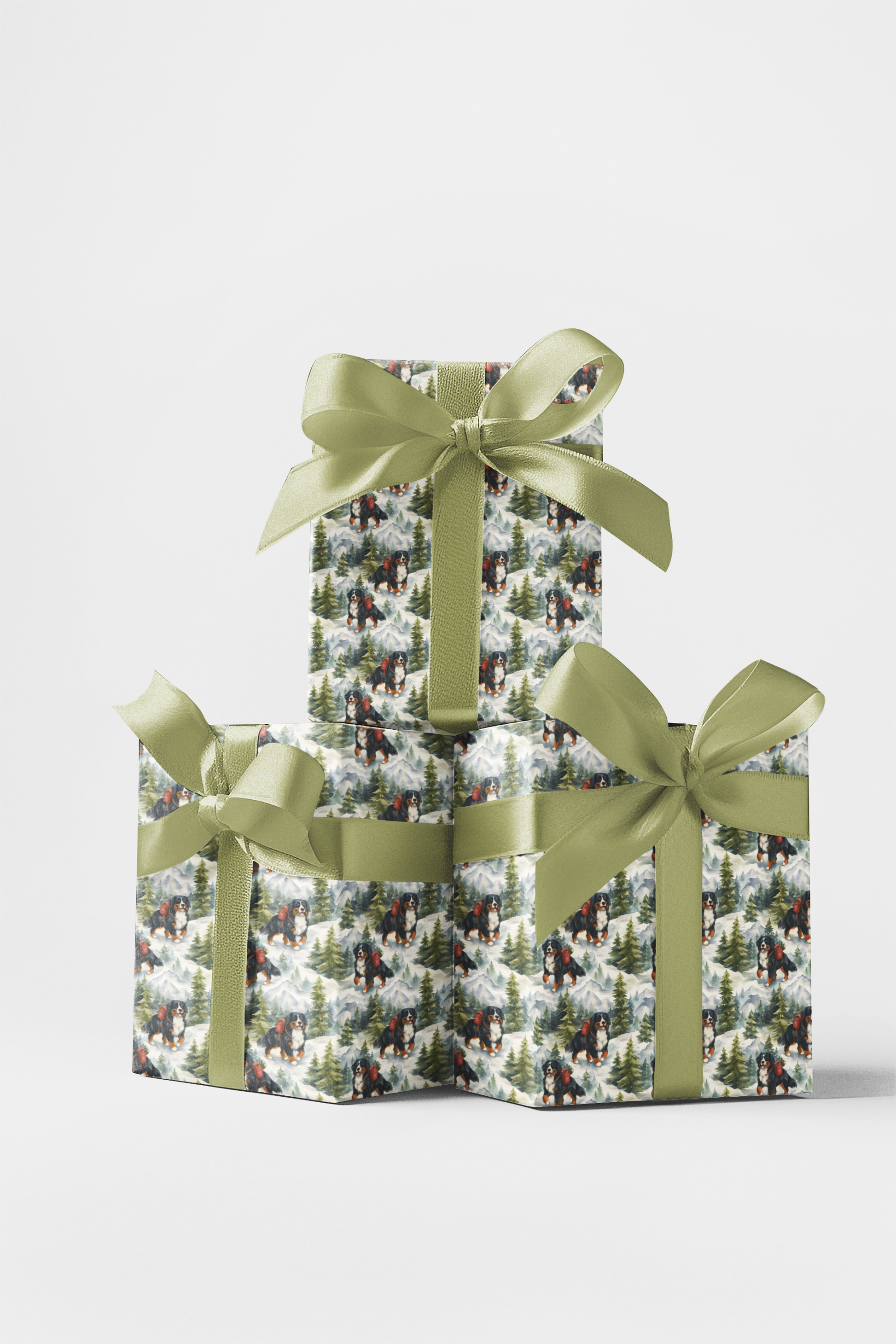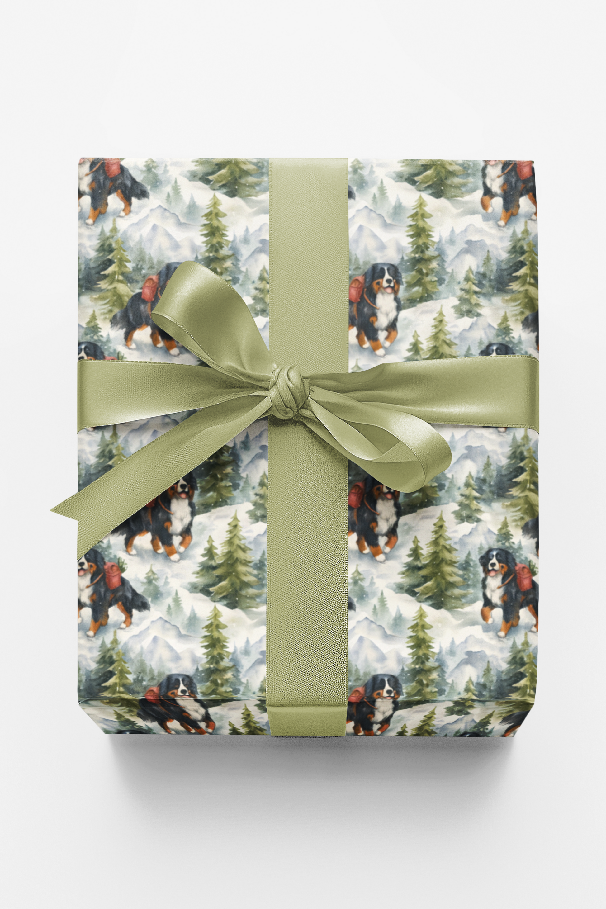 Bring the magic of the mountains to your gifts with our Bernese Alpine Holiday Wrapping Paper. This heartwarming design showcases Bernese Mountain Dogs trekking through snowy alpine landscapes, each carrying festive holiday packs against a backdrop of majestic peaks and evergreen pines. Perfect for Christmas wrapping or winter gifting, it blends rustic charm and seasonal joy in a beautifully illustrated scene inspired by alpine adventures.