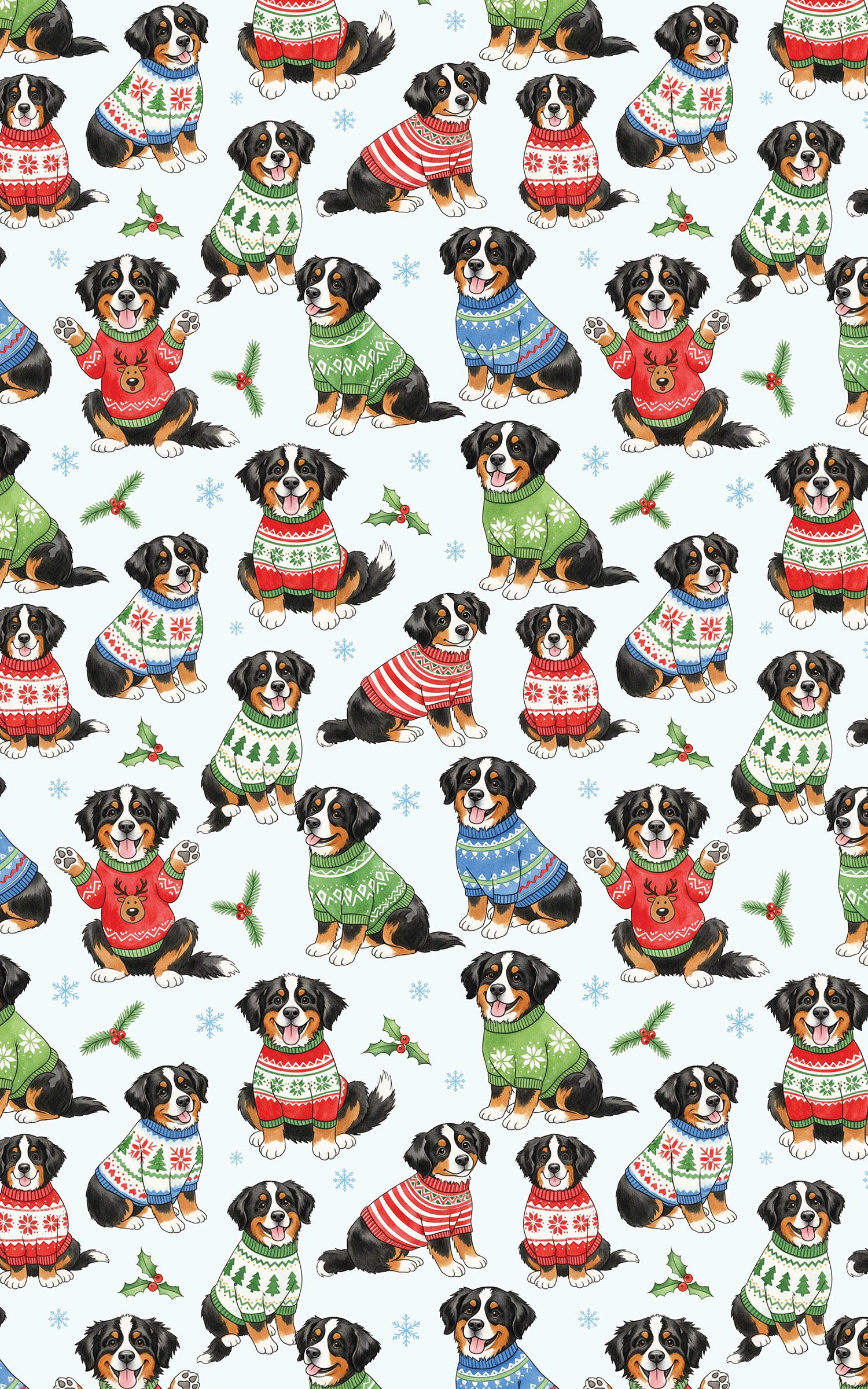 Bring warmth and charm to your holiday gifts with this delightful wrapping paper featuring repeating patterns of Bernese Mountain Dogs in cozy holiday sweaters. Hand-painted in watercolor with soft shadows, each design is arranged with balanced spacing for a polished and cheerful look. Perfect for Christmas wrapping, seasonal crafts, or for dog lovers who enjoy a festive and heartwarming touch.