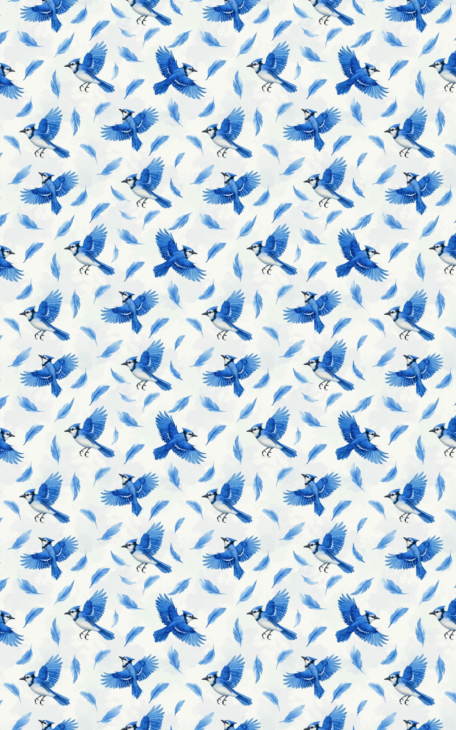 Graceful, vibrant, and full of life this blue jay pattern captures the timeless beauty of nature in motion. With soft feathers drifting across the sky and the striking blue of these spirited birds, it brings a sense of calm, wonder, and natural elegance to any project.