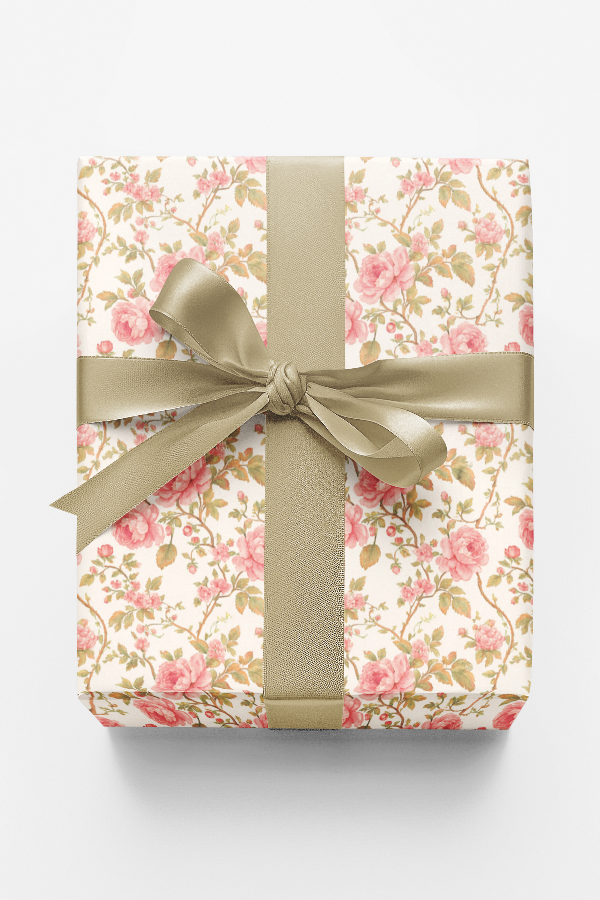 Draped in soft blush and antique gold, Rose Reverie whispers tales of timeless romance and afternoon tea in sunlit gardens. Each rose unfurls like a memory—gentle, fragrant, and endlessly graceful—while delicate vines weave through the design with quiet elegance. This wrapping paper captures the poetry of nostalgia and the warmth of vintage beauty, where every fold feels like the turning of a cherished love letter sealed with floral dreams.