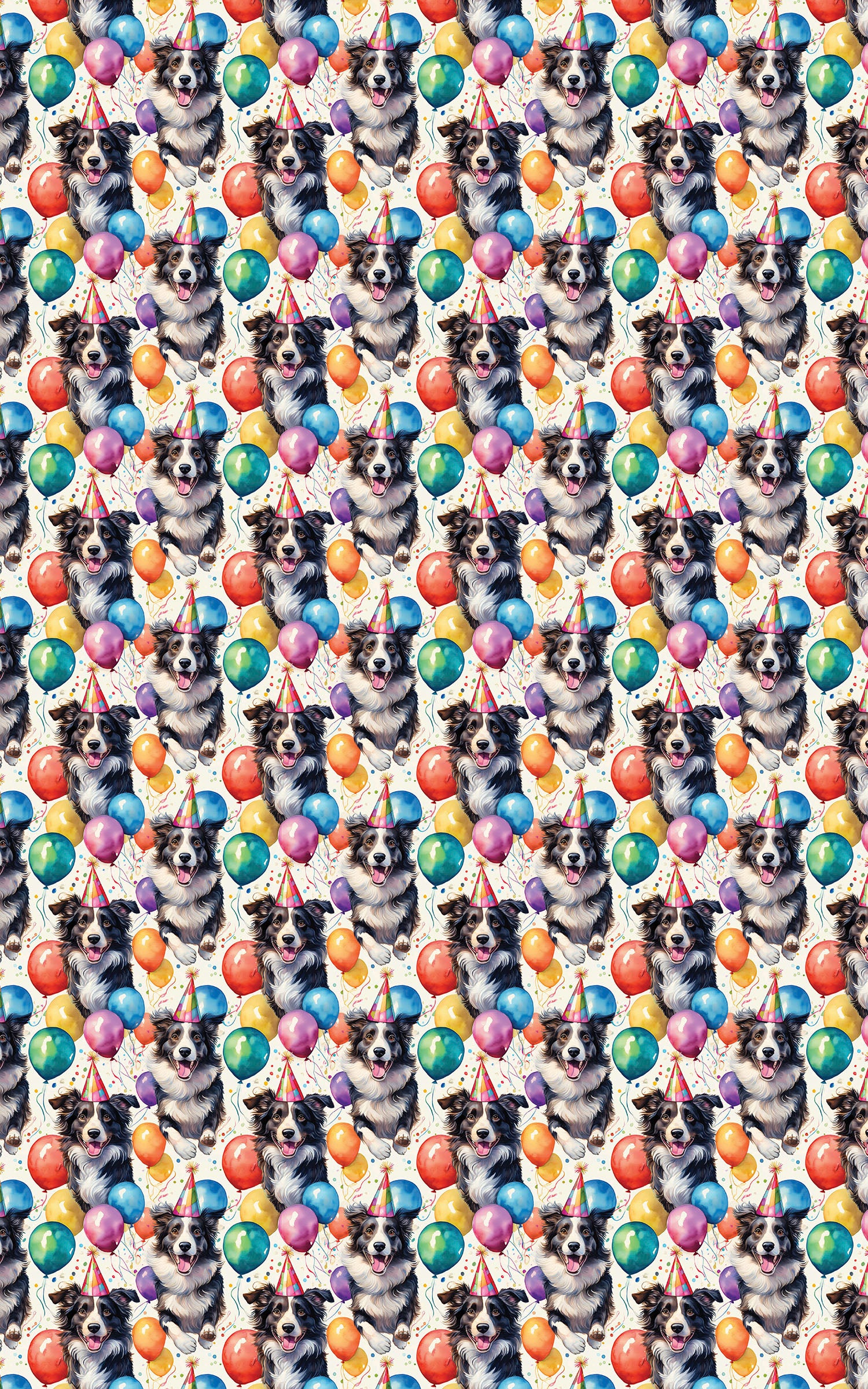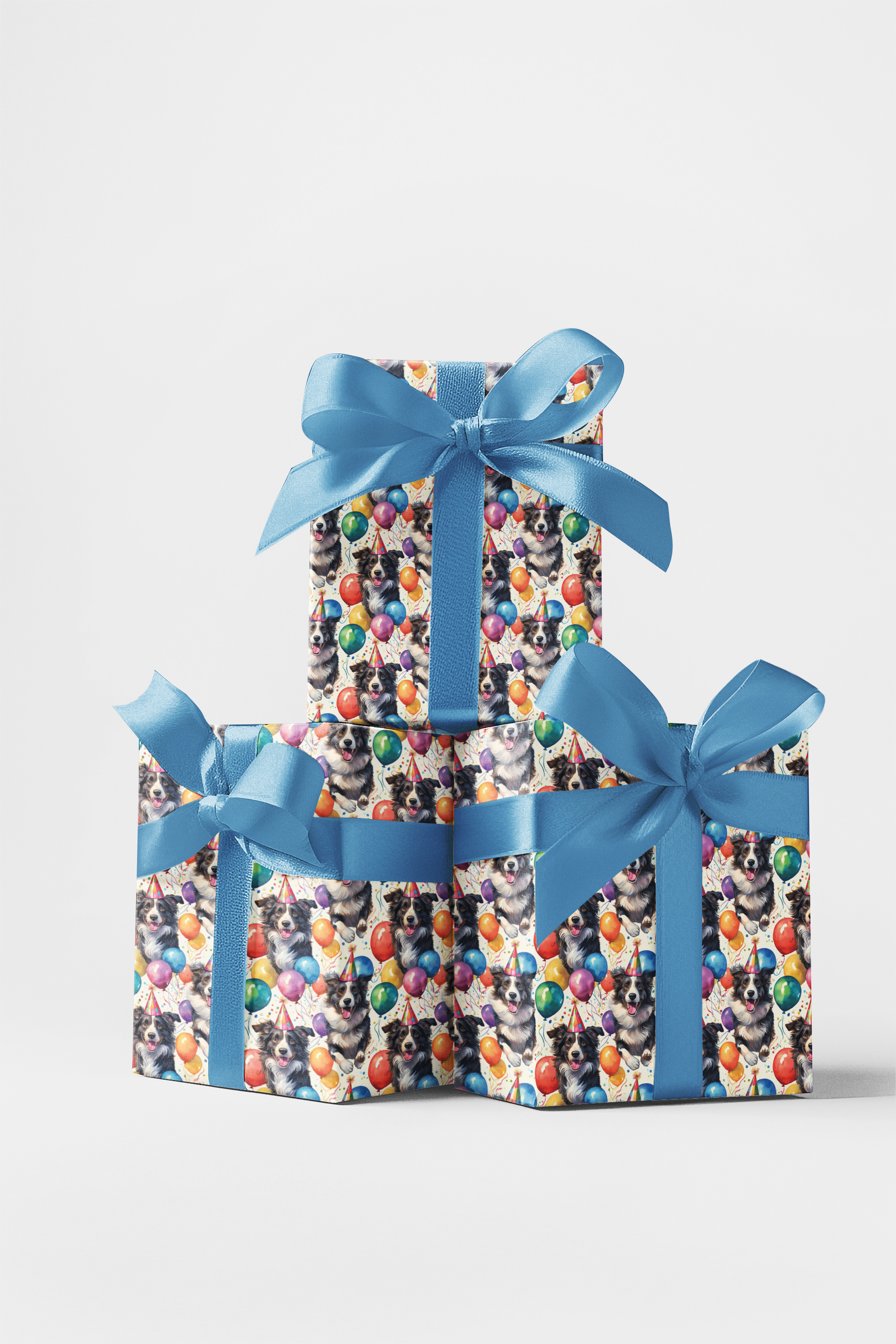 Bring extra joy to every gift with this playful wrapping paper featuring a lively Border Collie in mid-run, decked out in a colorful party hat. Surrounded by cheerful balloons and festive confetti, the hand-painted design captures the spirit of celebration in every detail. Perfect for dog lovers and party enthusiasts alike, this bright and whimsical paper makes birthdays feel even more special.