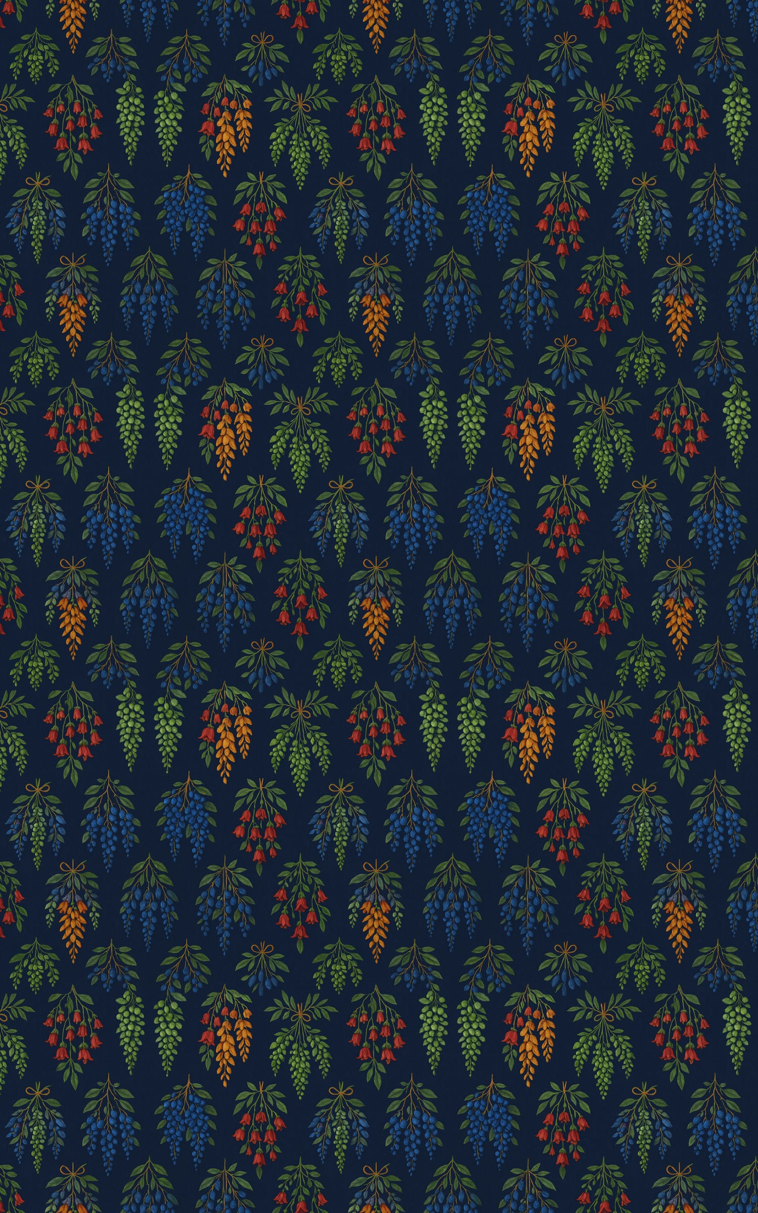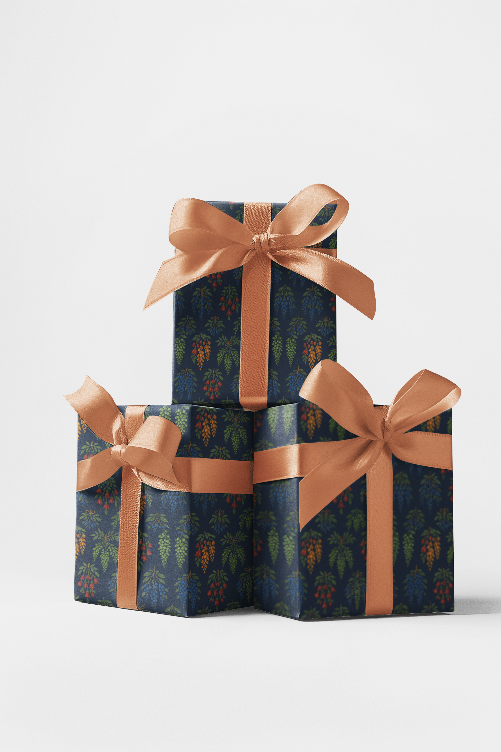 Botanic Chandelier features elegantly suspended botanical clusters arranged like ornate, nature-inspired chandeliers. Each element drapes with refined symmetry, creating a luxurious yet organic statement across the pattern. This design brings a touch of vintage opulence and botanical charm—perfect for elevated, artistic gift presentation.