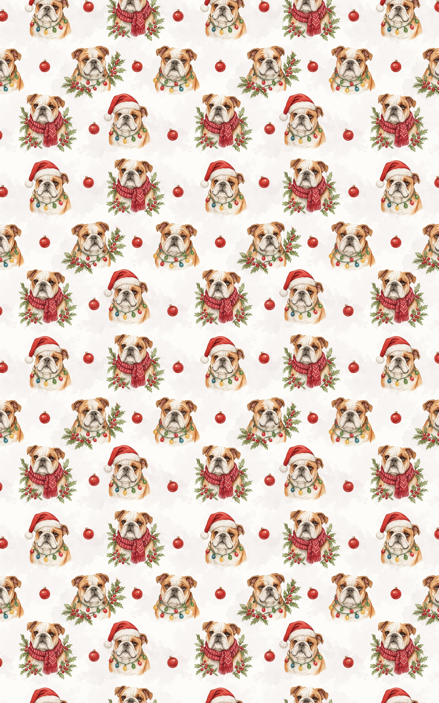 With a Santa hat perched snugly and a scarf wrapped against the winter chill, this bulldog radiates cozy holiday charm. Draped in twinkling lights and framed by festive greenery, he captures the heart of the season—serious in expression, but full of love at heart. This design wraps every gift in warmth, cheer, and the steadfast devotion only a bulldog can bring to Christmas.