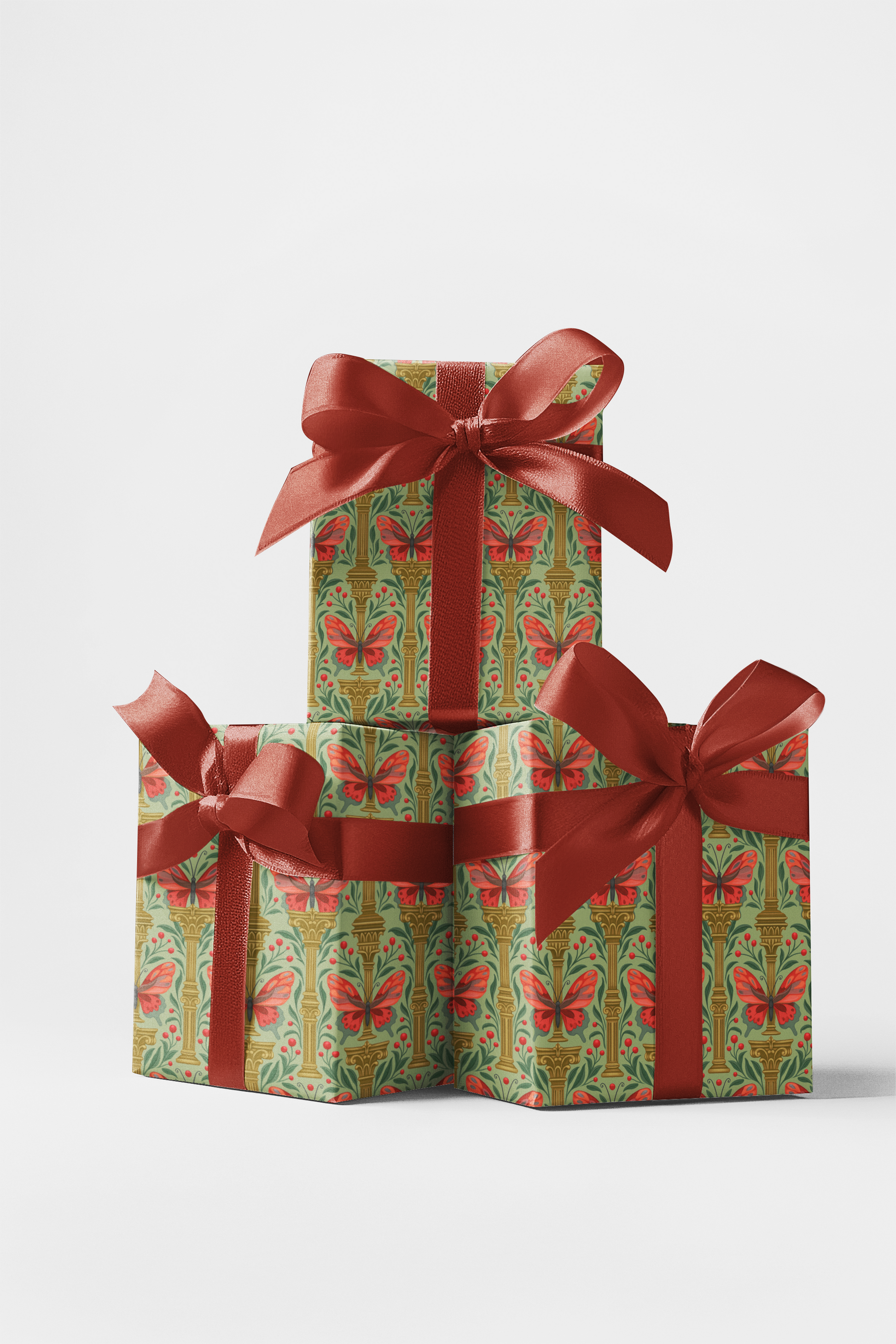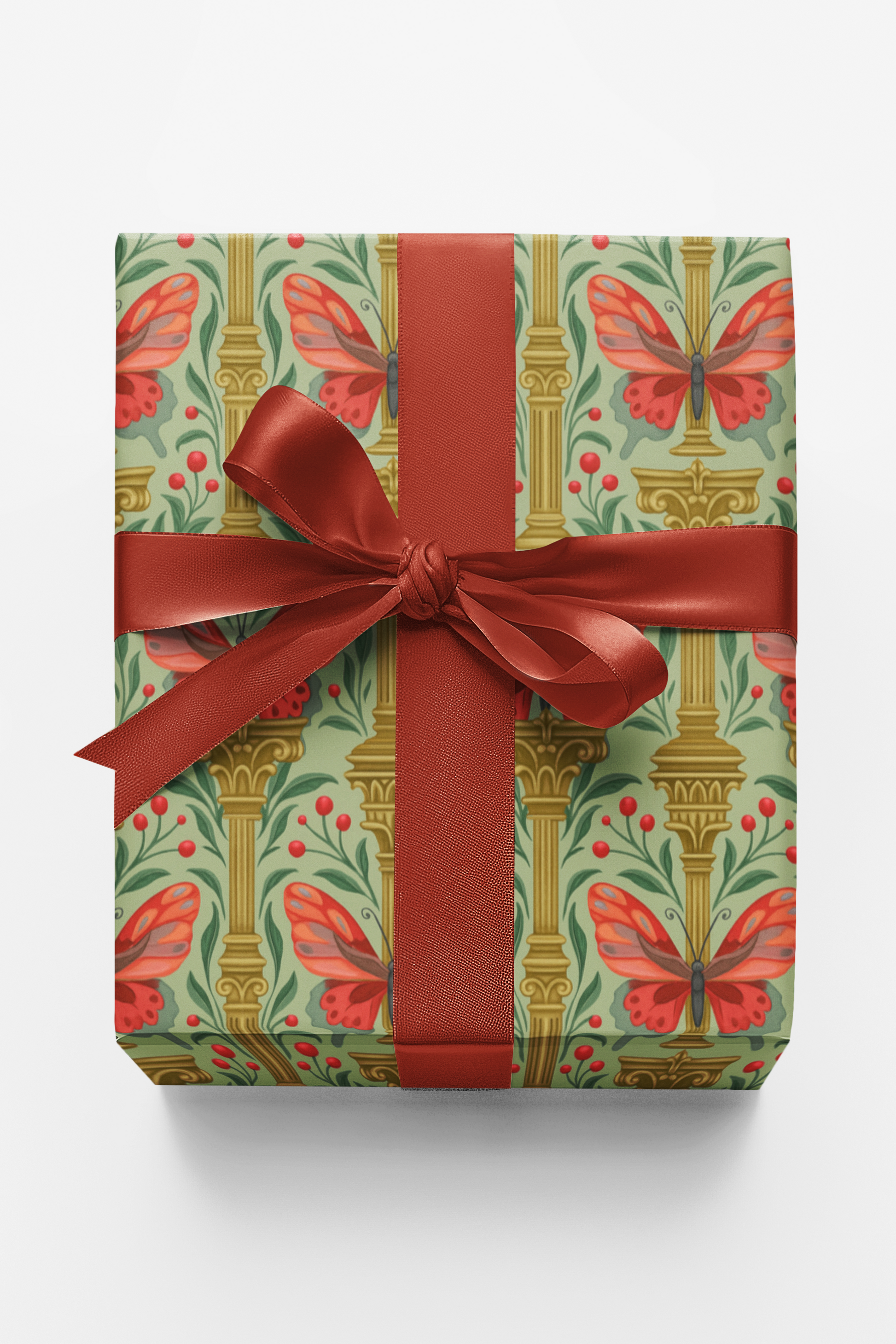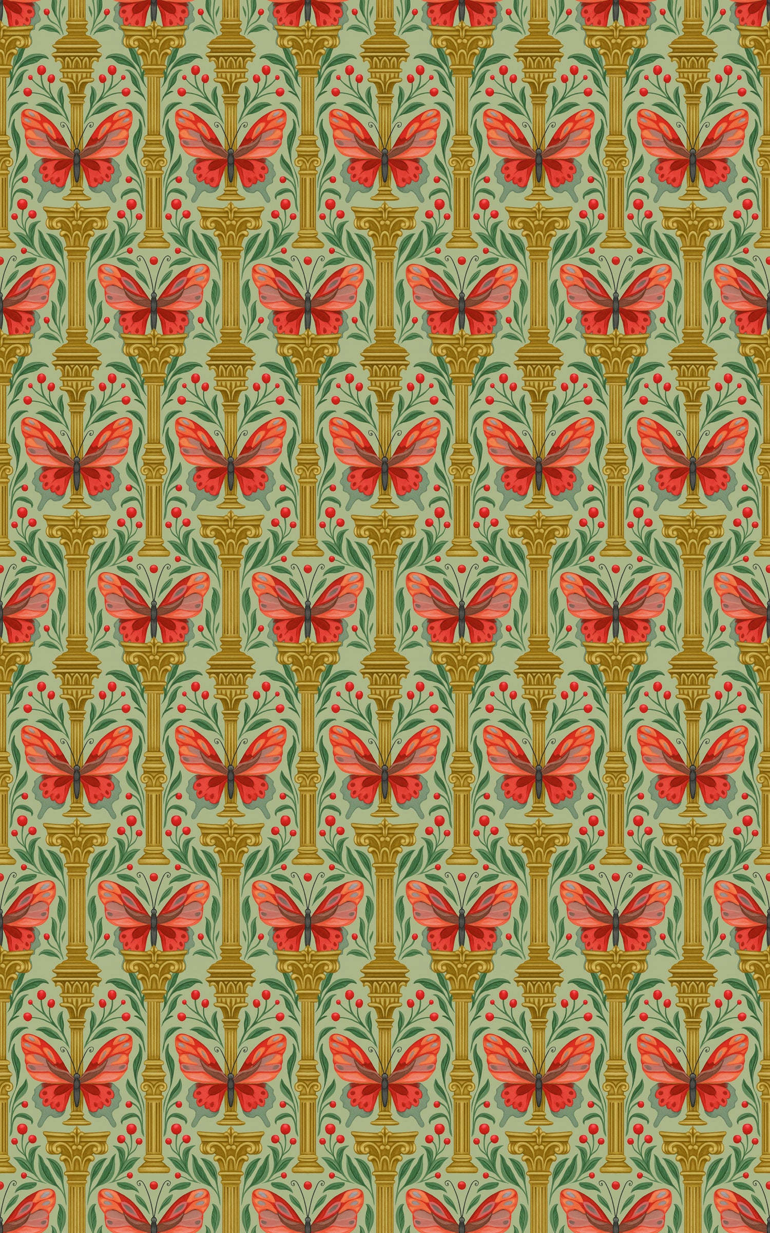 Awash in warm golds and fluttering reds, this pattern lifts the spirit like a garden caught mid-transform. Regal pillars rise like ornate guardians while butterflies perch upon them, glowing with soft, sun-kissed vibrance. Their wings unfurl in delicate symmetry, each curve echoing nature’s quiet poetry. This design celebrates elegance in motion—where architecture meets wild beauty, and every repeating motif whispers of grace, wonder, and a world gently held aloft on butterfly wings.
