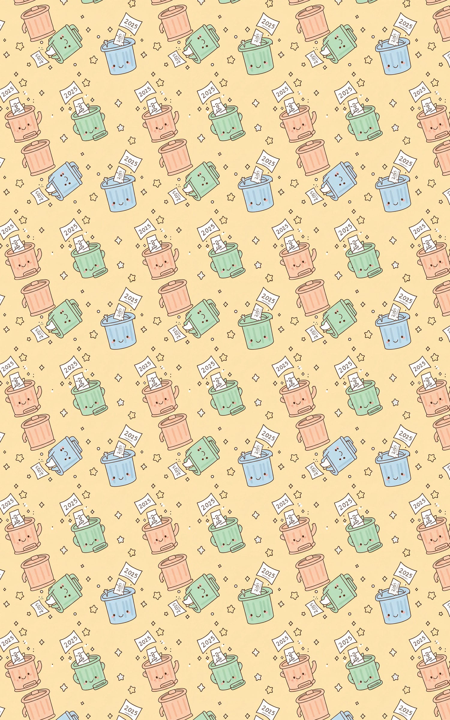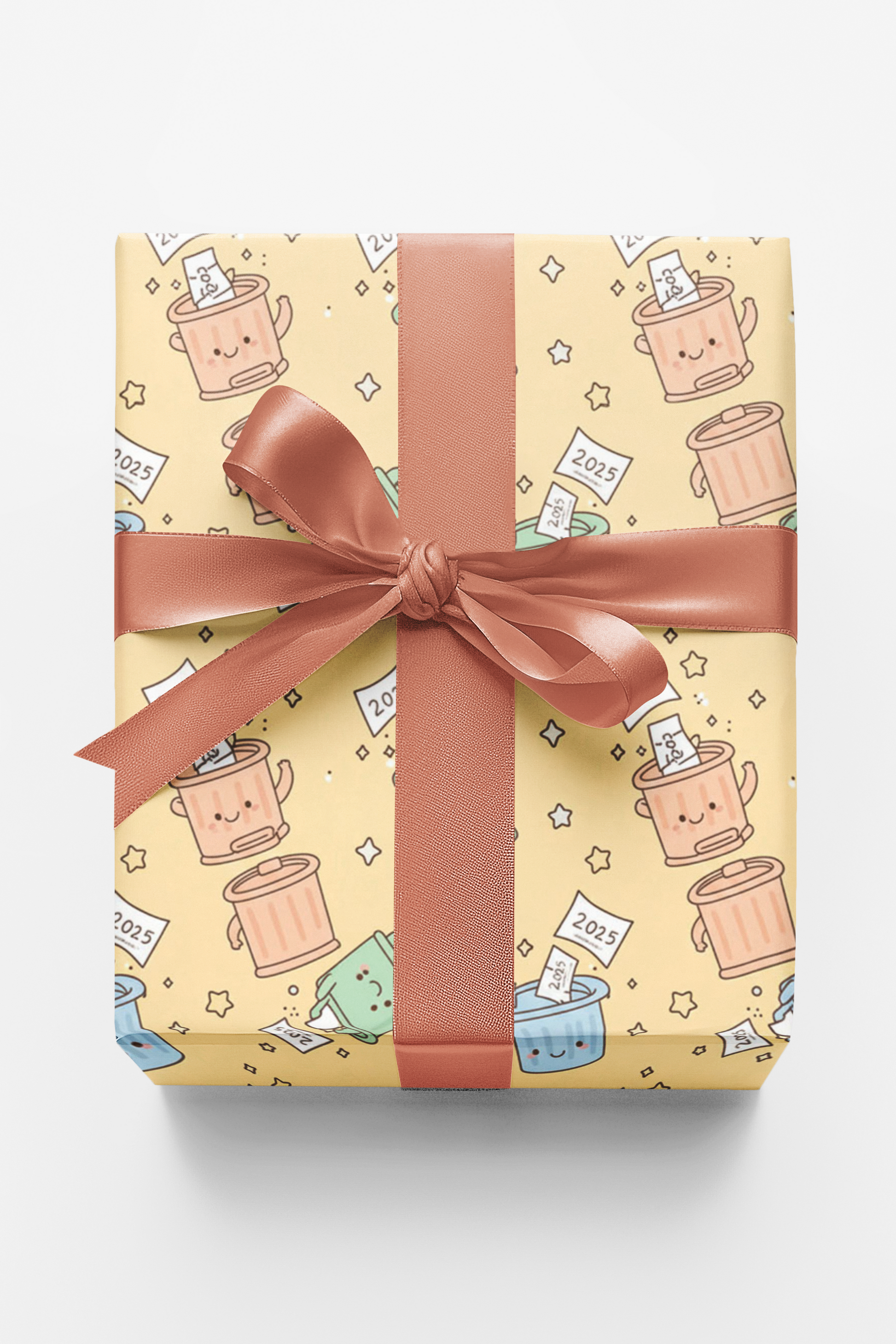 Send off the year with a smile using our Bye-Bye 2025 wrapping paper! This adorably cheerful design features a seamless pattern of cute, hand-drawn kawaii trash bins happily tossing out crumpled calendar pages labeled '2025'. Surrounded by smiling stars and sparkles, the paper uses a soft, playful pastel palette of peach, mint, baby blue, and yellow. It's the perfect lighthearted, slightly sarcastic, and utterly cute way to wrap gifts for New Year's Eve, White Elephant exchanges, or for anyone who’s glad the year is over!