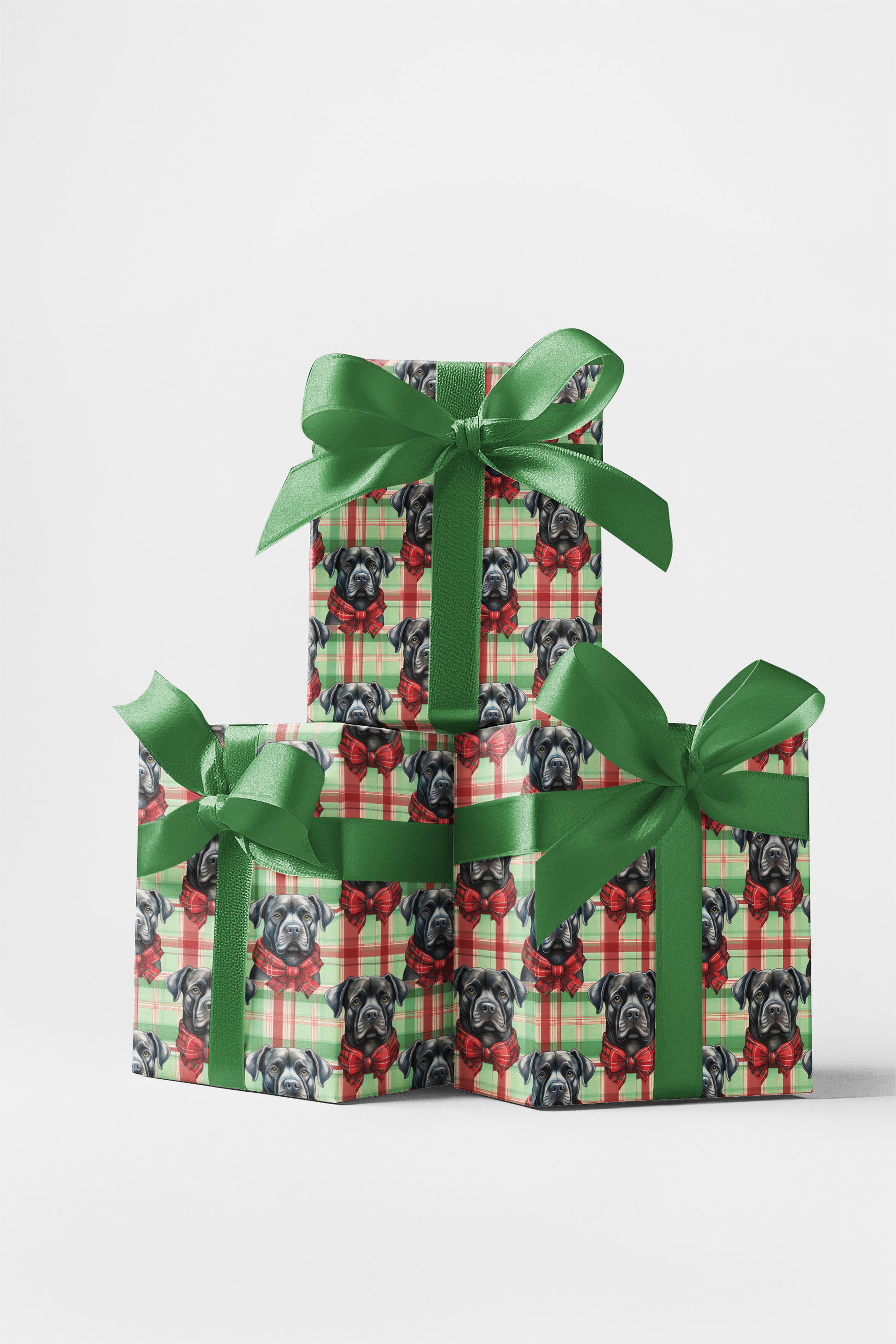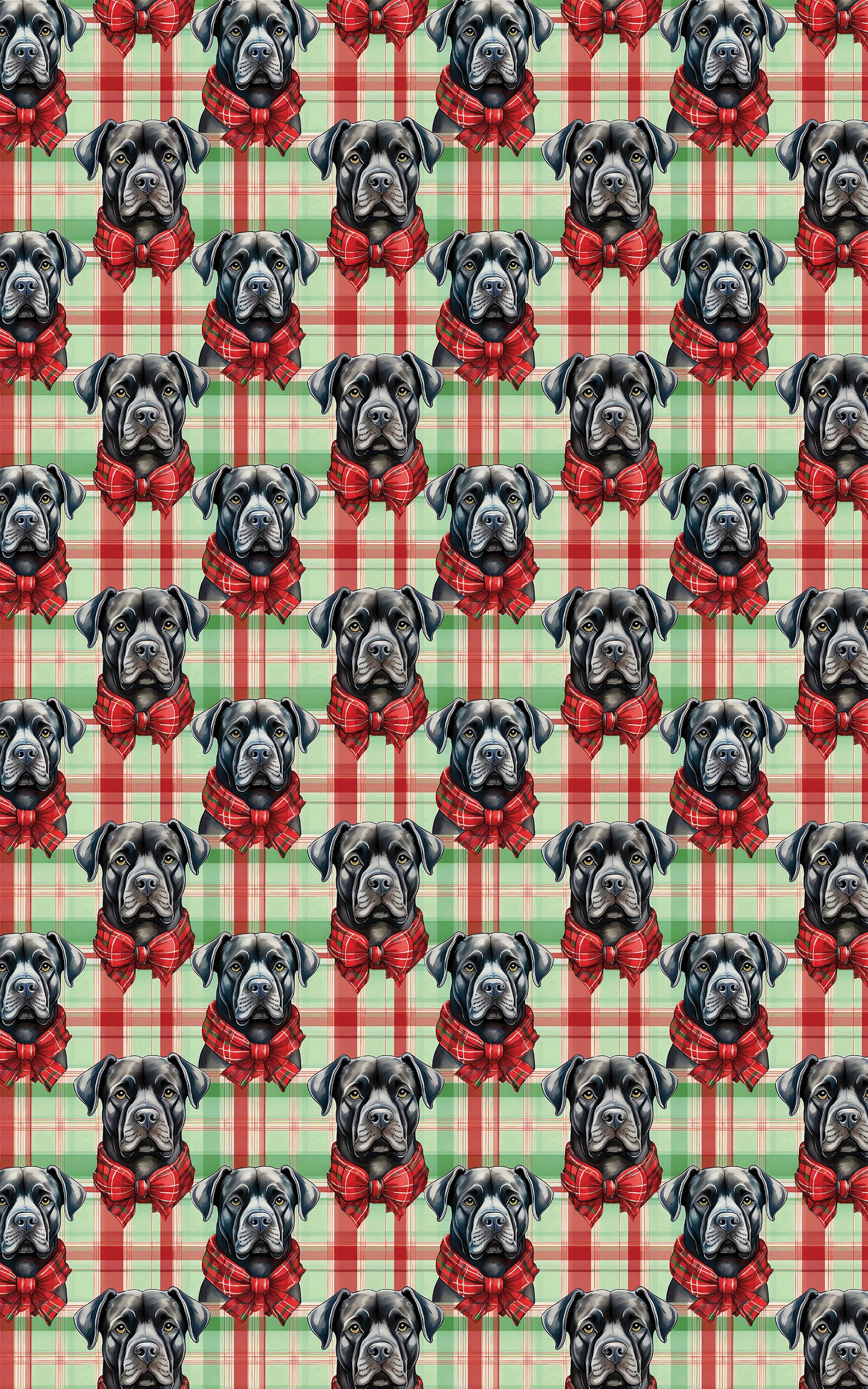 Celebrate the holidays in style with this charming wrapping paper featuring Cane Corsos wearing festive plaid scarves and bows. Illustrated in watercolor and set against a classic red and green plaid background, this seamless pattern combines warmth, cheer, and sophistication. Evenly spaced for a polished look, it’s perfect for holiday gifts, seasonal décor, or adding a joyful touch to any celebration.