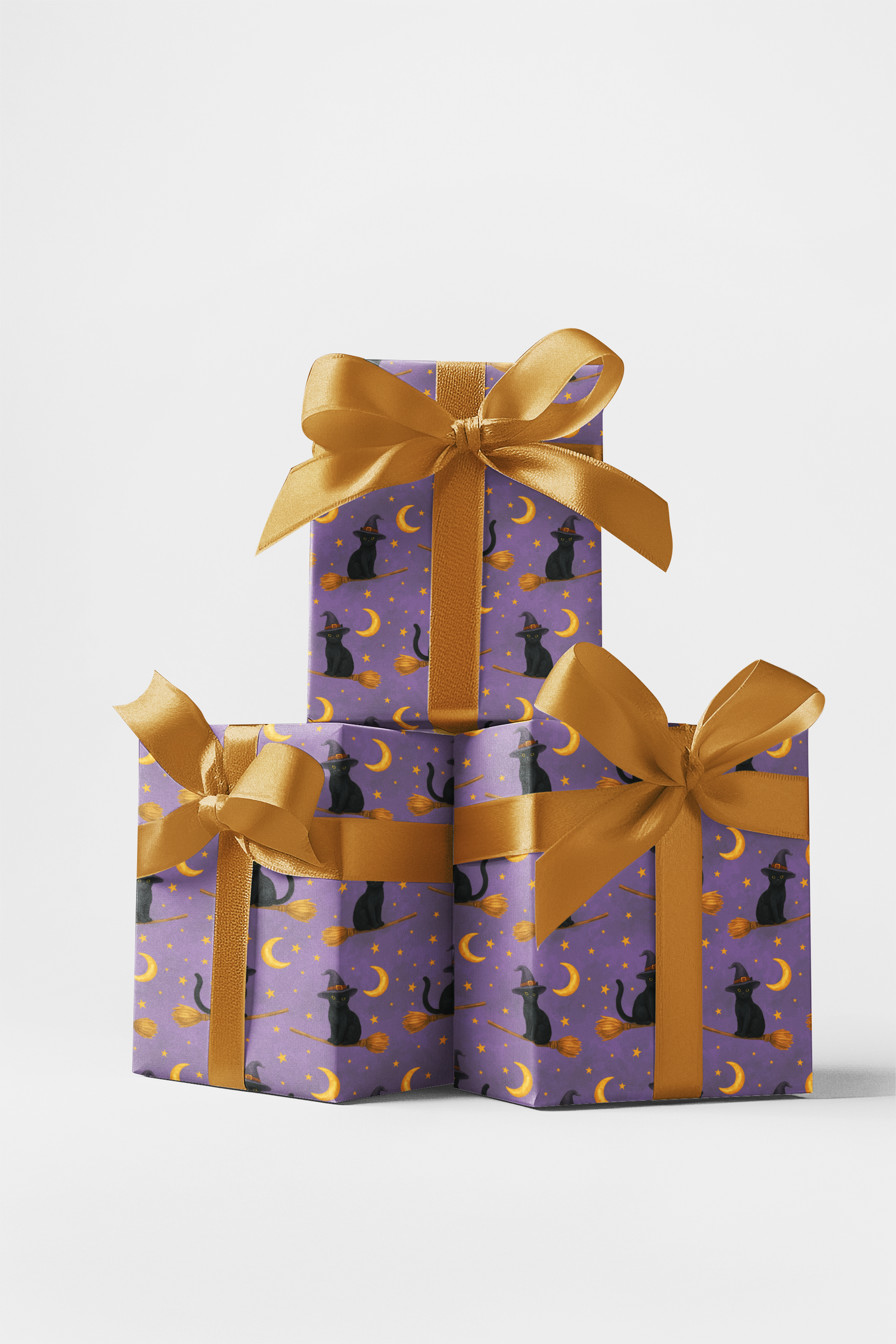 Add a touch of Halloween magic to your gifts with this charming design. Sleek black cats sit proudly upon their broomsticks, surrounded by glowing crescent moons and twinkling golden stars against a rich purple sky. This wrapping paper brings together mystery and whimsy, making it the perfect choice for enchanting gift-giving, Halloween parties, or anyone who loves a dash of celestial charm.