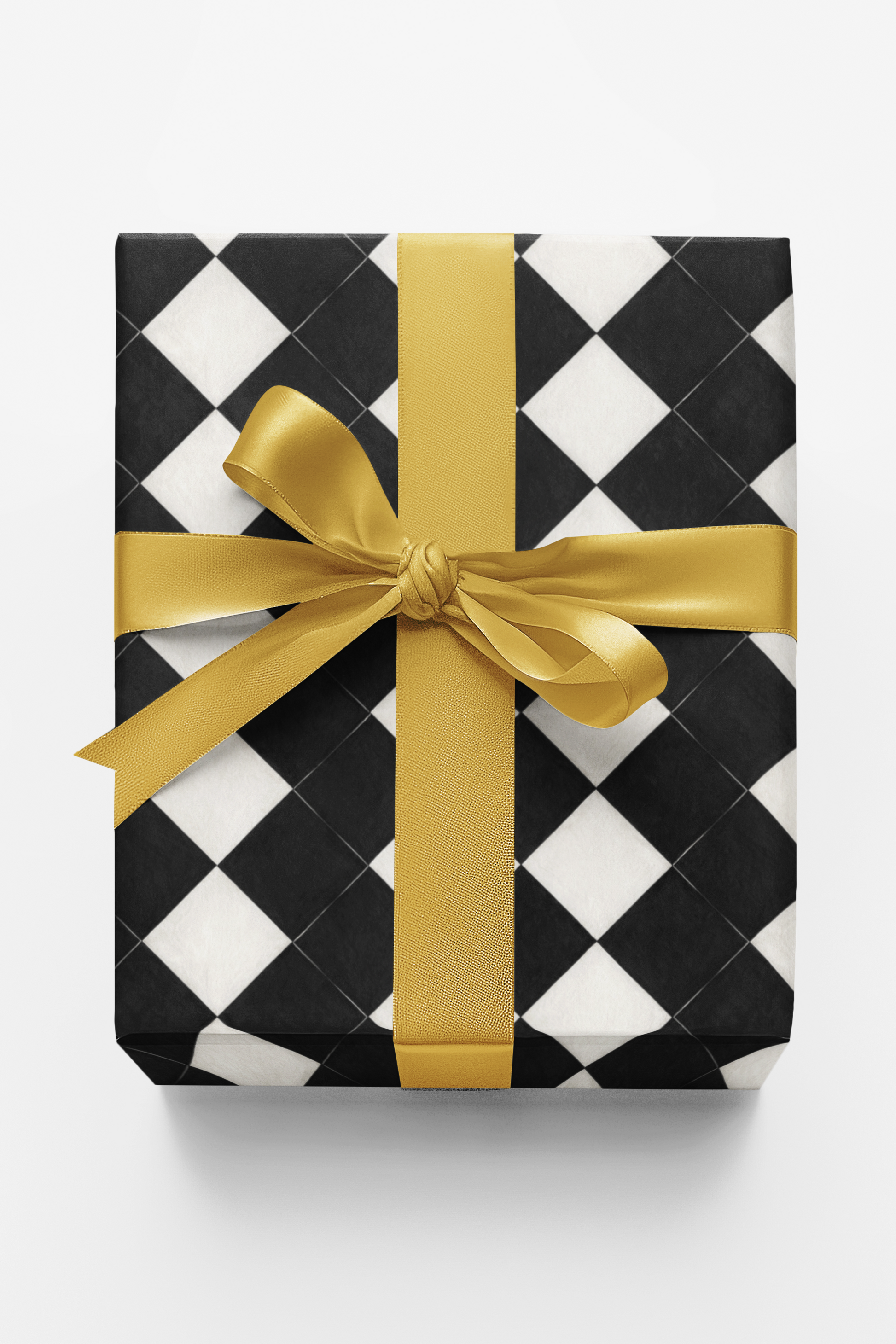 Bold yet timeless, Checkered Chic turns classic contrast into modern sophistication. Crisp black and white diamonds create a rhythm of balance and confidence—where simplicity meets striking design. Each fold feels effortlessly stylish, echoing the elegance of vintage fashion and the edge of contemporary art. This design celebrates poise and personality, wrapping every gift in a perfect harmony of minimalism and bold expression.