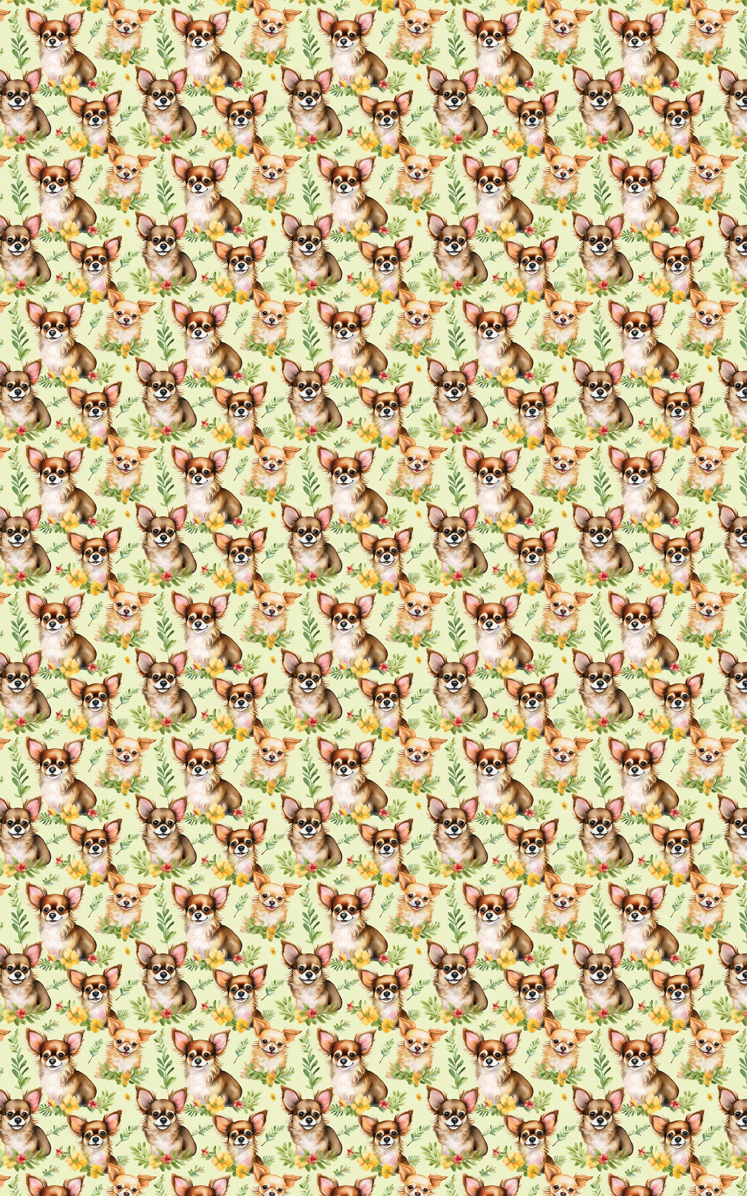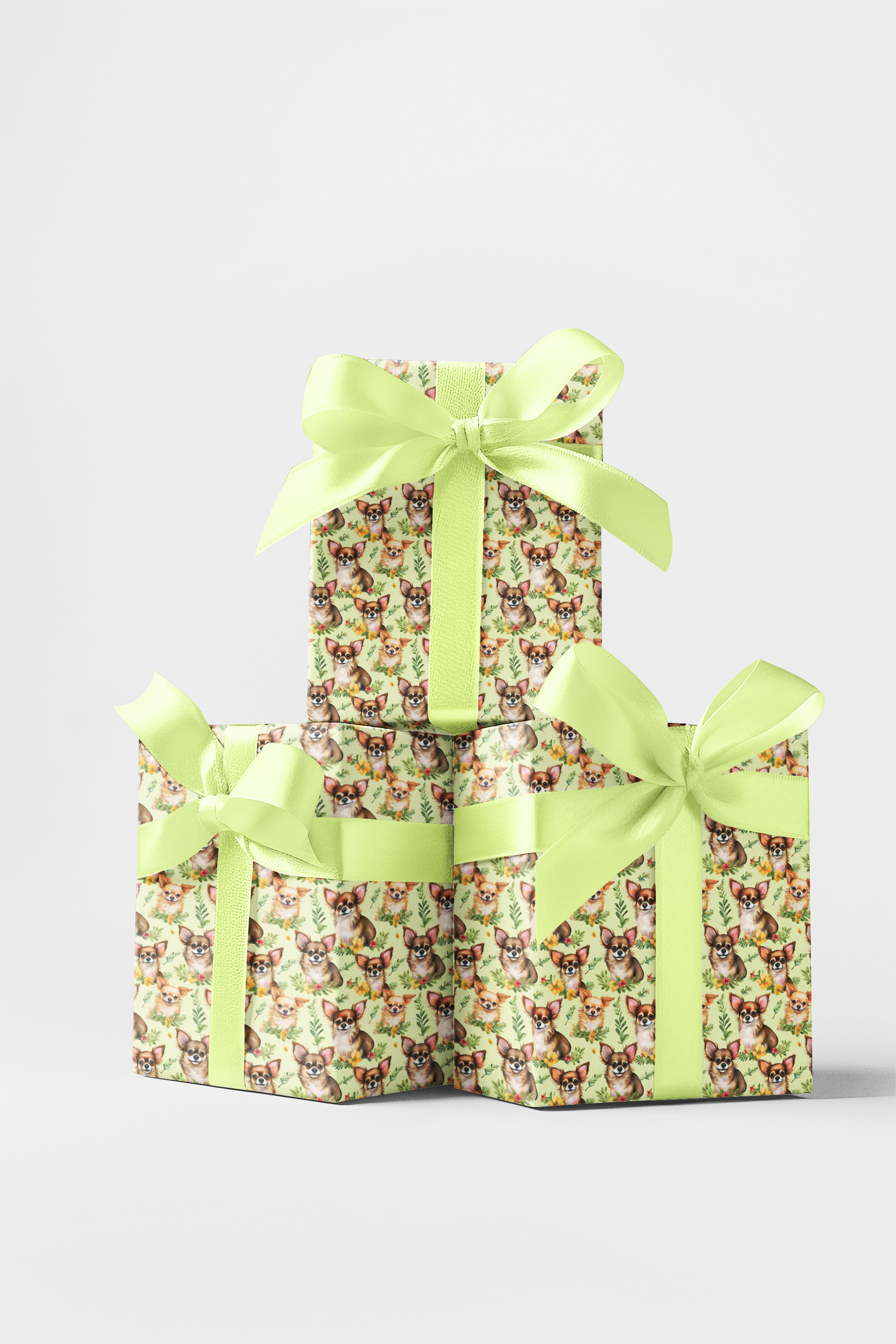 Wrap your gifts in pure joy with our Chihuahua Charm! This charming design features adorable Chihuahuas in soft watercolor tones of brown, tan, and cream, surrounded by lush green leaves and tiny yellow flowers on a pale green background. Warm, playful, and full of personality, it’s the perfect choice for dog lovers and any special occasion.