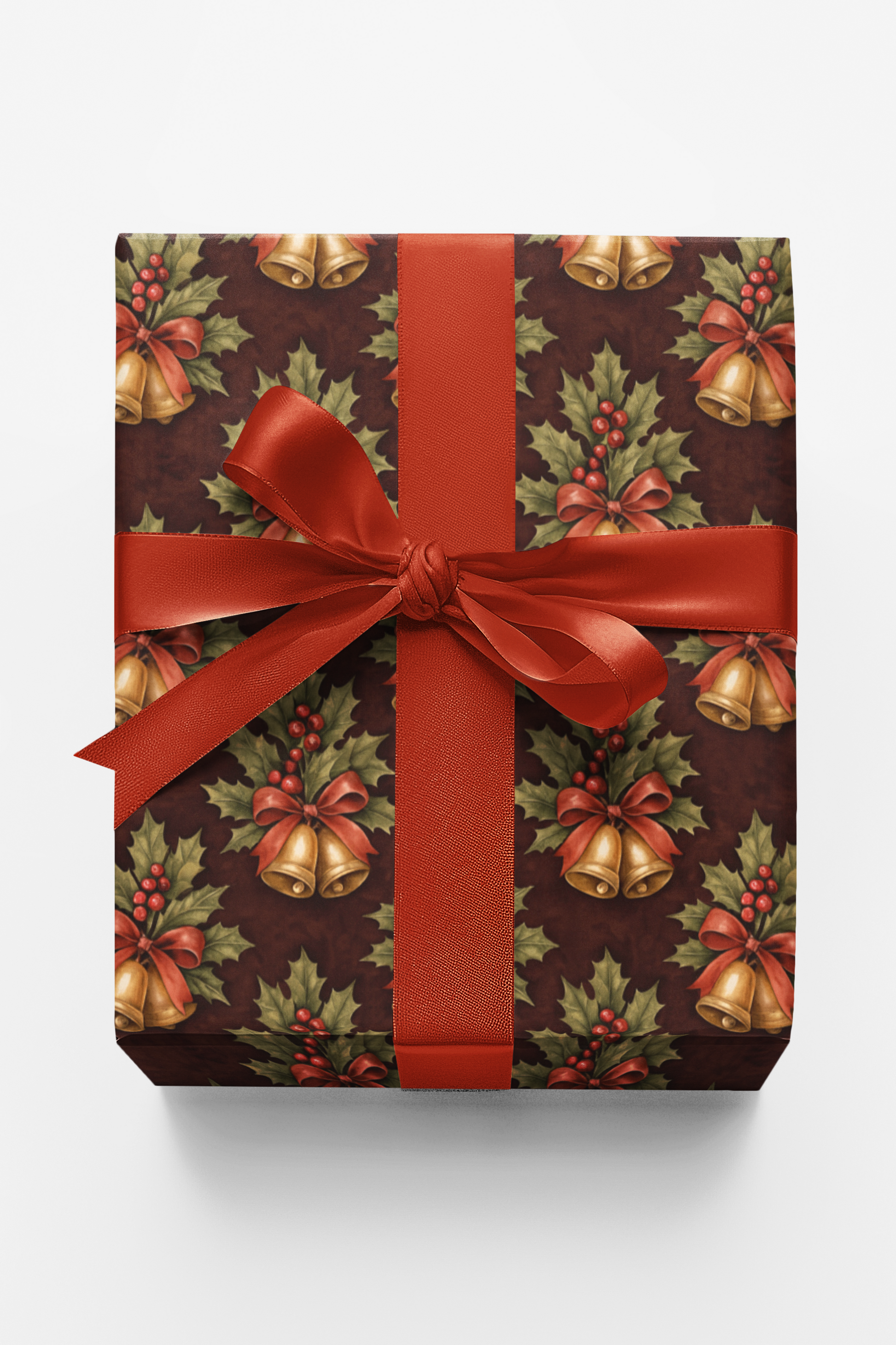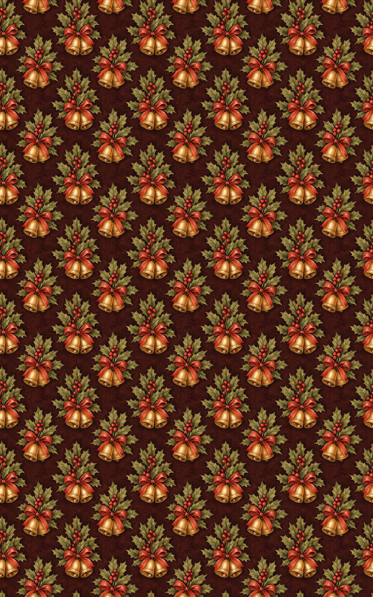 Glowing with golden warmth, this festive design rings with the charm of vintage holiday cheer. Clusters of shining bells, wrapped in rich red ribbons and nestled among deep green holly, shimmer like treasured ornaments against a cozy, wine-toned backdrop. Each illustration feels hand-painted with nostalgia and joy, capturing the magic of Christmas traditions that echo through generations. This design celebrates the season’s spirited harmony—where every fold carries a glint of timeless charm, and every glance feels like hearing holiday bells chime in the winter air.