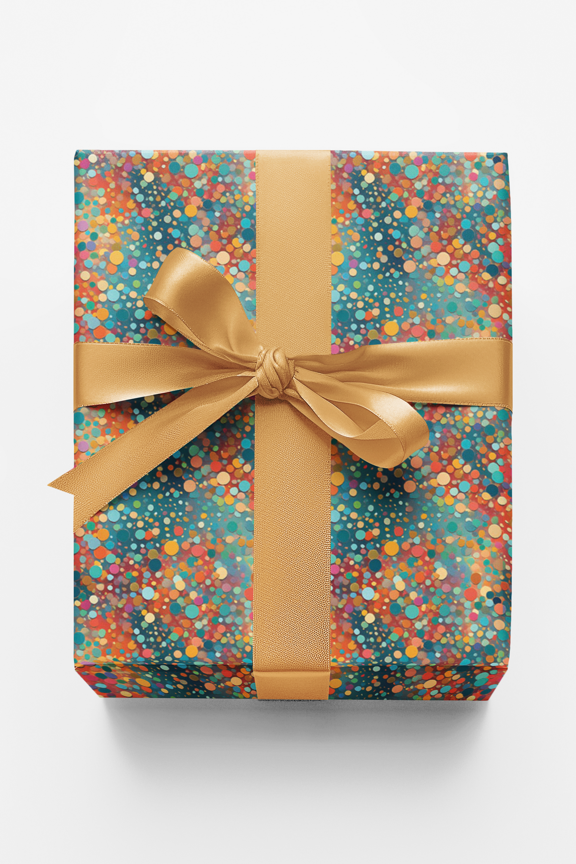 Make every gift feel like a celebration with our Confetti Chic wrapping paper. This stunning, abstract design features a vibrant scatter of multi-sized dots in a rich, jewel-tone palette of teal, magenta, orange, and gold. The pattern is dynamic, with the circles appearing to float over a subtly blended background, giving the impression of textured paint or shimmering foil confetti. Perfect for modern birthdays, festive holidays, creative baby showers, or any occasion that calls for a bold, artistic, and sophisticated touch.