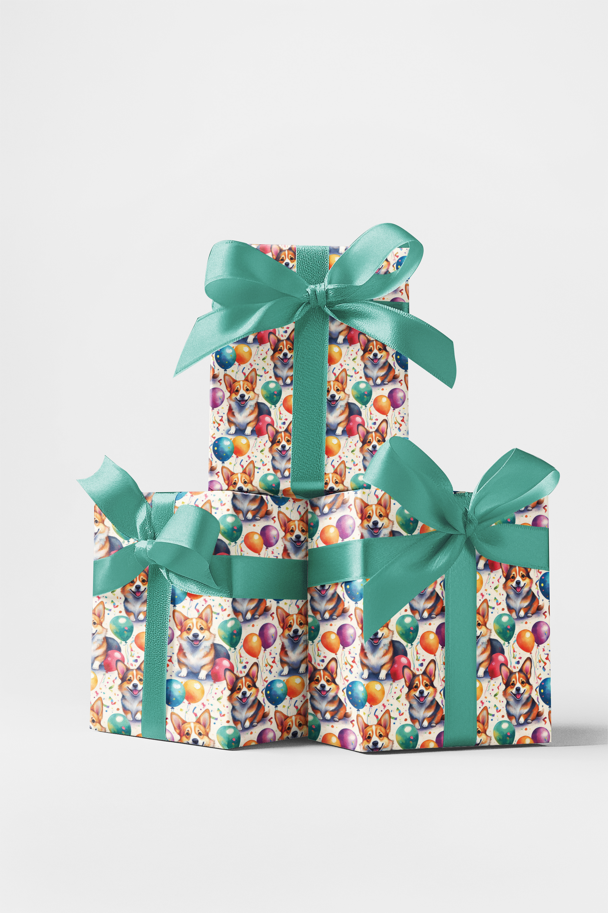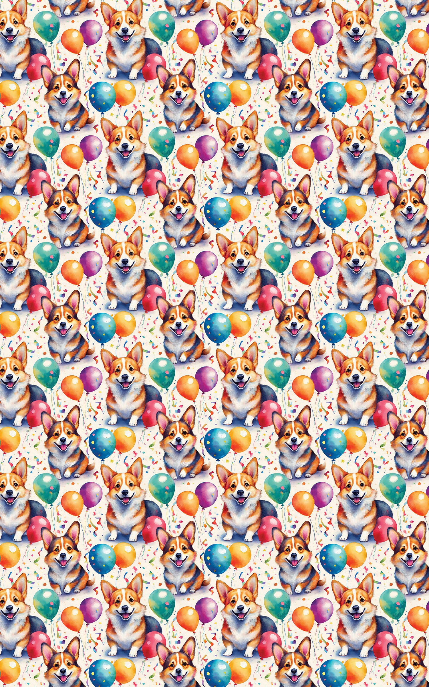 These playful pups are floating into the party with colorful balloons and big birthday energy! Repeating watercolor of cheerful Corgis are arranged with balanced spacing, accented by tiny confetti for an extra dose of charm. This festive pattern captures the joy of celebrations on four legs—perfect for wrapping gifts that deserve a wag, a smile, and a little tail-wagging cheer. Because let’s face it—no one does birthdays quite like a Corgi!