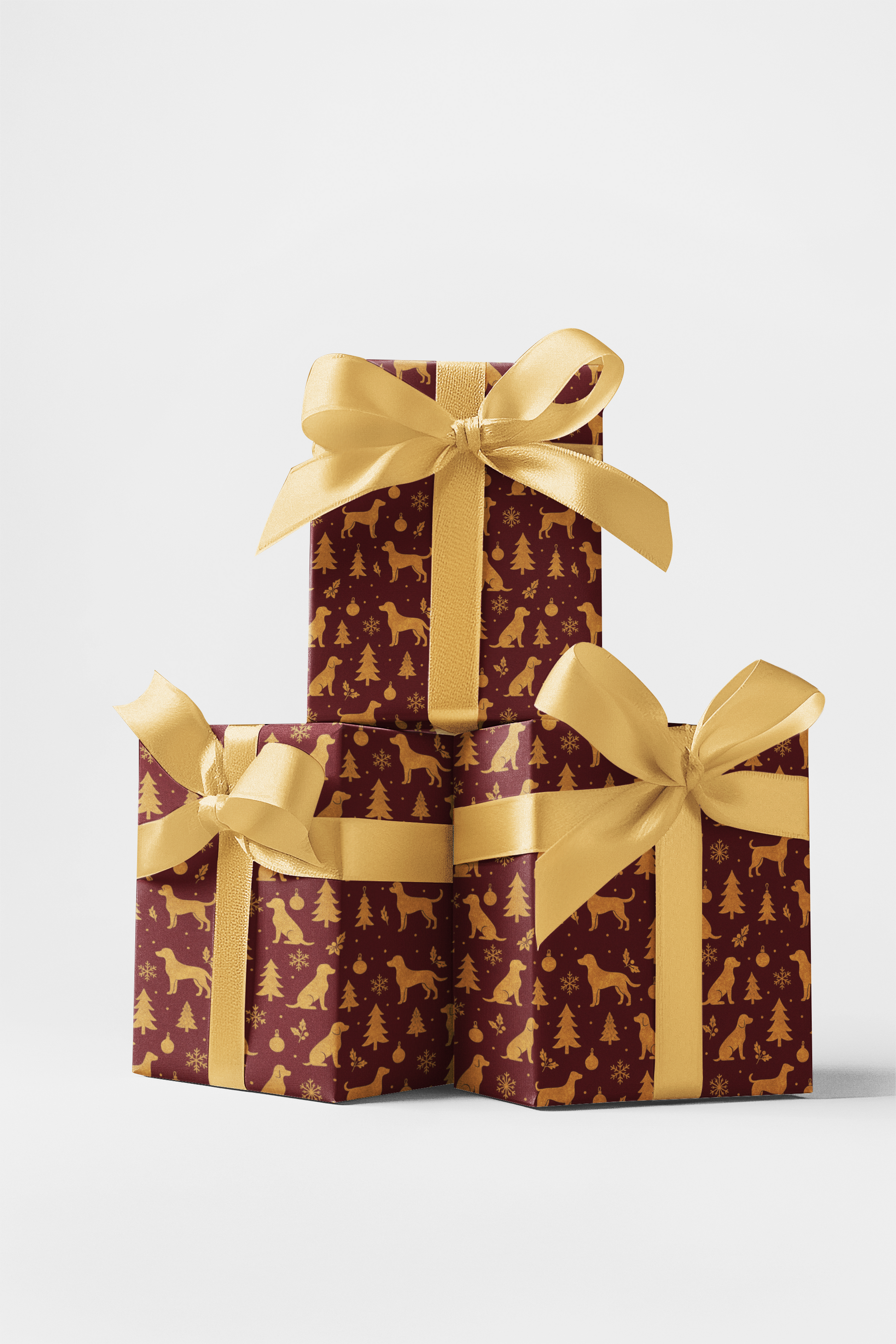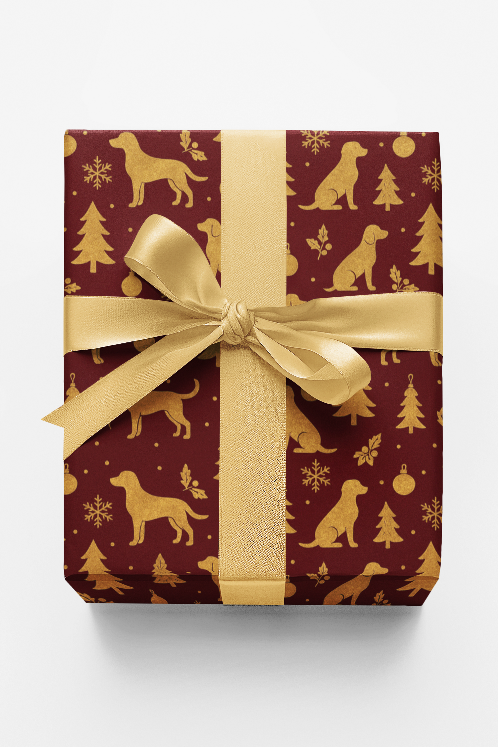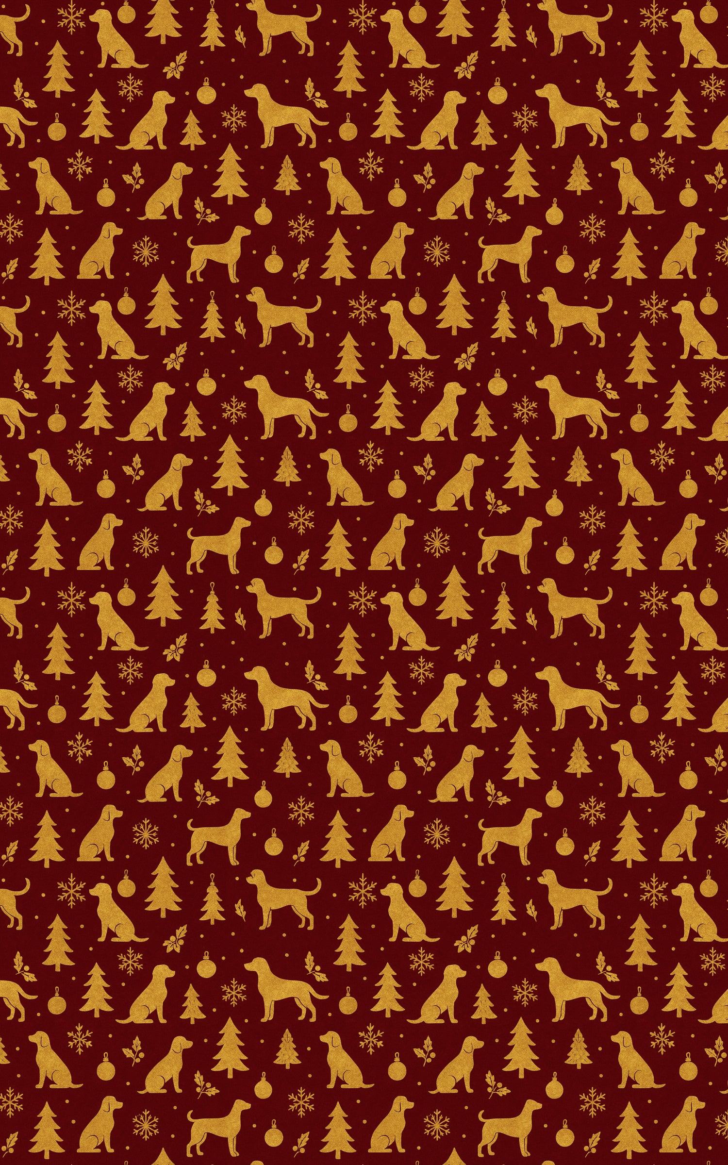 Wrapped in rich elegance and festive spirit, Crimson Canine brings golden charm to the heart of the holidays. Silhouettes of loyal dogs gleam against deep red, surrounded by snowflakes, evergreens, and ornaments that shimmer with timeless warmth. This design celebrates joy, devotion, and the beauty of the season—where every fold glows like a fireside evening, and every gift carries the golden glow of holiday cheer shared with our favorite four-legged friends.
