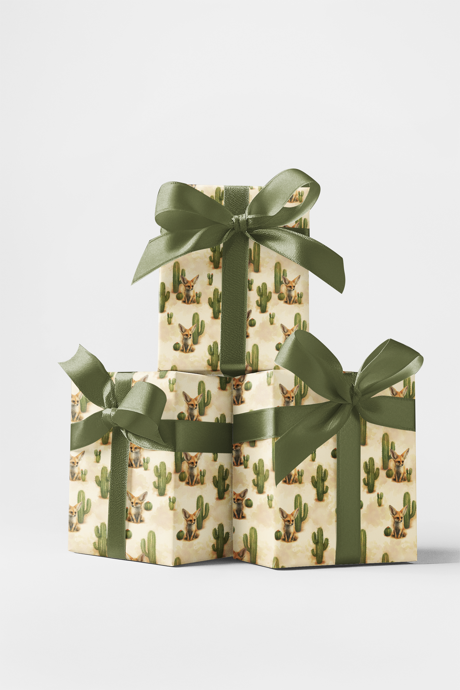 Bring a touch of desert magic to your gifts with this adorable wrapping paper featuring sweet foxes nestled among watercolor cacti and desert blooms. Illustrated in soft, sun-washed tones of sage green, sandy beige, and warm golden accents, this seamless design feels playful, gentle, and full of southwestern charm. Perfect for birthdays, baby showers, kids’ gifts, or everyday wrapping, it adds a cozy, nature-inspired touch that’s both whimsical and stylish.
