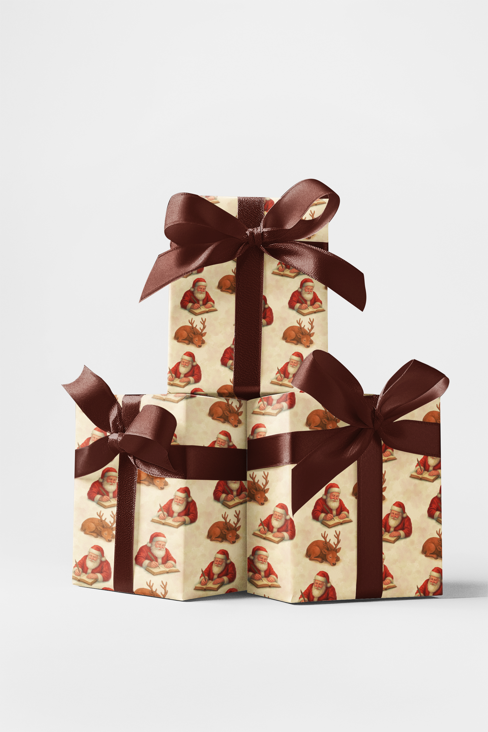 Claus for Reflection Between cookie breaks and toy-making chaos, he’s busy journaling his holiday thoughts while his trusty reindeer sneaks in a snooze. This whimsical wrapping paper is perfect for gifts that celebrate cozy vibes, quiet moments, and a dash of holiday humor. Wrap your presents with a reminder that even the busiest Claus makes time to reflect (and nap).