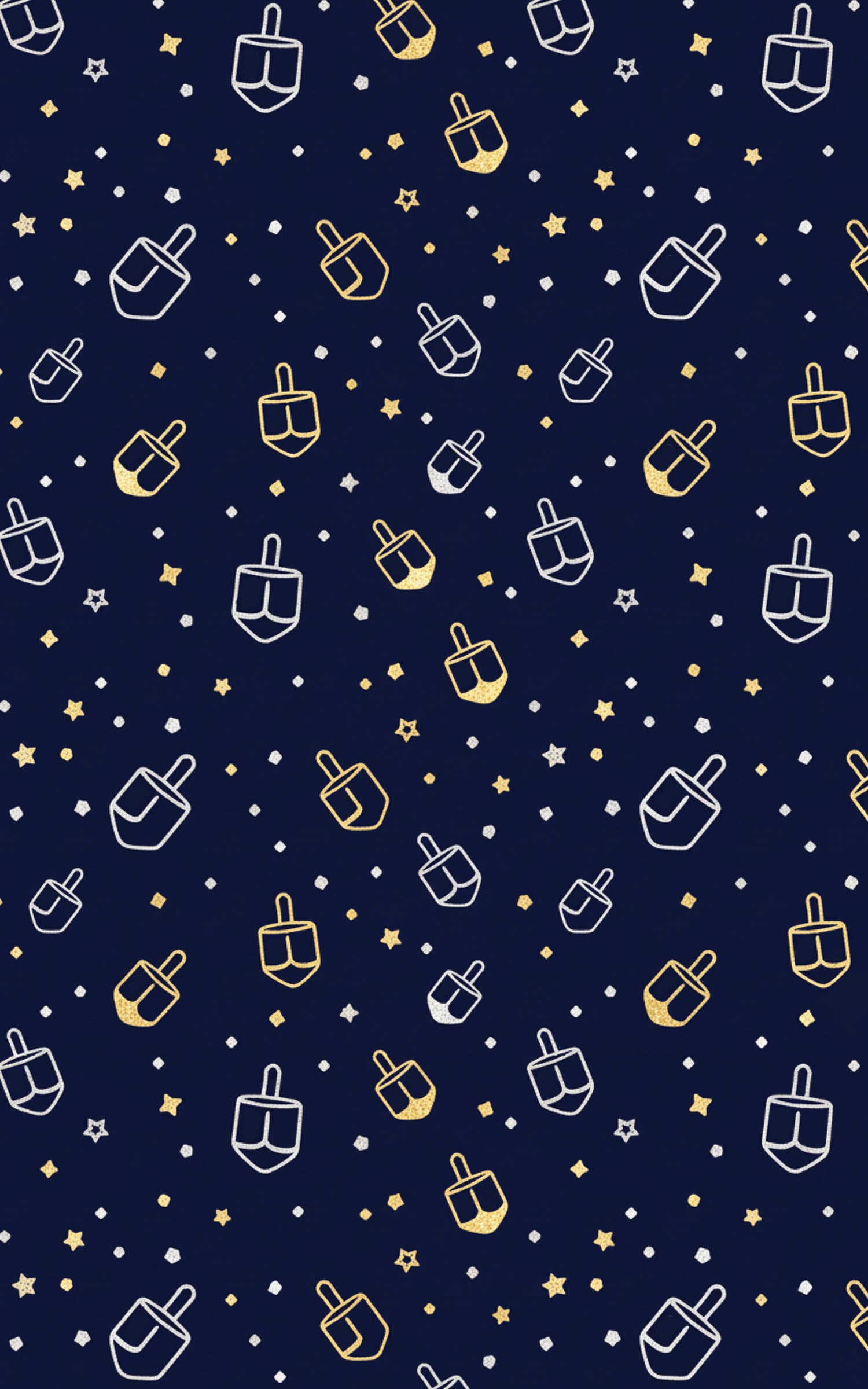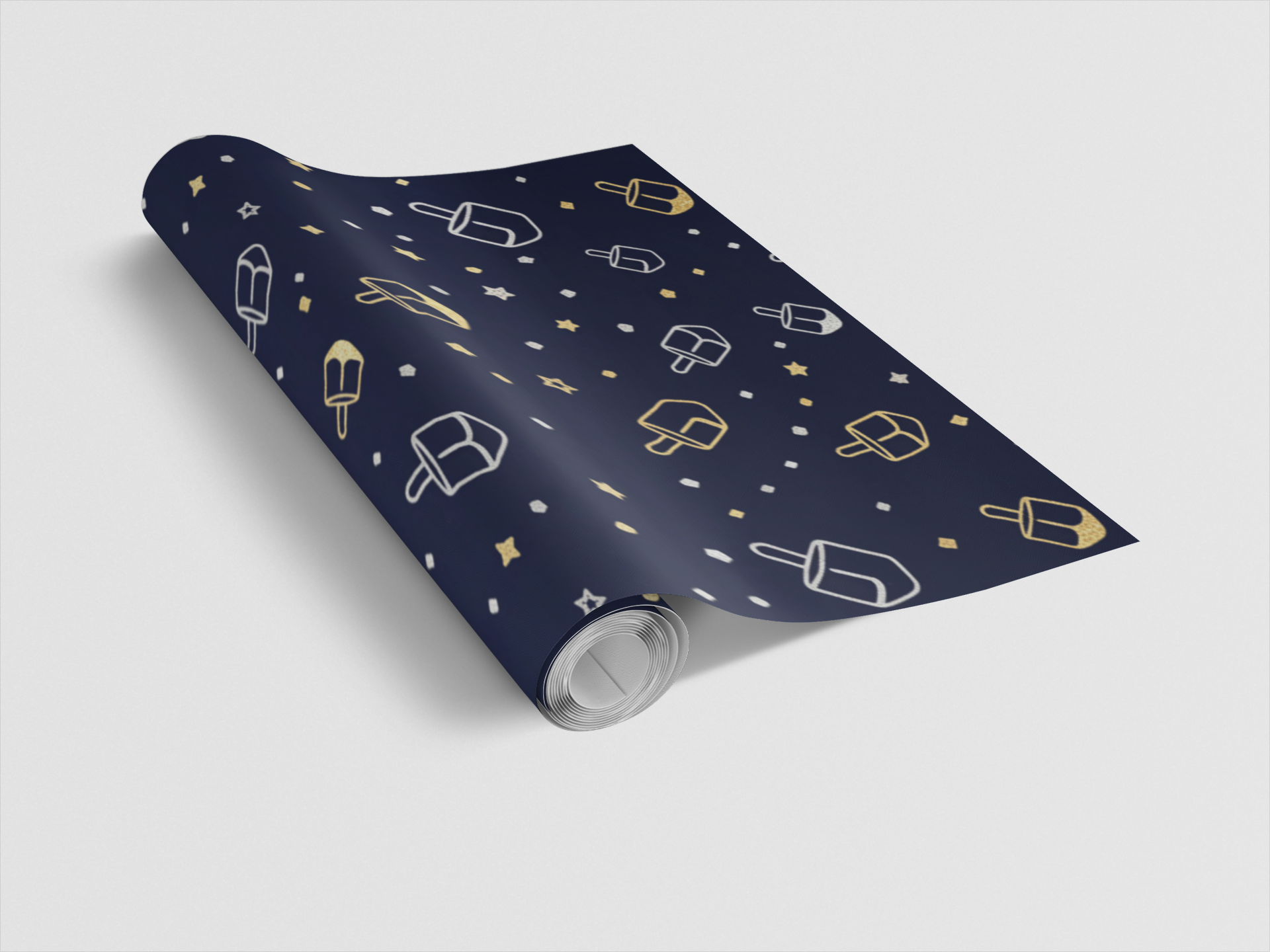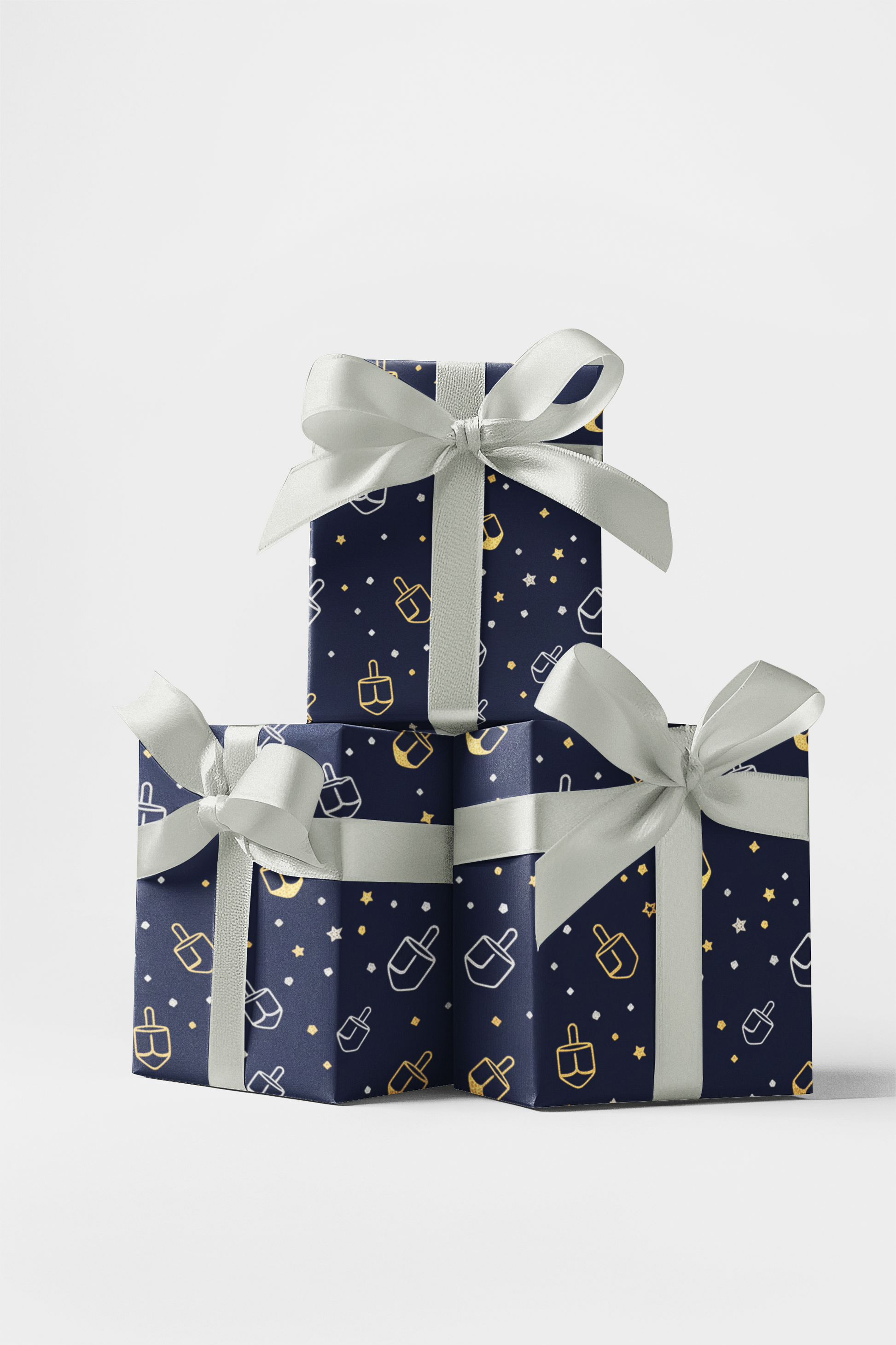 Wrap your gifts in the sparkle of the season with our Dreidel Dots wrapping paper! This elegant, seamless pattern features stylized dreidels and Stars of David, rendered in shimmering metallic gold glitter texture and clean white outlines. The pattern is set against a rich, sophisticated dark navy blue background, making the golden elements truly stand out. It is the perfect choice for celebrating all eight nights of Hanukkah, bringing a beautiful, festive, and luxurious look to your holiday gifts.