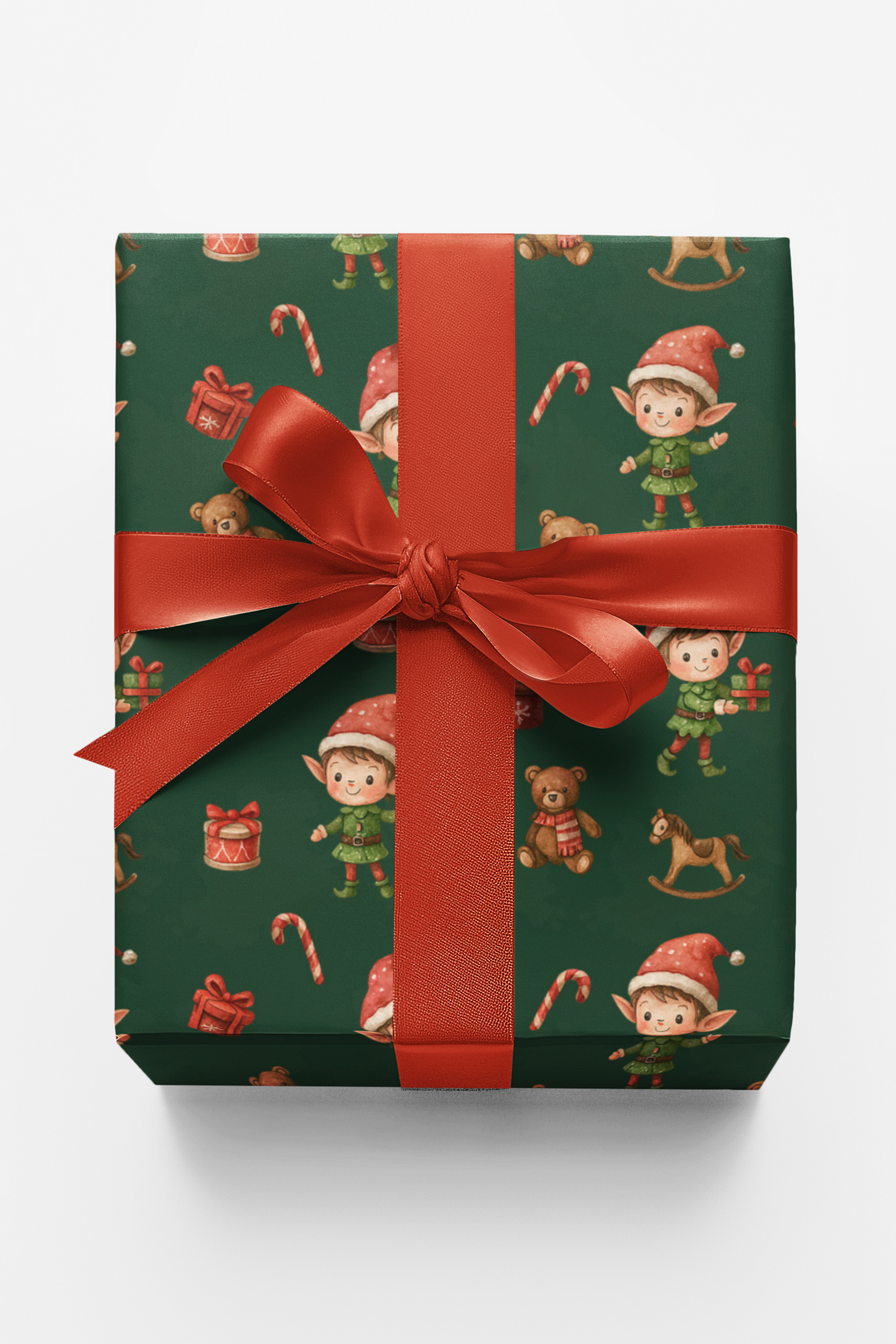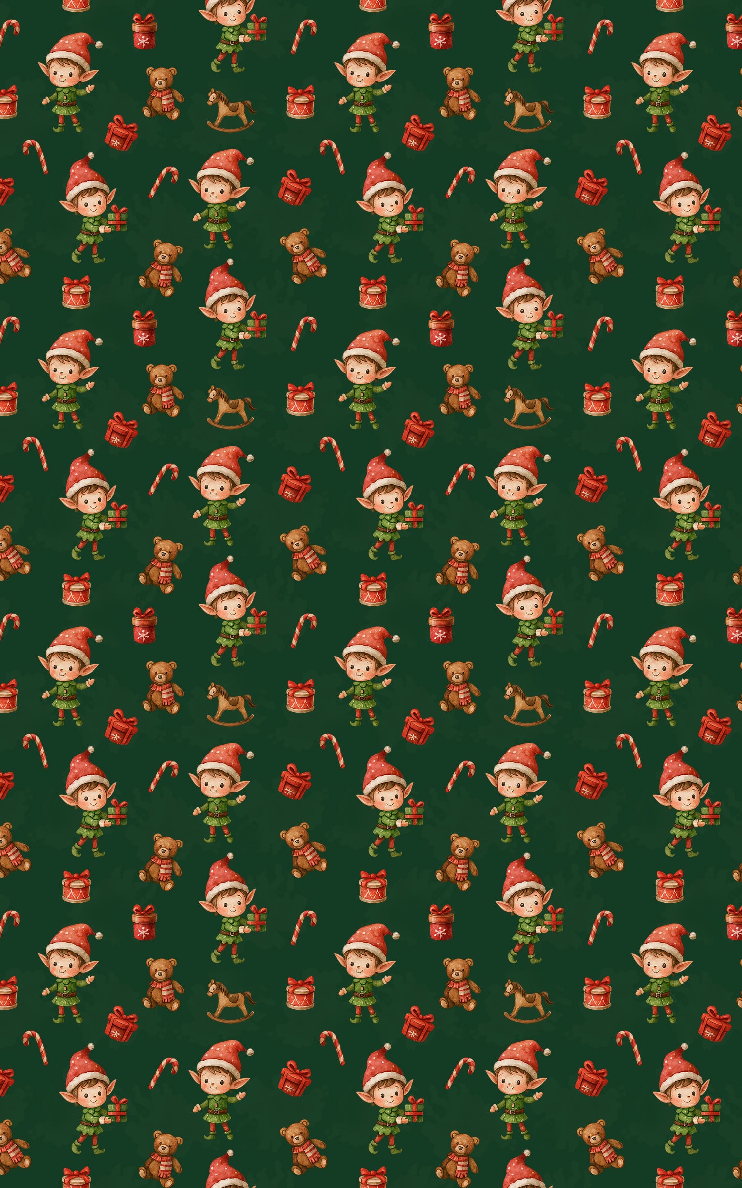 Bursting with hand-painted cheer, this merry pattern brings the magic of Santa’s workshop to life. Playful elves dance across a deep green backdrop, their rosy cheeks and bright gifts glowing with holiday joy. Scattered among them, candy canes, toys, and ribbon-tied presents add a sprinkle of nostalgic wonder—each detail a tiny spark of North Pole charm. Elf Workshop Icons celebrates the whimsy and warmth of Christmas crafting, where every fold feels like unwrapping a story, and every glance carries the delightful mischief of a bustling elf workshop.