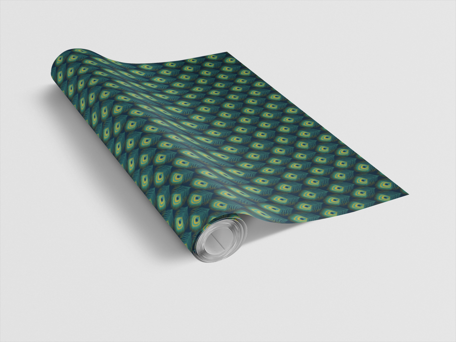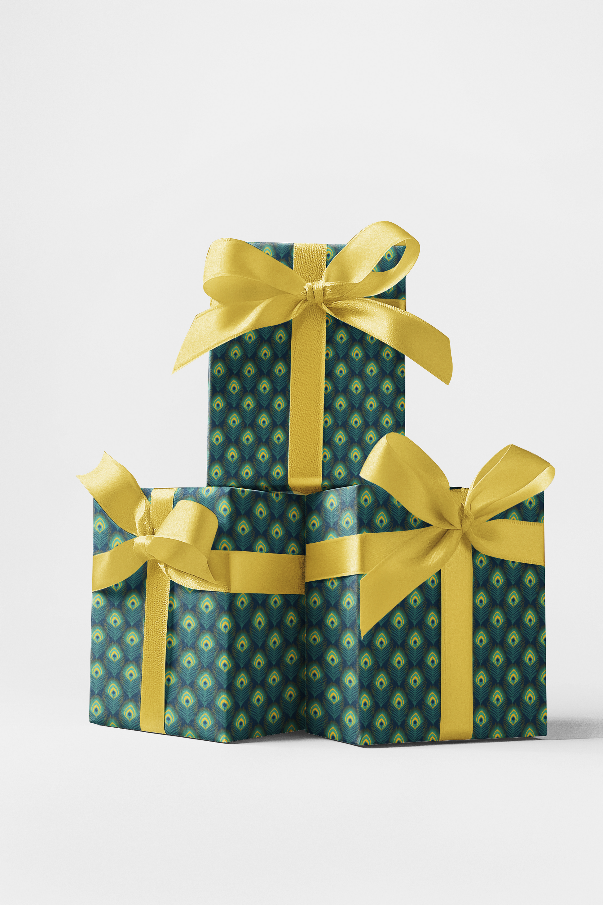 Drenched in deep sapphire and golden green, Emerald Plume unfurls like the proud fan of a peacock in full splendor. Each feathered eye shimmers with mystique—an intricate dance of light, luxury, and allure. The pattern radiates confidence and grace, celebrating the art of standing tall and shining bright. Every fold glows with regal energy, every gift wrapped in it becomes a statement of sophistication—where elegance meets enchantment in a timeless display of beauty and boldness.