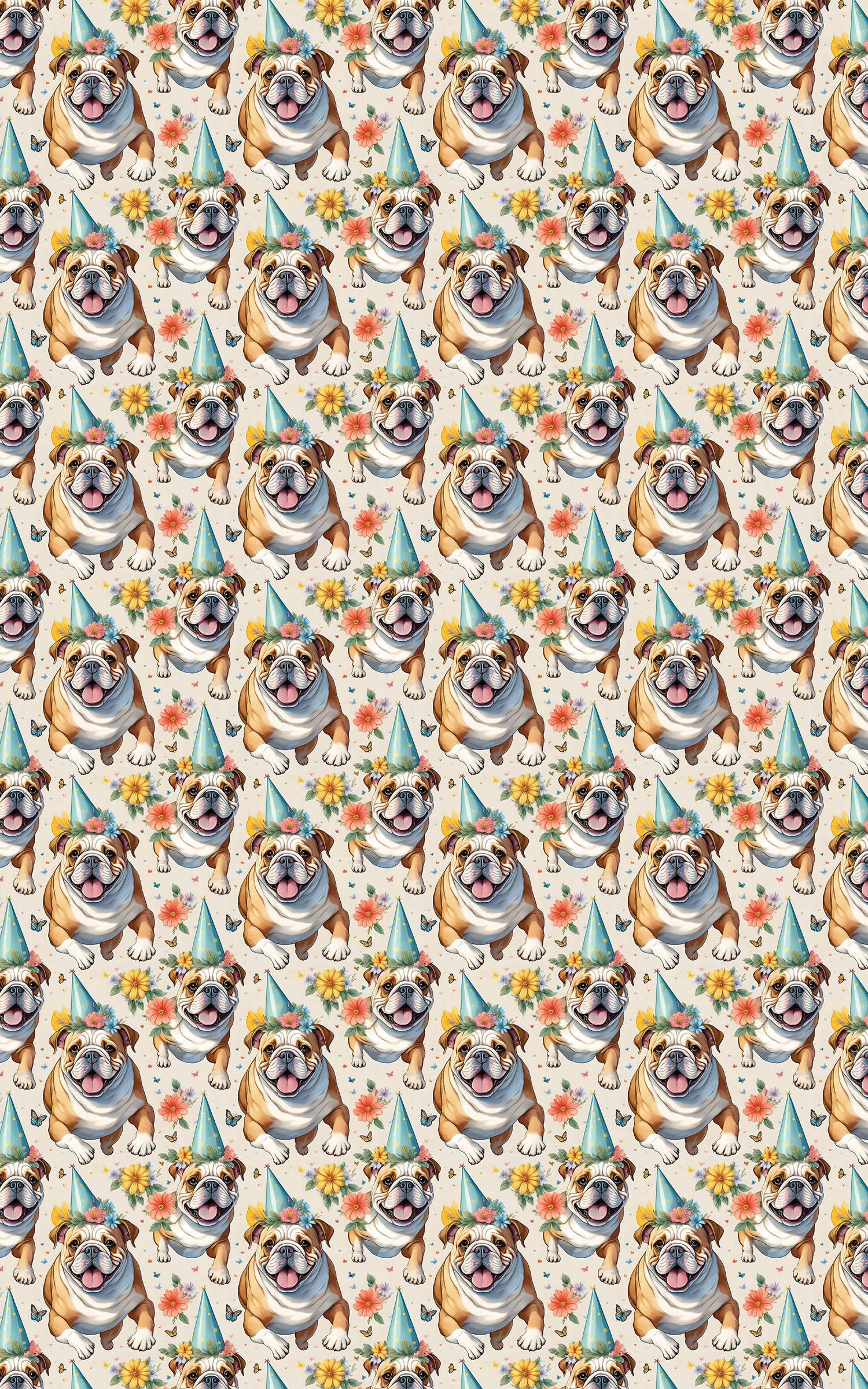Celebrate in style with this delightful wrapping paper featuring cheerful English Bulldogs wearing charming garden party hats, surrounded by blooming flowers and fluttering butterflies. Illustrated in soft watercolor with gentle pastel hues on a light neutral background, this seamless pattern exudes a playful yet elegant feel. Perfect for birthdays, springtime celebrations, or any joyful occasion, it adds a touch of whimsy and warmth to every beautifully wrapped gift.