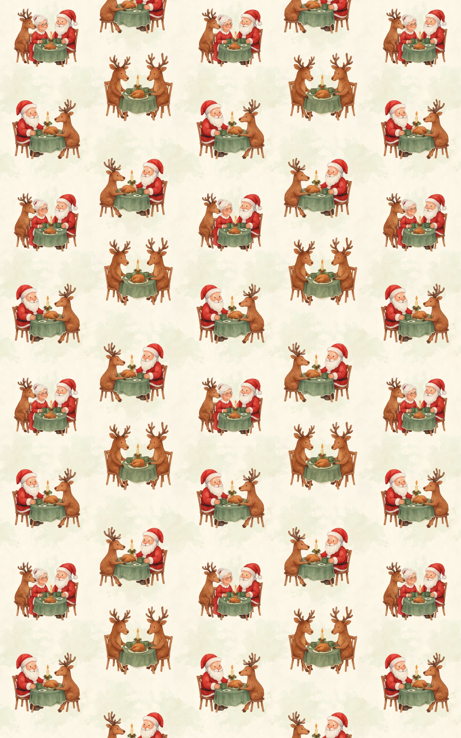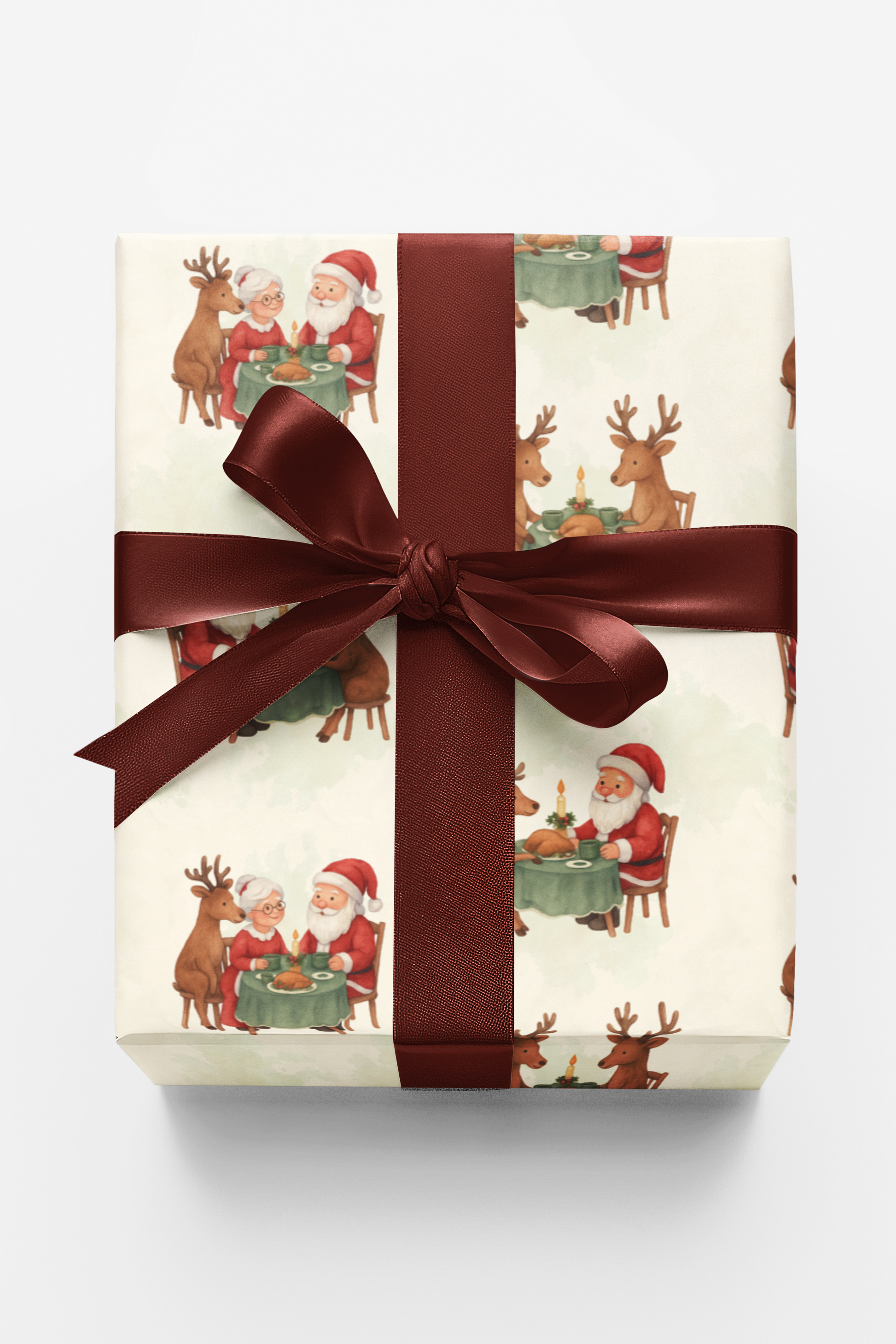 Christmas Feast & Fables Who says Christmas magic is only about gifts? Santa and his crew know the real joy comes from gathering around the table, candles lit, plates full, and hearts even fuller. Whether it’s reindeer etiquette (no antlers on the table, please!) or Mrs. Claus sneaking an extra bite, this festive pattern serves up holiday cheer with a side of giggles. Wrap your gifts in this design and you’ll have everyone hungry for Christmas spirit before the turkey’s even carved!
