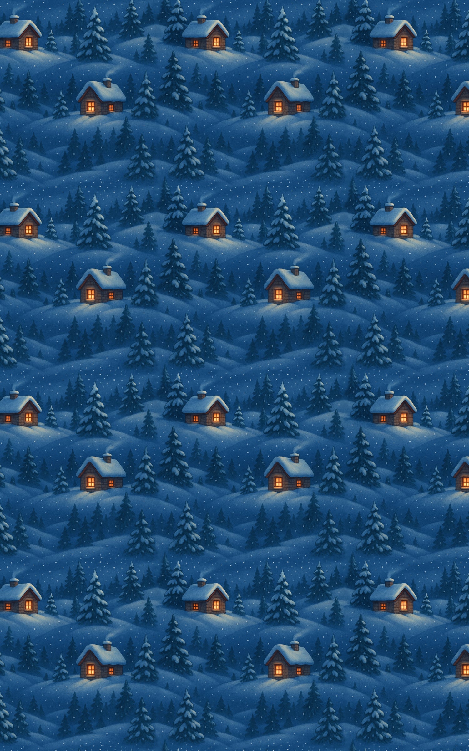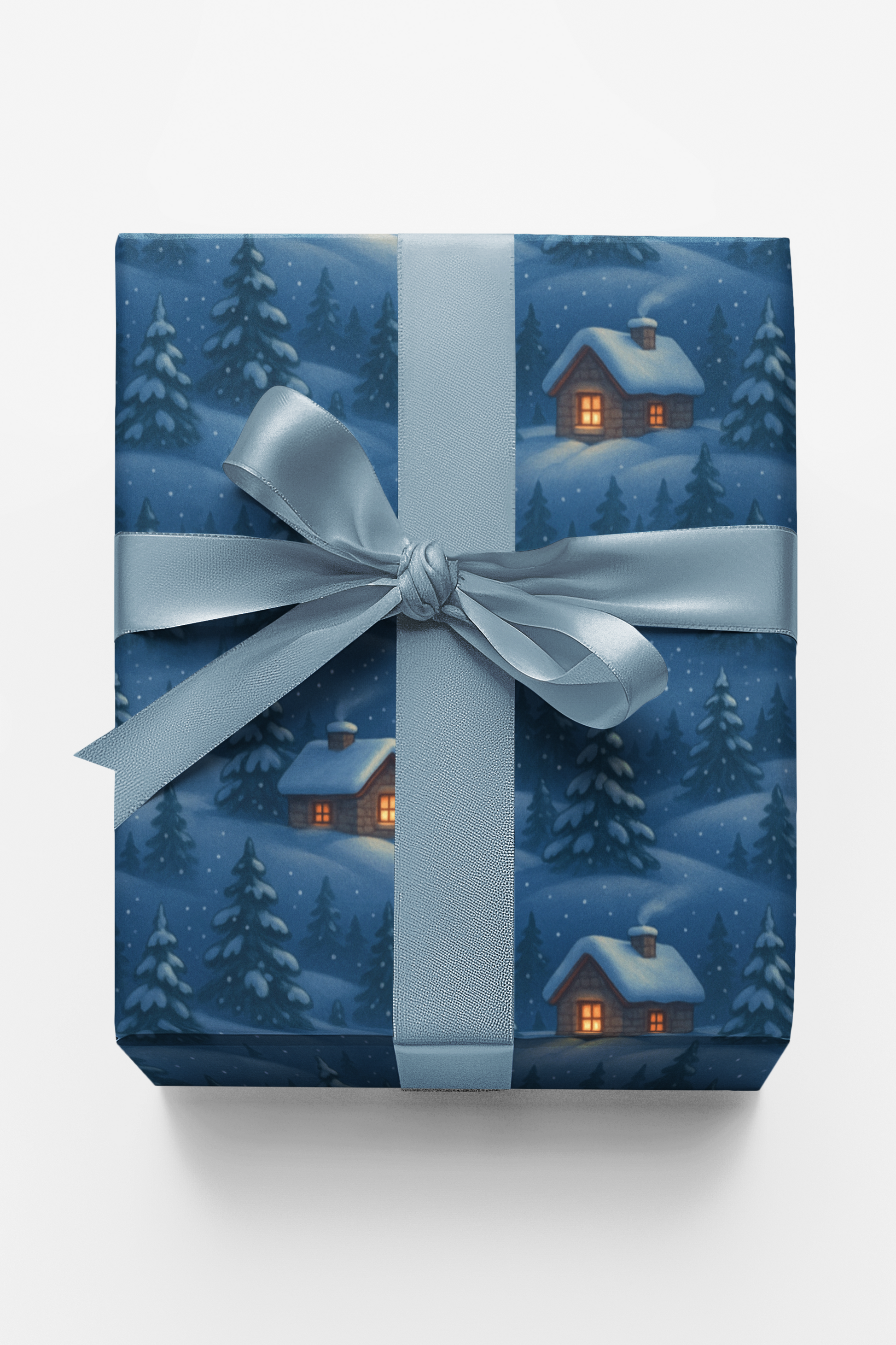 Nestled in a quilt of snowy hills and evergreen silhouettes, this design glows with the quiet magic of winter nights. Cozy cabins radiate golden light through frosted windows, each one a tiny haven against the deep blue hush of falling snow. The landscape feels serene and storybook-perfect—where pine trees stand like gentle guardians and the world is softened by the calm of winter’s embrace. Fireside Warmth celebrates comfort, nostalgia, and the simple joy of a glowing hearth on a peaceful snowy evening, wrapping every gift in the heartwarming charm of a winter retreat.