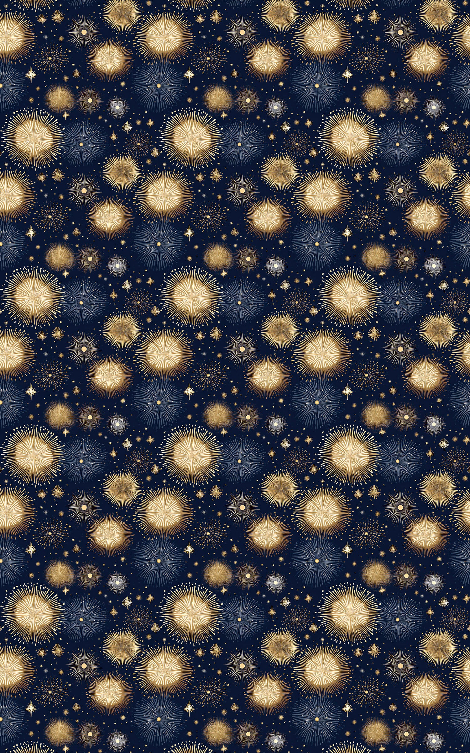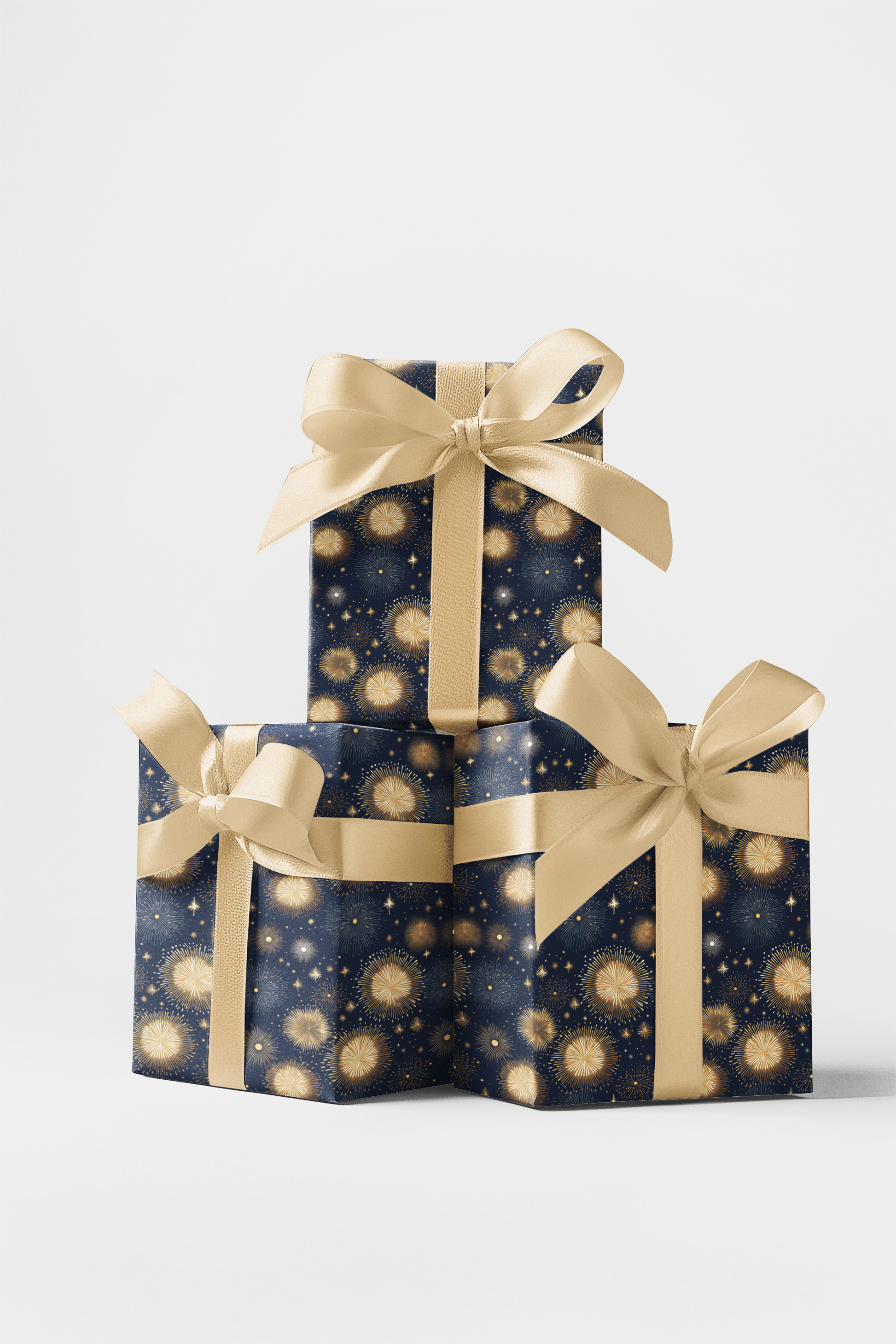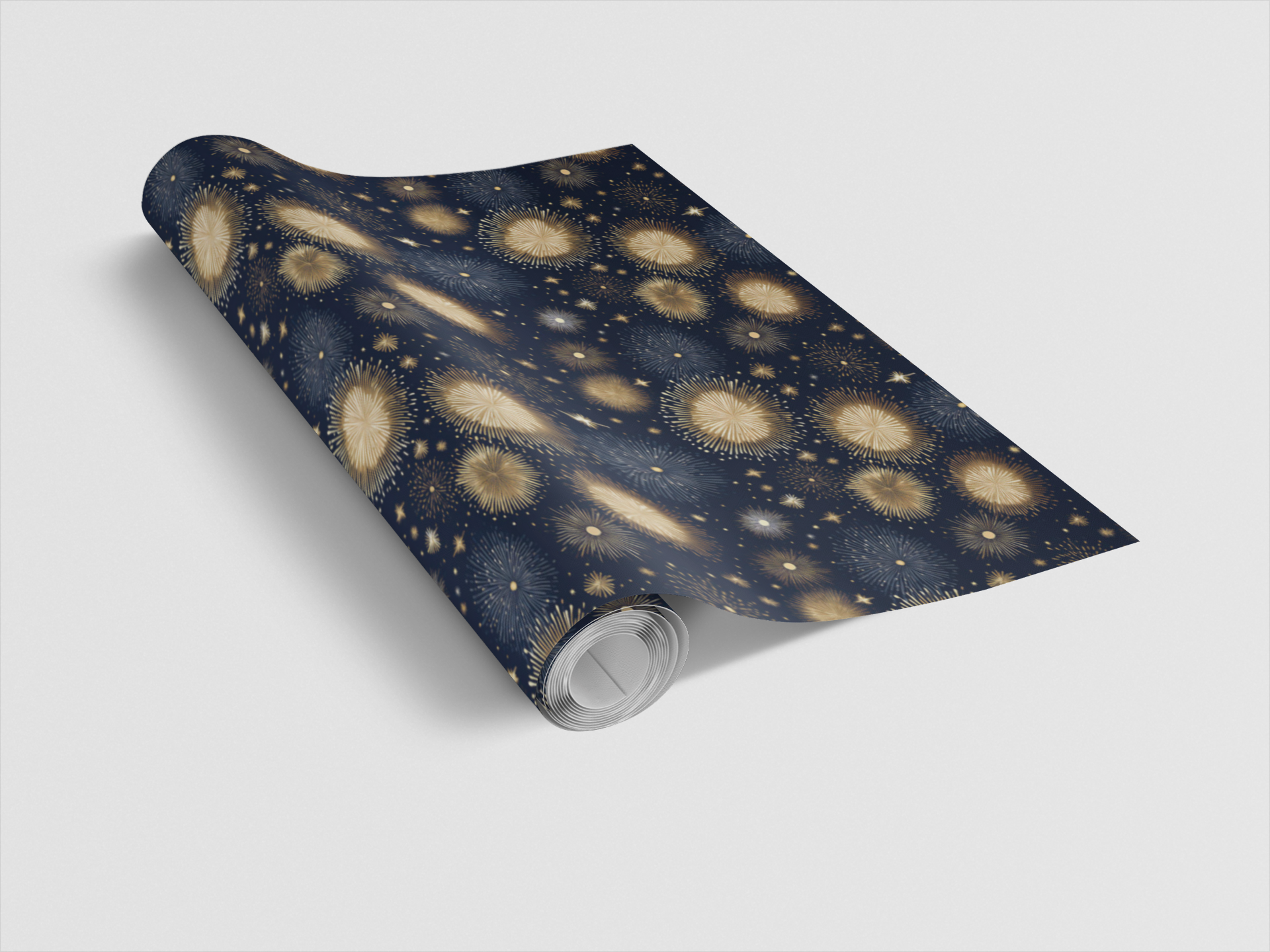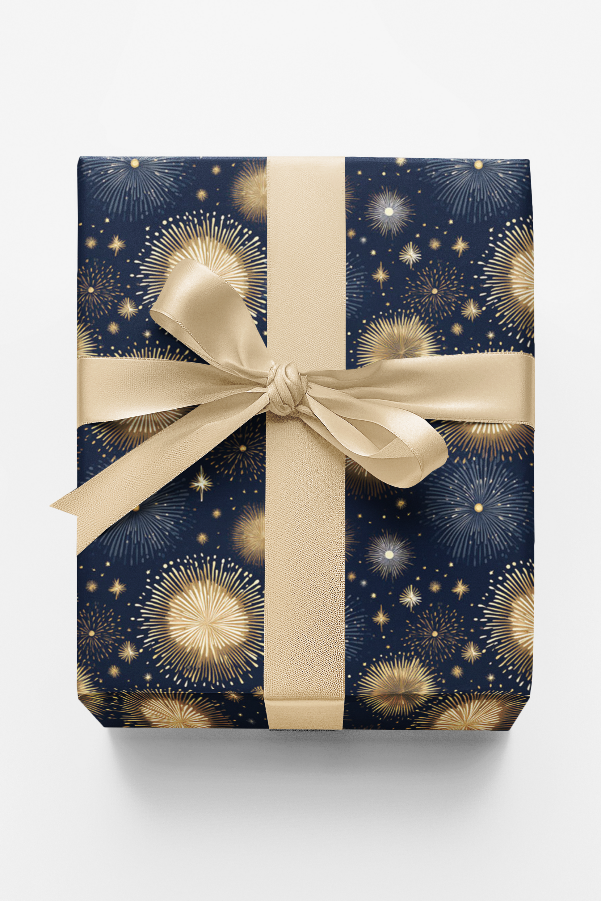 Make your gift presentation an explosive event with our Fireworks Finale wrapping paper! This dynamic, seamless pattern features a dense display of vibrant starburst fireworks in rich, saturated colors, including yellow, orange, teal, magenta, and deep blue. The artistic style gives the bursts a wonderful, textured glow against the dark, midnight sky background. It is the perfect choice for celebrating New Year's Eve, Fourth of July (4th of July), birthdays, graduations, anniversaries, or any big occasion that deserves a celebratory, joyful, and visually stunning wrap.