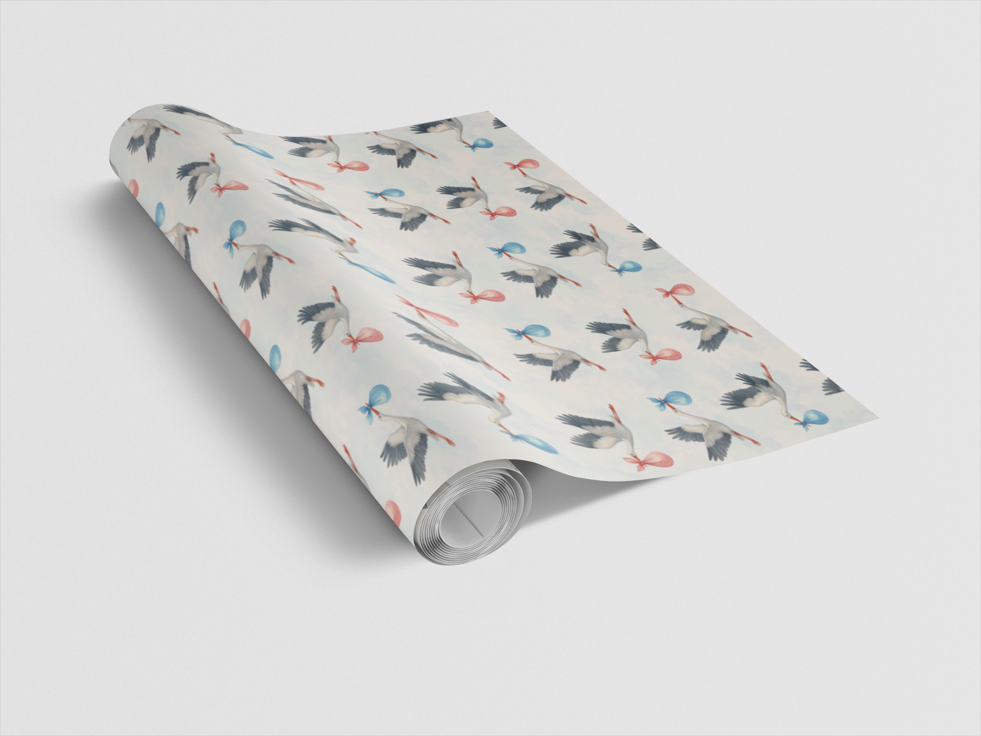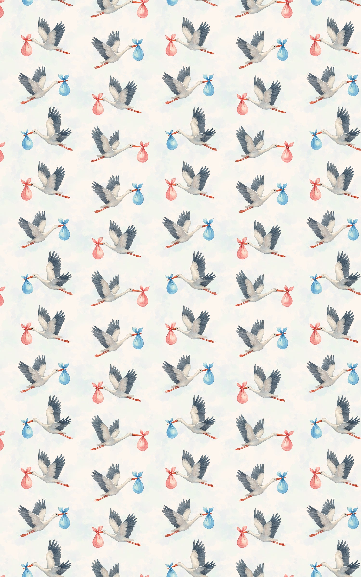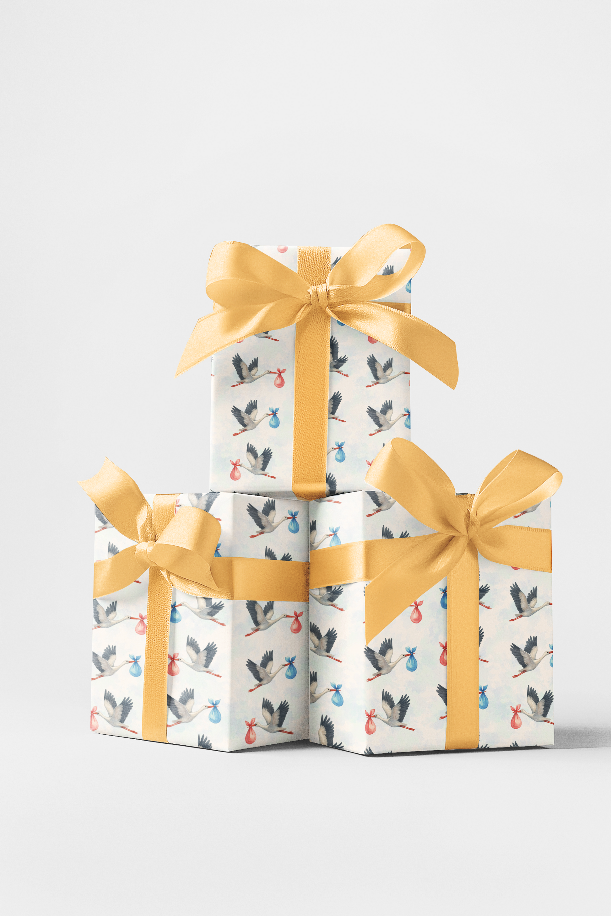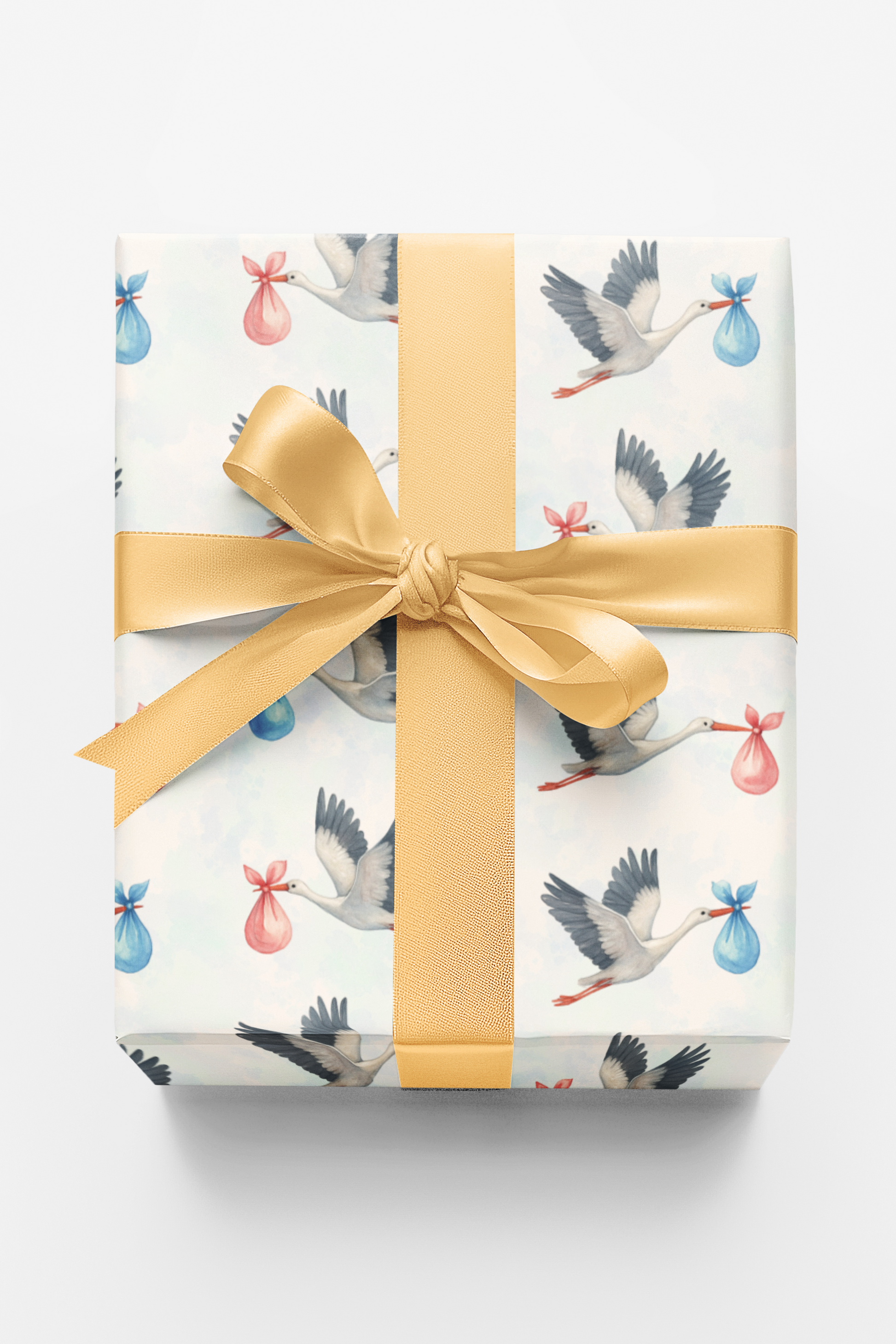 Graceful storks soar through soft skies, each carrying a delicate bundle tied with pastel ribbons a timeless symbol of joy, hope, and new beginnings. With its gentle watercolor charm, this design wraps your gifts in elegance, making every moment of giving feel like a treasured celebration.