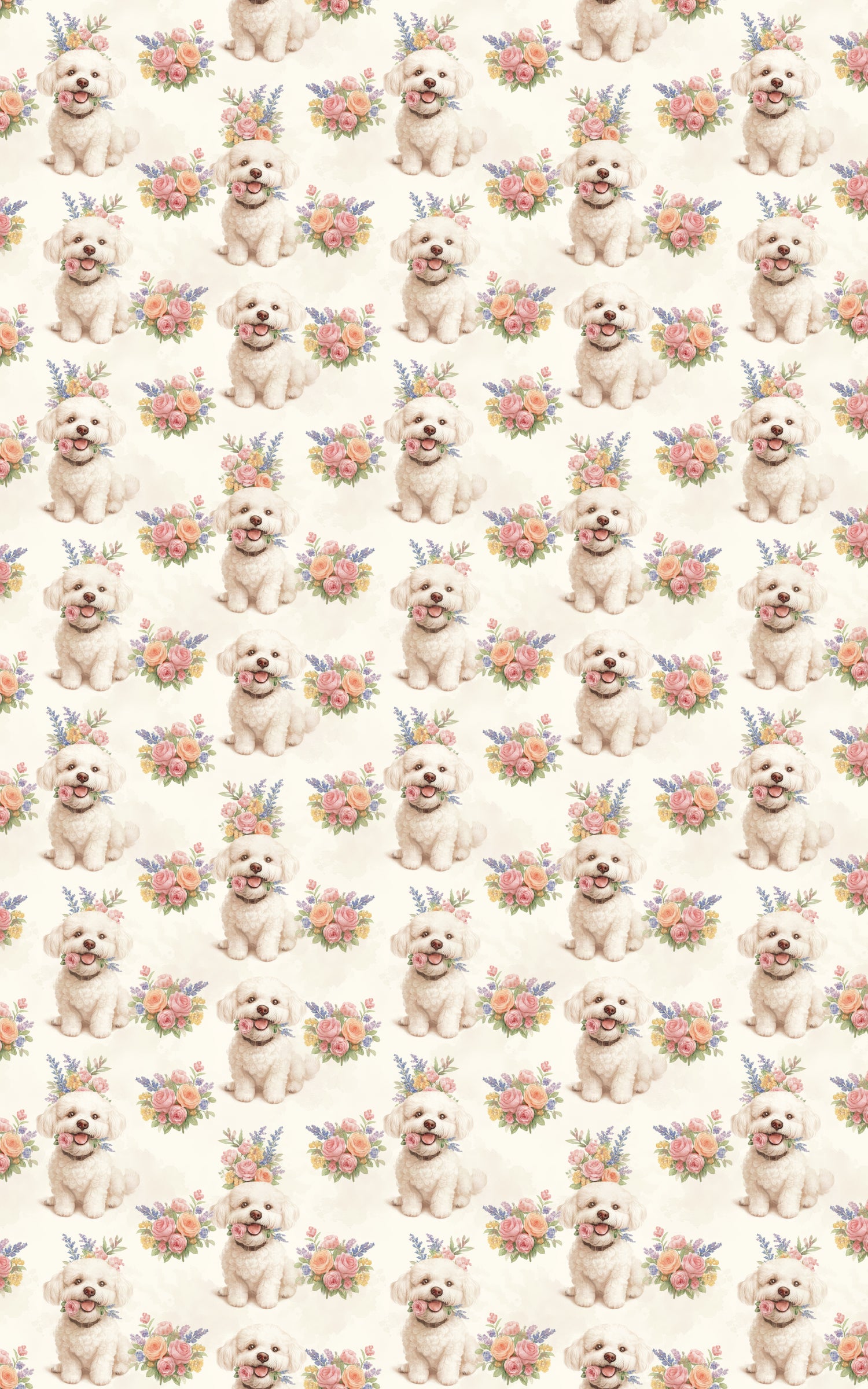 Radiating sweetness and charm, Floral Fetch captures the joy of a sunny garden stroll. Fluffy white pups sit among bouquets of pastel roses and lavender sprigs, their playful smiles blooming as brightly as the flowers around them. This design celebrates pure delight and gentle beauty—where every fold feels like a breath of springtime, and every glance reveals the heartwarming grace of a pup surrounded by blossoms in full bloom.