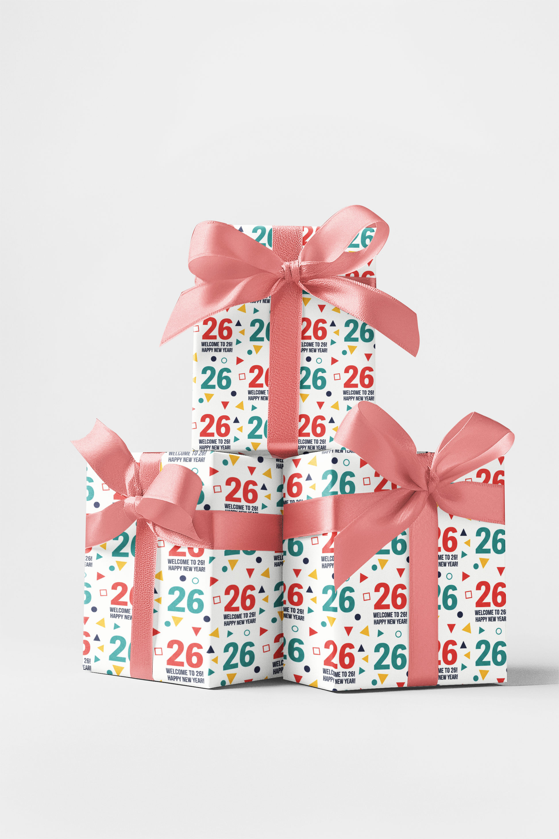 Celebrate a new chapter with the vibrant Fresh Start 26 wrapping paper! This energetic, modern design features a seamless repeat of bold '26' numbers interspersed with abstract geometric shapes (triangles, diamonds, and circles) and celebratory confetti dots. The clean, vector-style illustration uses an engaging primary color palette of red, yellow, bright teal, and navy, making it pop on any gift. It's the perfect contemporary wrap for a 26th birthday milestone, an energetic graduation, or any celebration marking a fresh beginning.