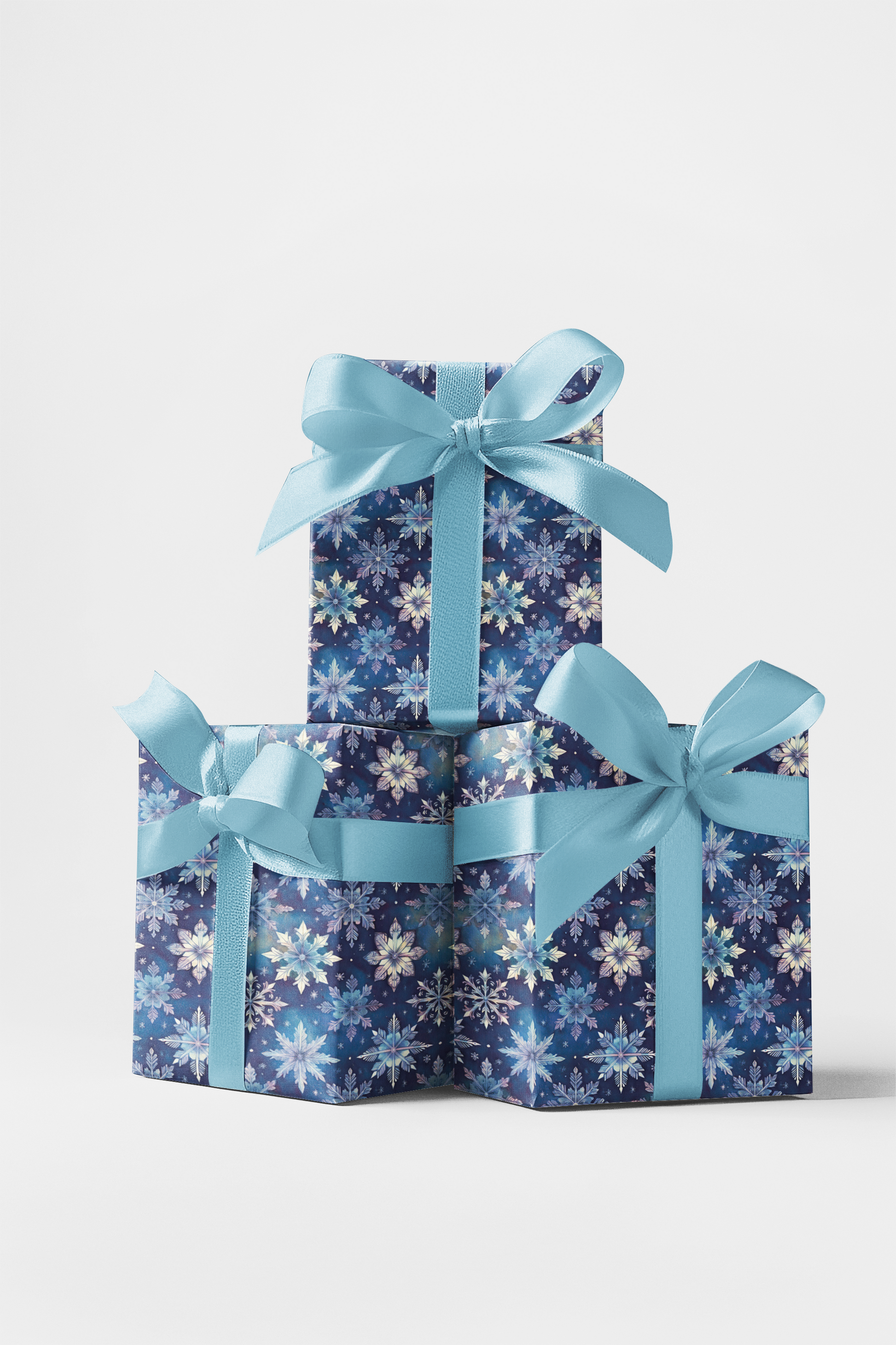 Wrap your winter gifts in the serene beauty of a snowy evening with our Frosted Snowflake Suite wrapping paper! This gorgeous, seamless pattern features a dense, layered collection of intricate, stylized snowflakes in varying shades of crisp white and ice blue. The contrasting deep royal blue background perfectly mimics a beautiful winter sky, making the snowflakes appear to float and shimmer. It is the perfect wrap for Christmas, Hanukkah, winter birthdays, anniversaries, or any occasion that calls for a refined, classic, and beautifully cool seasonal theme.