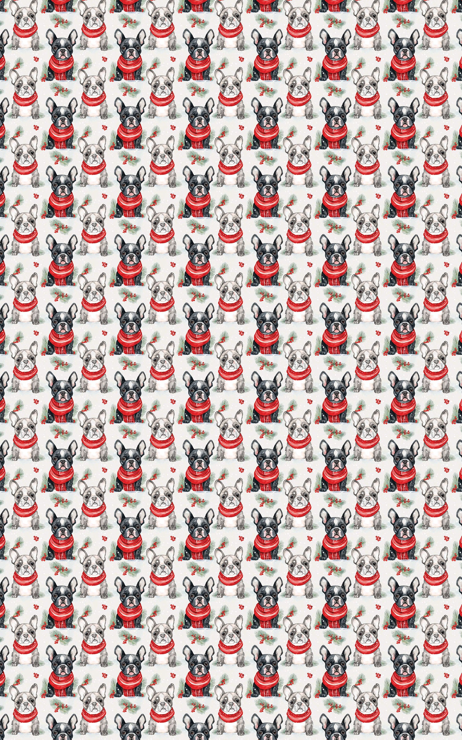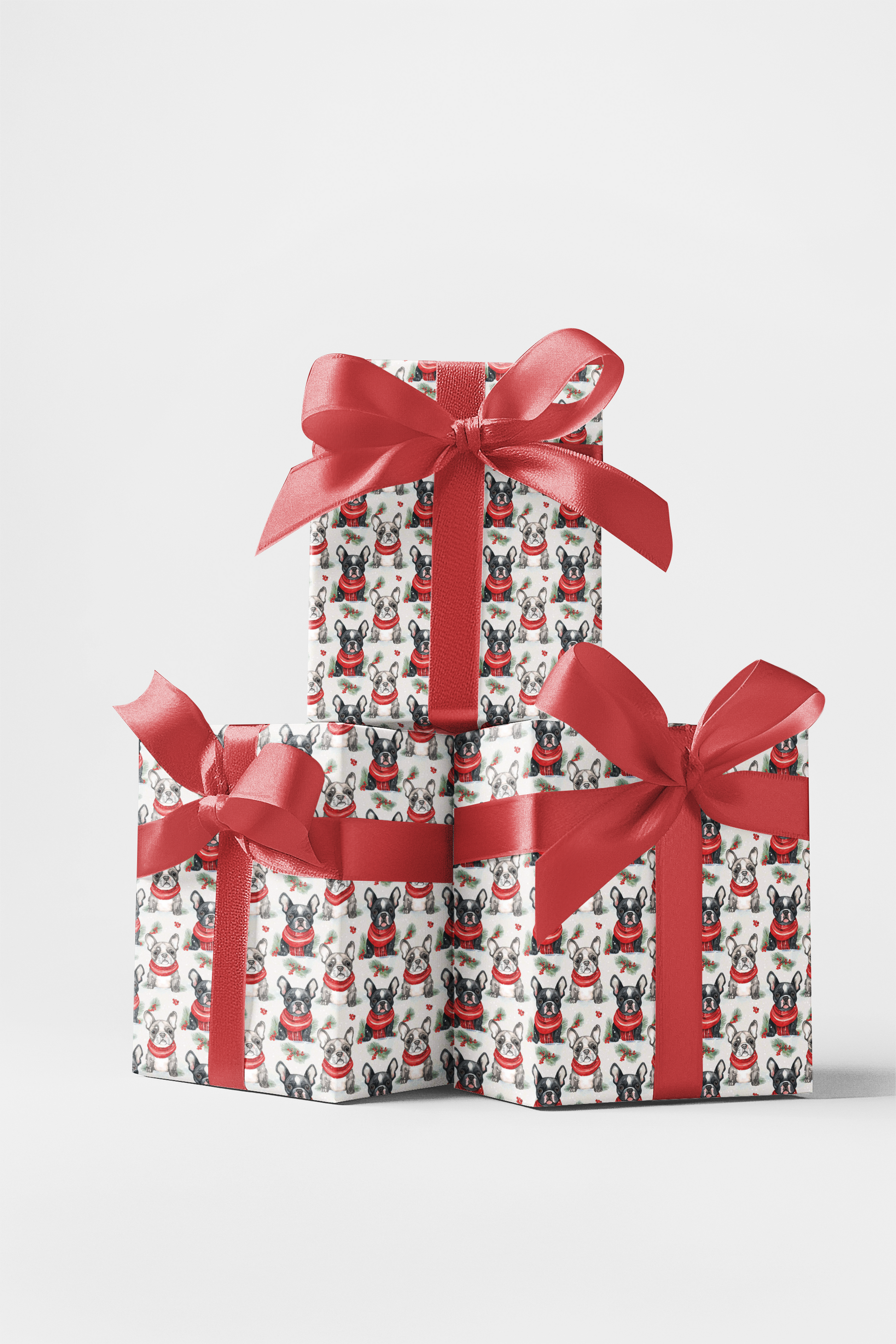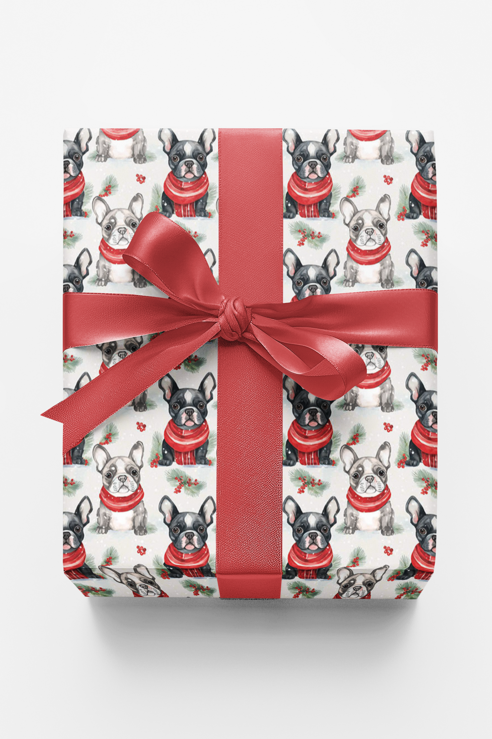 Add a dash of festive fun and Frenchie charm to your holiday gifts with our Frosty Frenchies wrapping paper! This heartwarming design features adorable French Bulldogs dressed in cheerful red scarves, surrounded by delicate holly and winter greenery. Illustrated in a soft watercolor style, each pup radiates personality and holiday joy. Perfect for dog lovers, pet owners, and anyone who loves playful yet elegant gift wrap, this premium paper brings warmth and whimsy to every present under the tree. Pair it with our matching gift tags for a complete, paw-fect presentation!