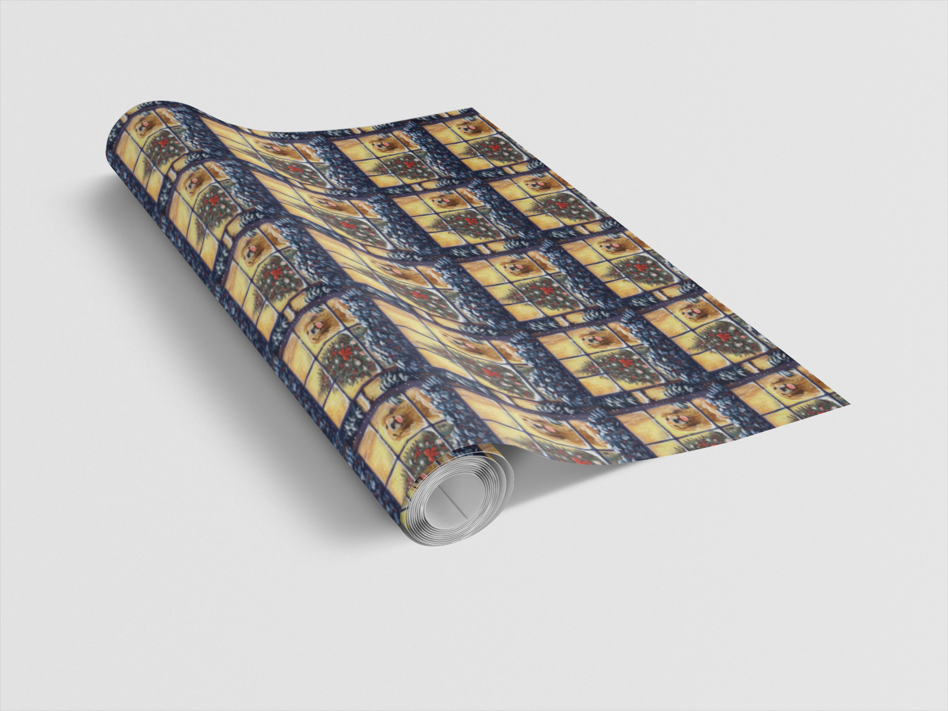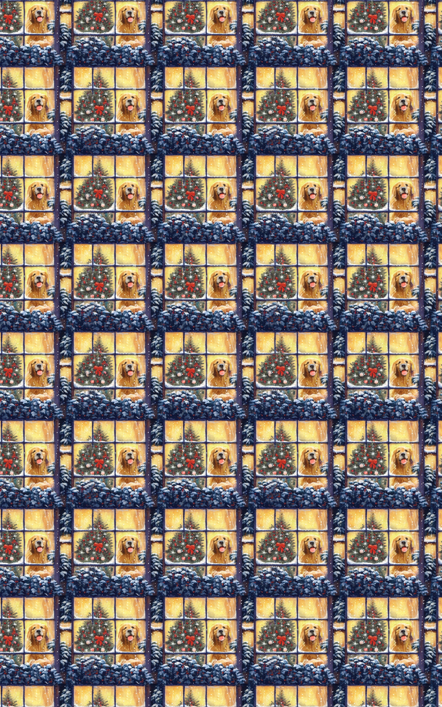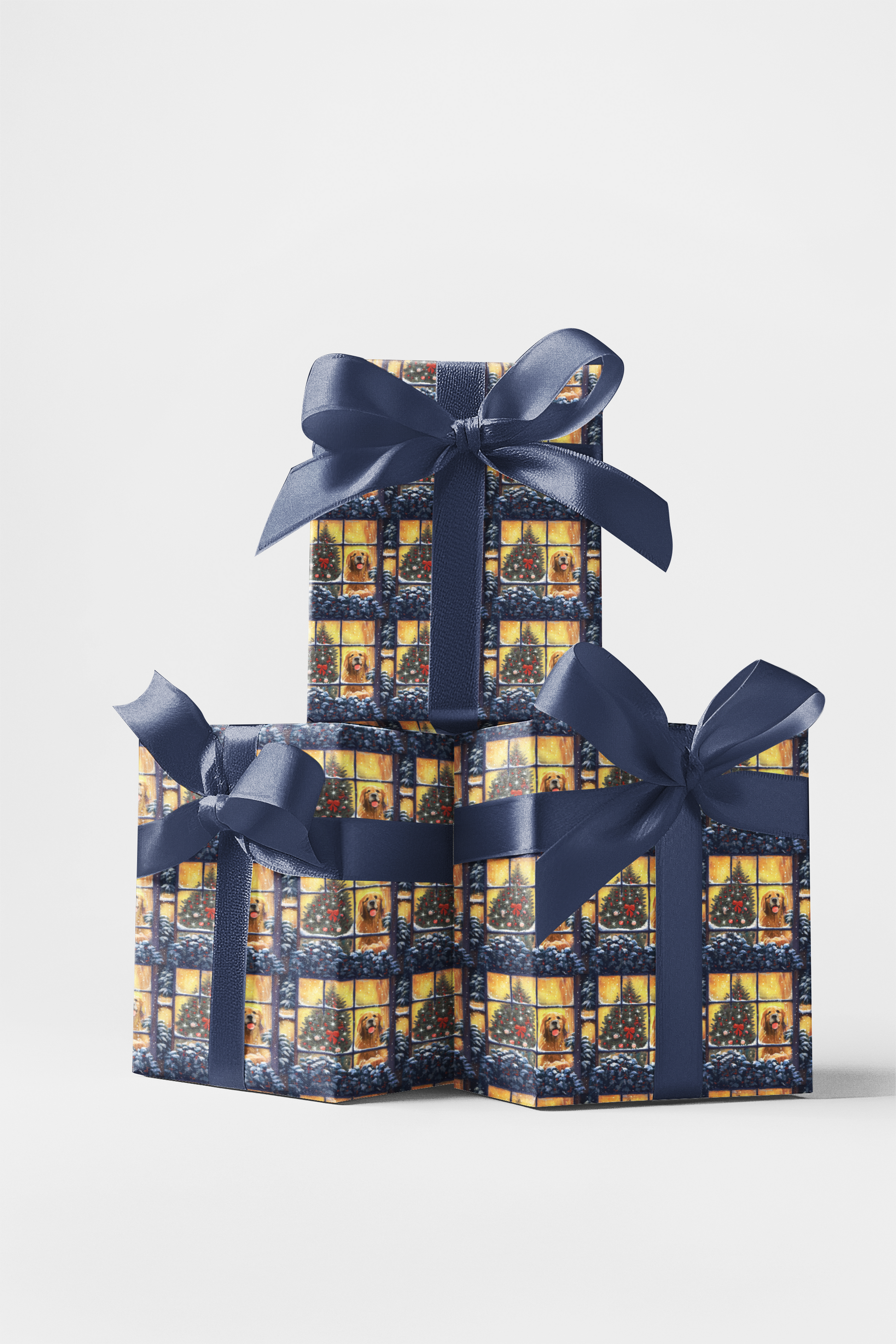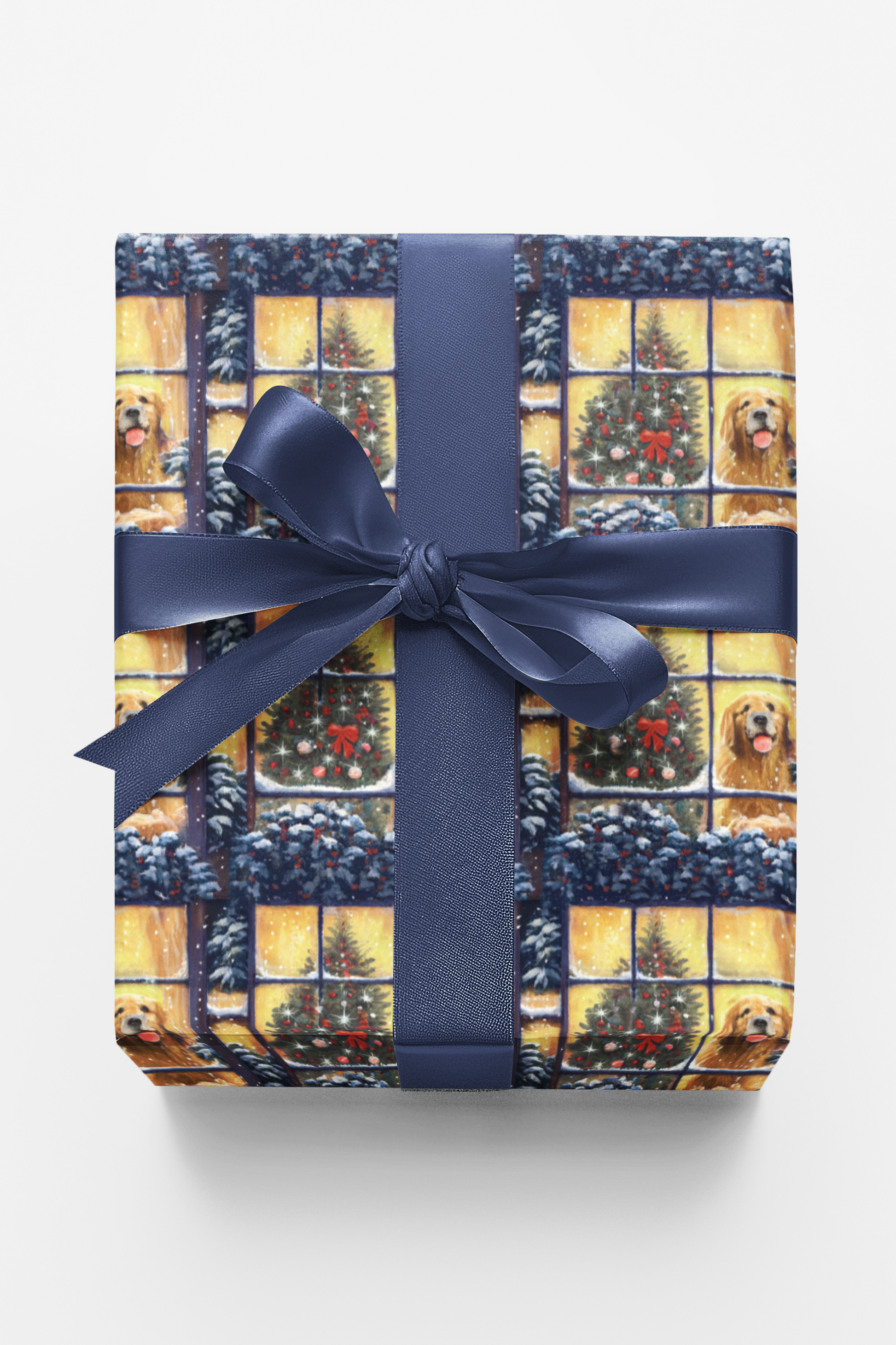 Capture the magic of the holidays with this heartwarming wrapping paper featuring golden retrievers gazing out snow-frosted windows beside twinkling Christmas trees. The soft glow and cozy charm evoke that timeless feeling of home for the holidays — perfect for wrapping gifts with love and nostalgia. Ideal for Christmas morning, winter birthdays, or festive hostess gifts, it pairs beautifully with satin ribbon or natural twine for a classic holiday finish.