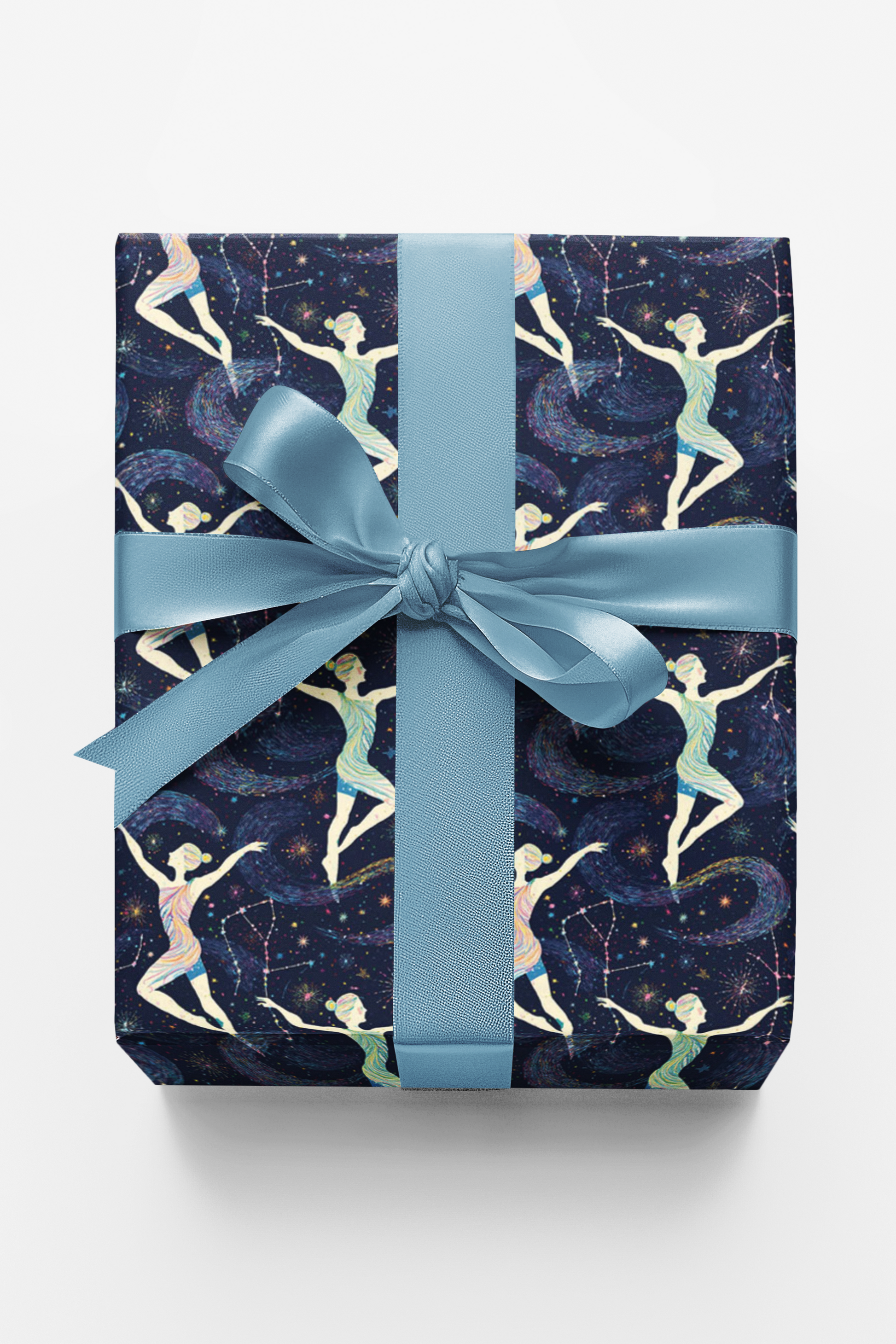 Reach for the stars with our Galaxy Gymnast Wrapping Paper. Featuring striking silhouettes of gymnasts soaring and flipping through constellations and trails of stardust, this design beautifully blends athletic grace with celestial wonder. Perfect for dreamers, athletes, and space enthusiasts alike, it adds a magical, inspiring touch to birthdays, recitals, and special celebrations.