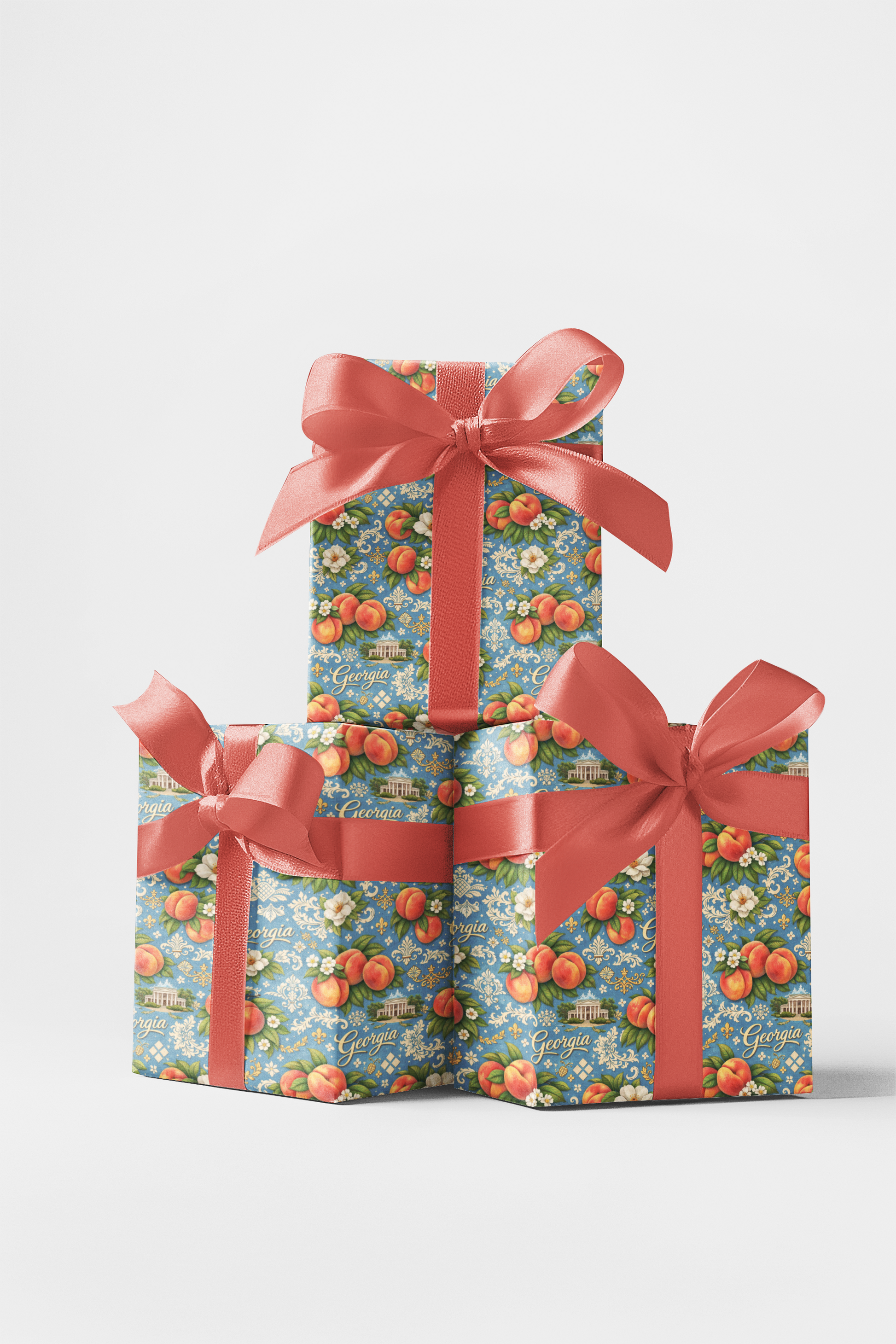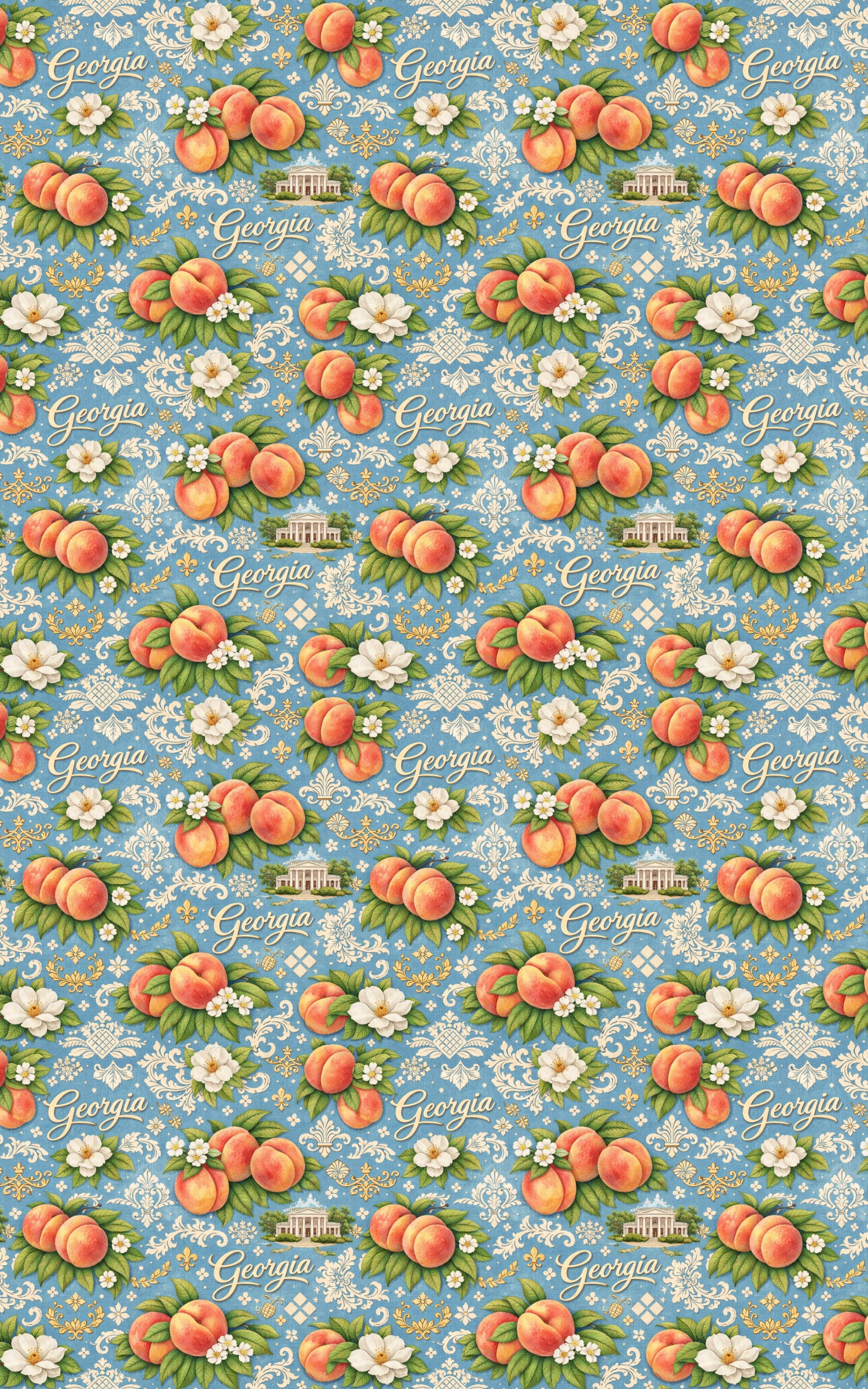 Rich with Southern grace and timeless charm, Georgia Peach State Classic blossoms with warmth and heritage. Plump peaches glow against soft blue skies, nestled among delicate white florals and elegant patterns that echo tradition and pride. Every detail feels welcoming and refined—sweet yet dignified, nostalgic yet fresh. This design celebrates Georgia’s iconic fruit and enduring elegance, where hospitality blooms naturally and every fold carries the comforting beauty of the Peach State in full flourish.