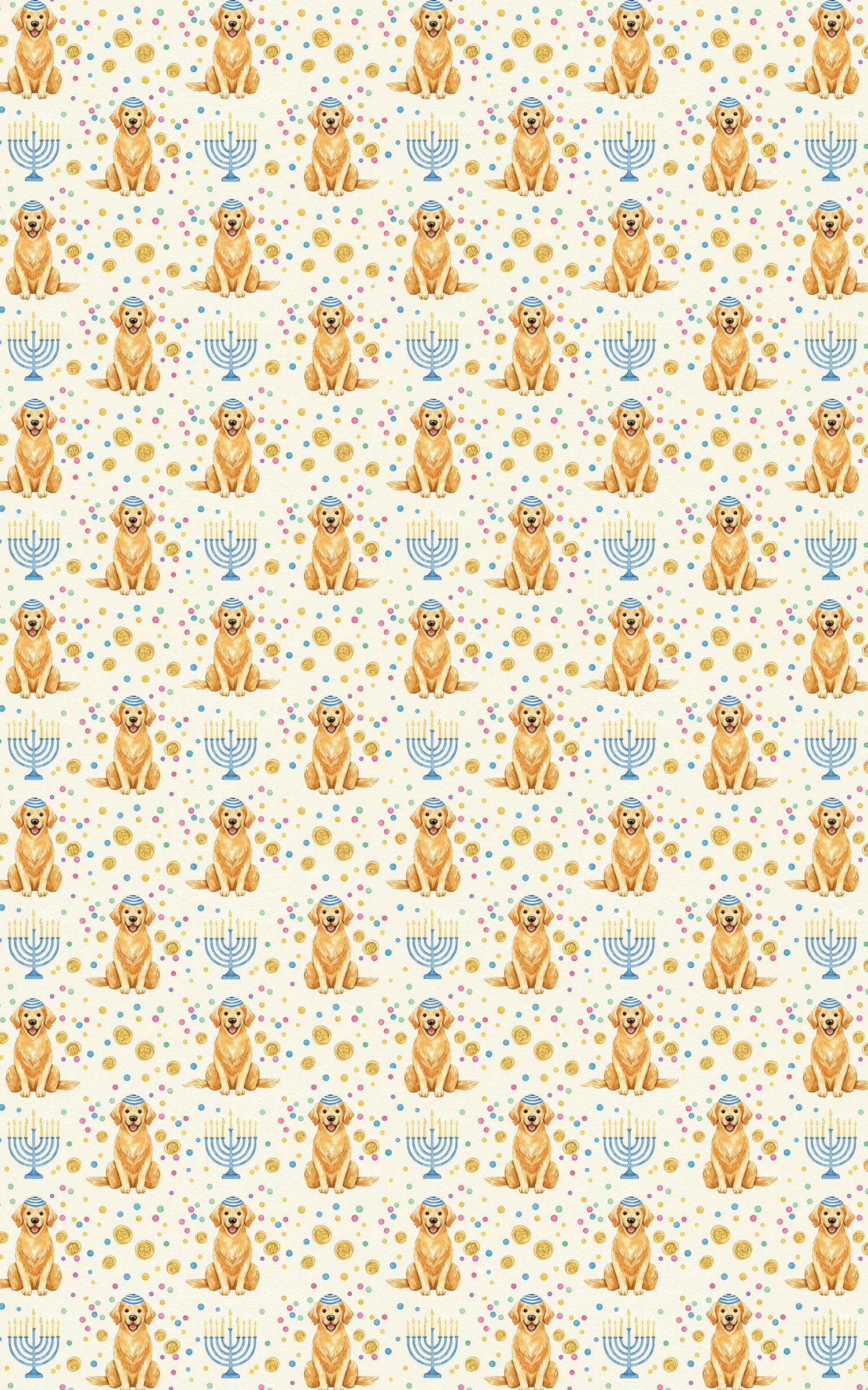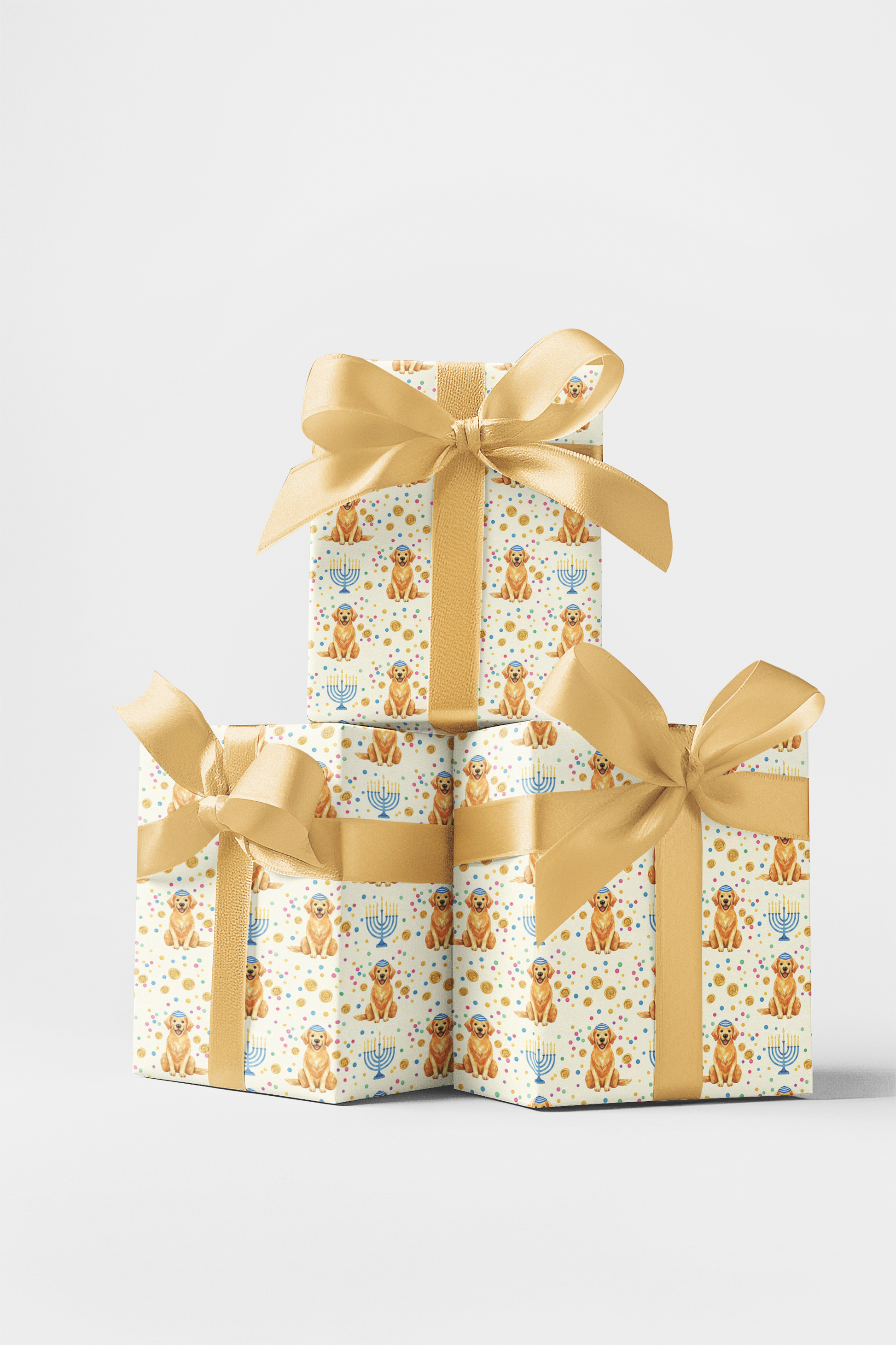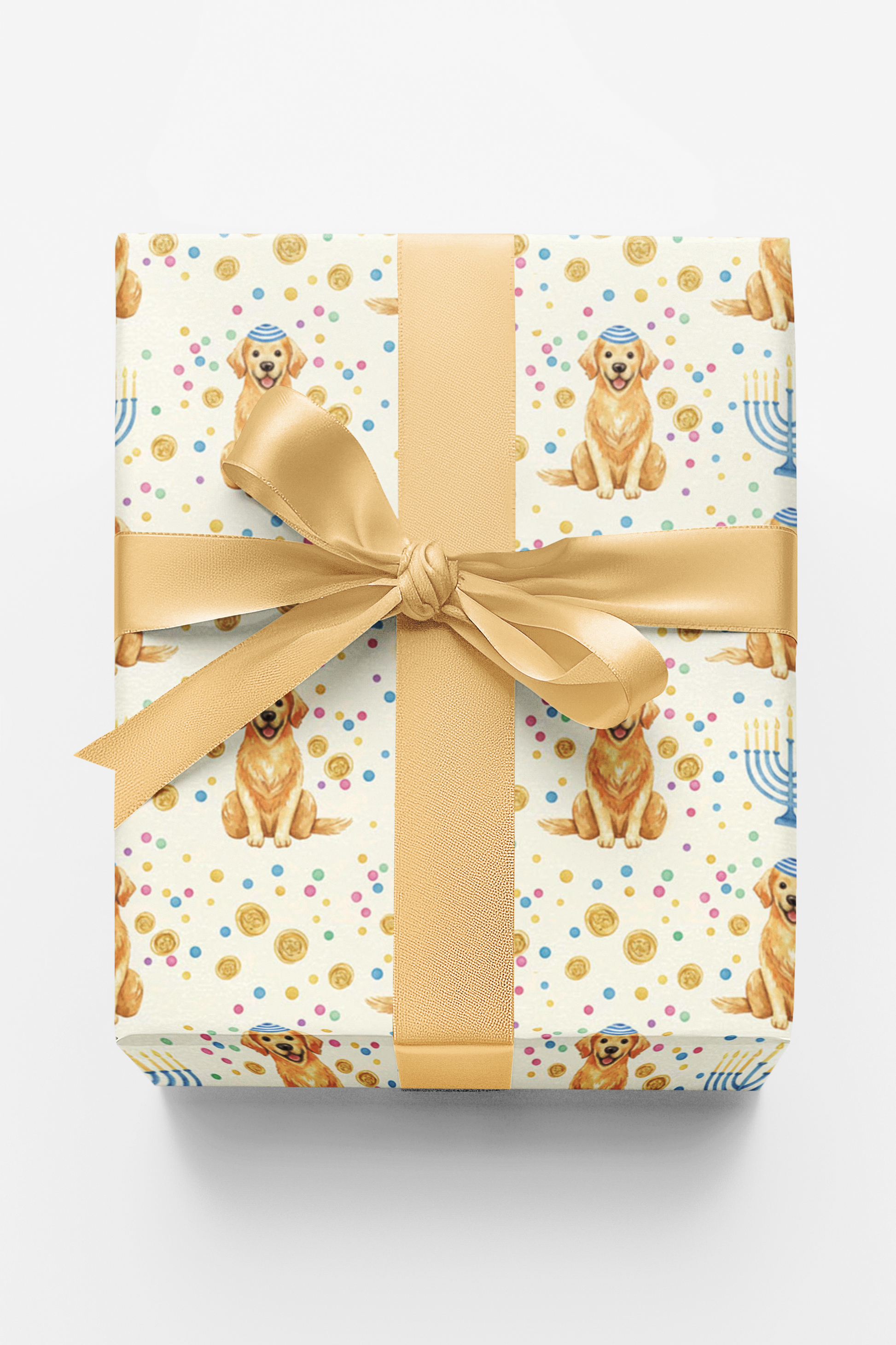 Celebrate the Festival of Lights with playful charm! This delightful design features adorable Golden Retrievers wearing kippahs or holding candles, surrounded by shimmering gelt and festive confetti. With its cheerful watercolor style, this wrapping paper is perfect for dog lovers, families, and anyone looking to add a joyful and heartwarming touch to their Hanukkah gifts.