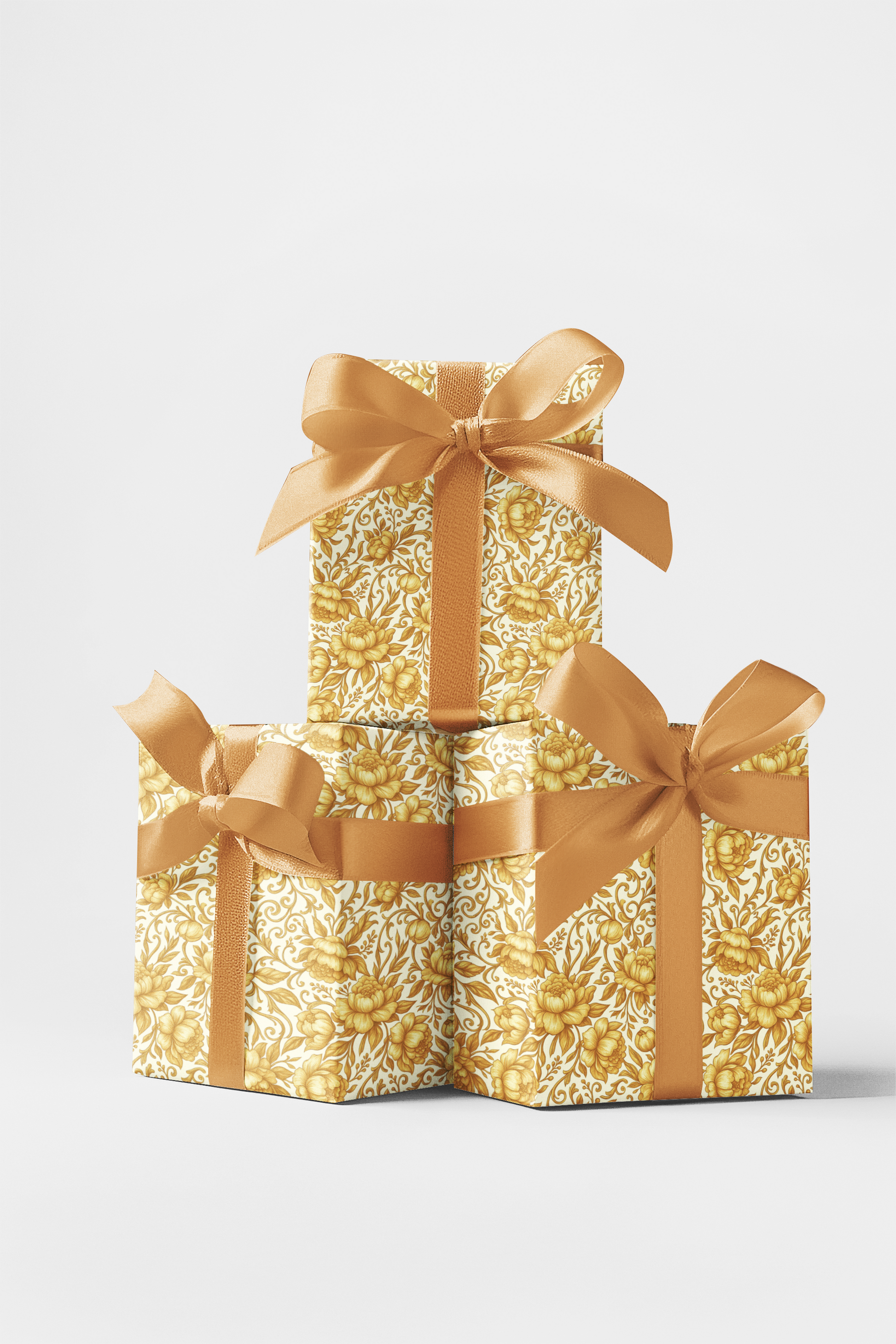 Radiate luxury and grace with our Golden Oro Bloom wrapping paper. Featuring intricate blooming florals intertwined with cascading gold filigree lines on a soft cream background, this design exudes timeless sophistication and warmth. Perfect for weddings, holidays, and elegant celebrations, it brings a touch of golden refinement to every gift.