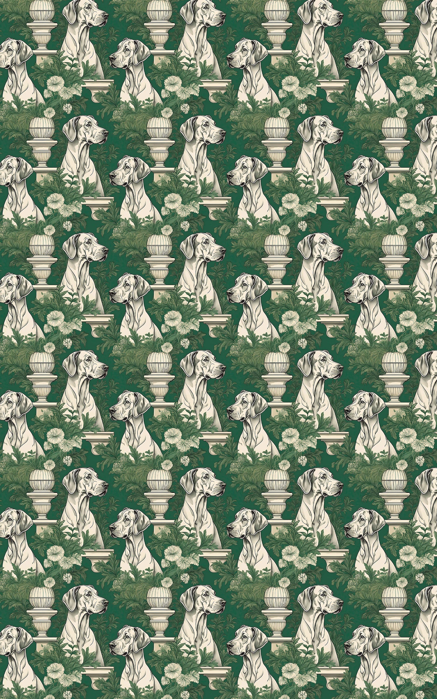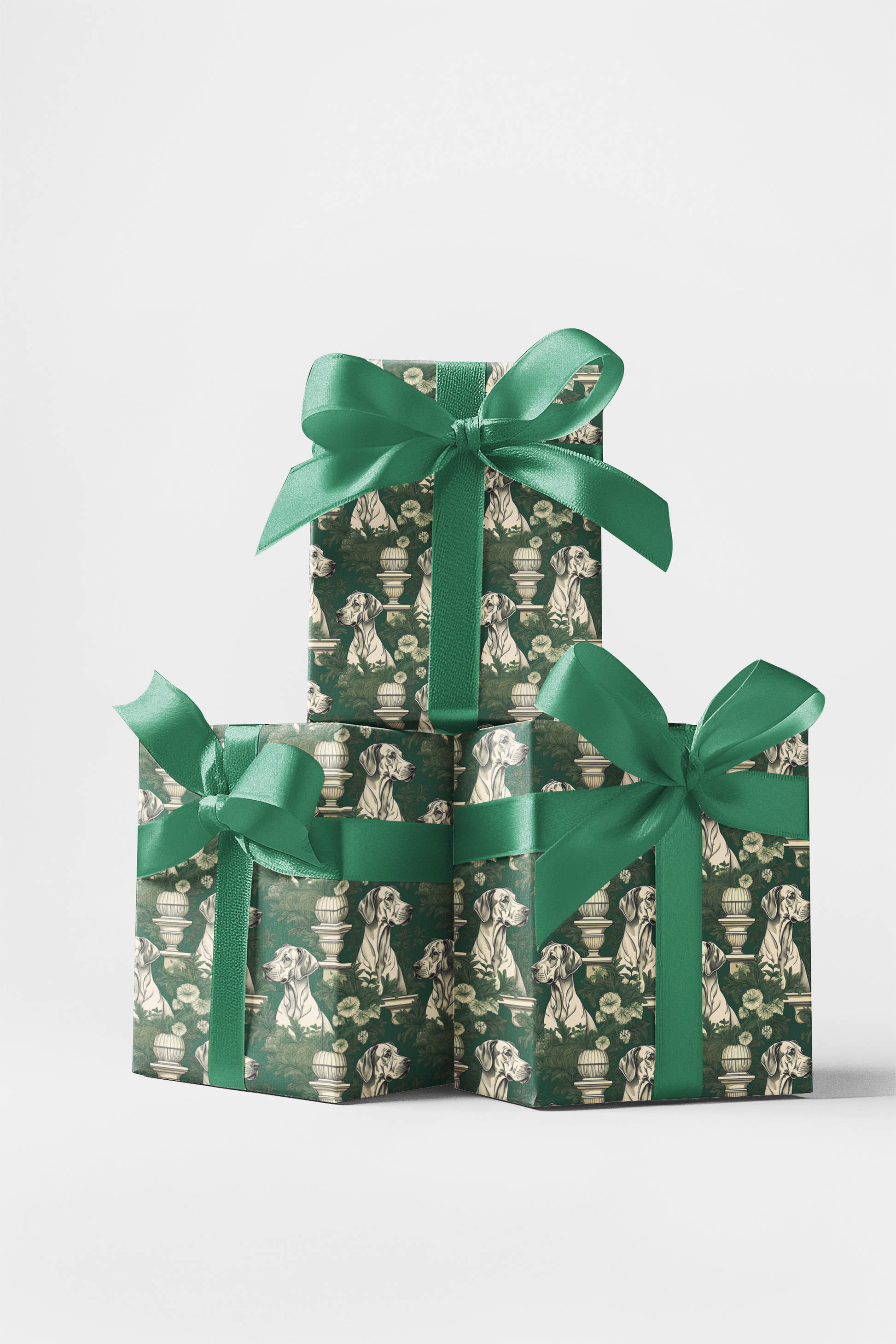 Elevate your gifting with this refined wrapping paper featuring a seamless toile pattern of elegant Great Danes posed gracefully among topiary, fountains, and ivy arches. Inspired by vintage line art, the design is arranged with balanced spacing in a sophisticated green monochrome palette. The result is a timeless, elegant look, perfect for weddings, anniversaries, upscale celebrations, or for dog lovers who appreciate classic style.