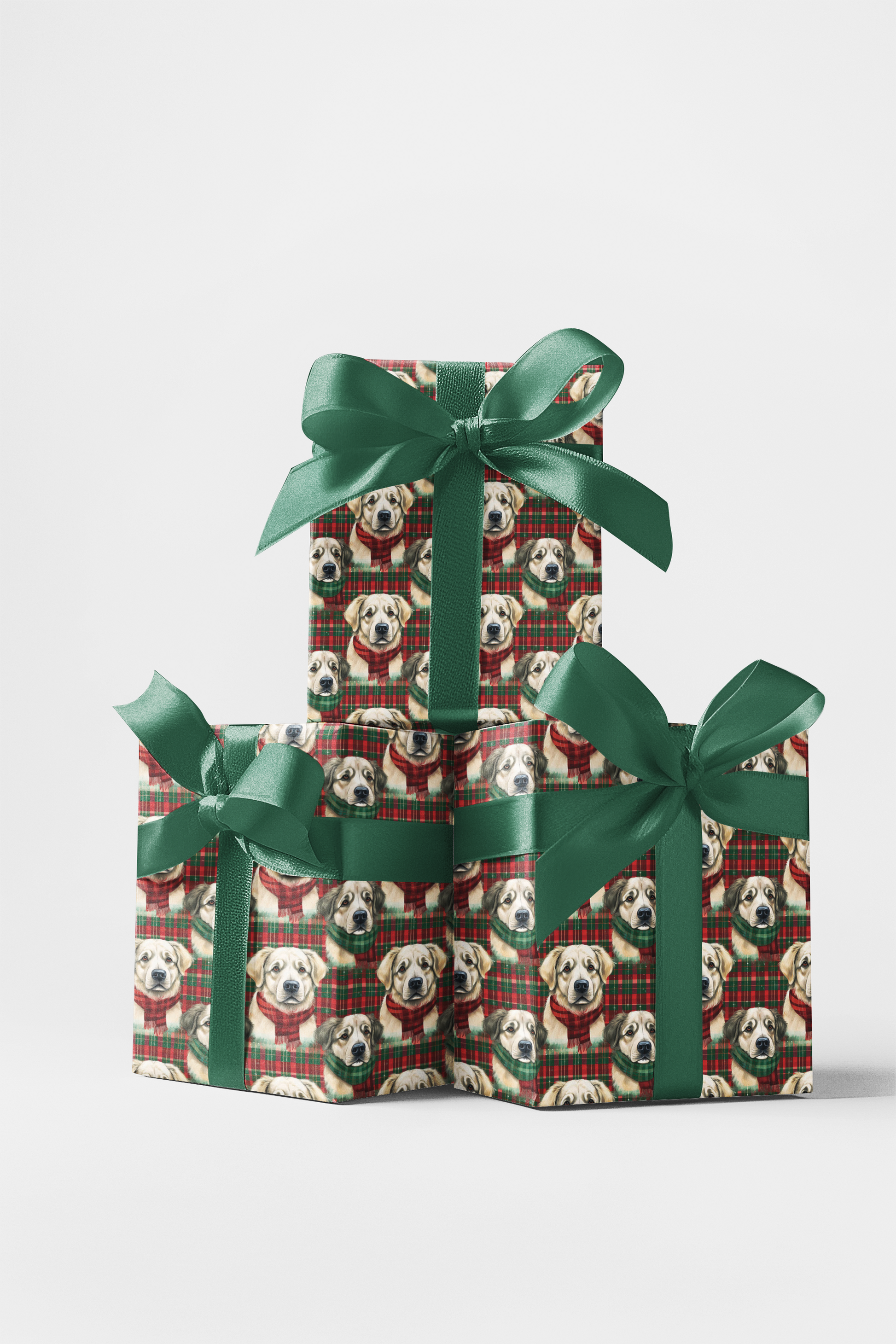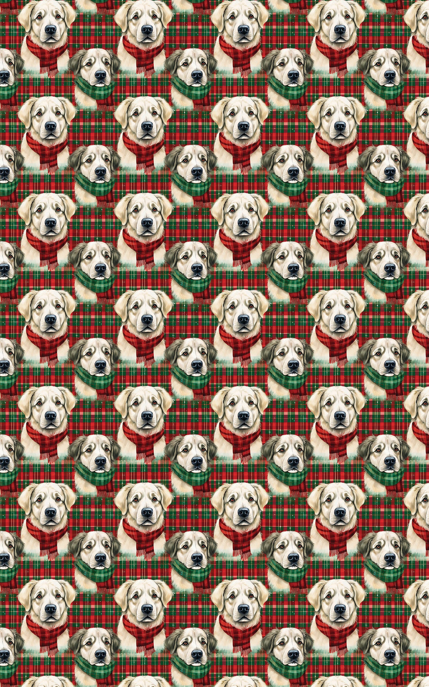 Wrap your gifts in cozy holiday charm with this delightful design featuring Great Pyrenees dogs wearing festive scarves. Illustrated in soft watercolor against a classic red and green plaid background, this seamless pattern captures the warmth and joy of the season. Perfect for Christmas gifts, winter celebrations, or any occasion that calls for a touch of elegance and festive cheer.