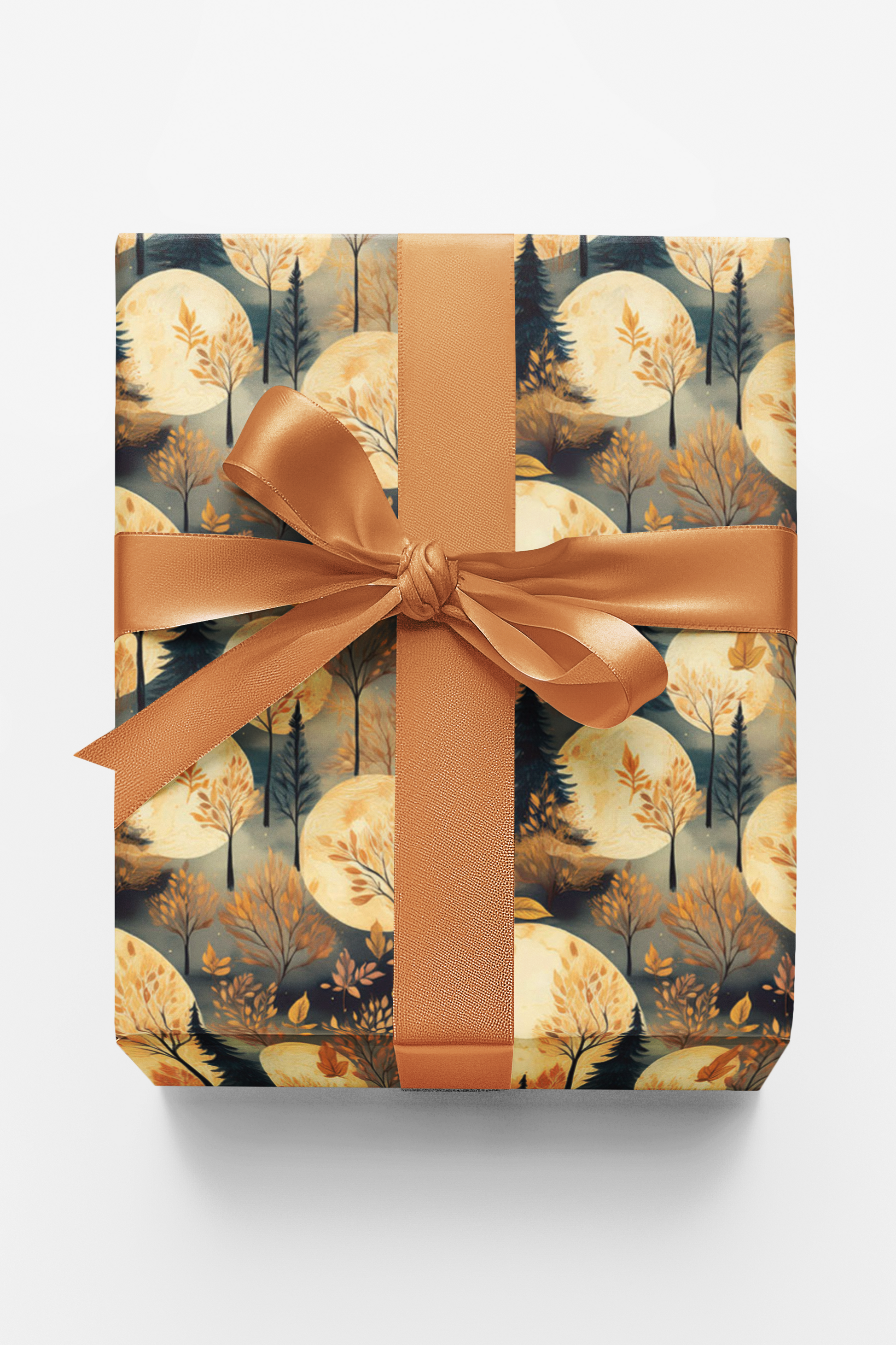 Harvest Moon. Beneath a golden autumn sky, a luminous moon rises over silhouetted trees, while gentle leaves drift like whispers of the season. Painted in soft watercolor textures and warm earthy tones, this design captures the beauty of fall’s quiet magic. Each gift is wrapped in harmony and charm—where every detail glows with coziness, balance, and the timeless spirit of autumn.