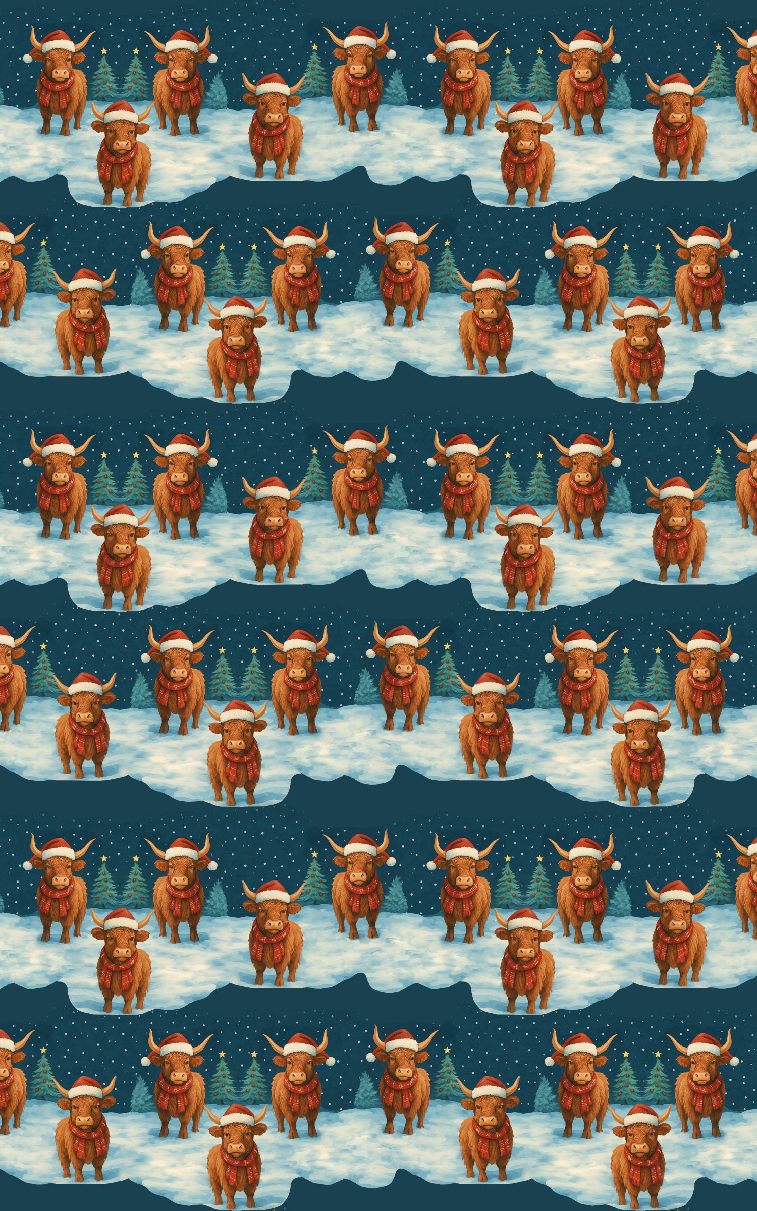 Bold and festive, the Bulls bring holiday strength to this captivating wrapping paper design. Wearing bright Santa hats beneath a snowy night sky, their spirited charm and timeless presence shine through, adding both warmth and seasonal magic to every gift. Perfect for Christmas lovers and any occasion, this design celebrates the beauty and individuality of these remarkable creatures.