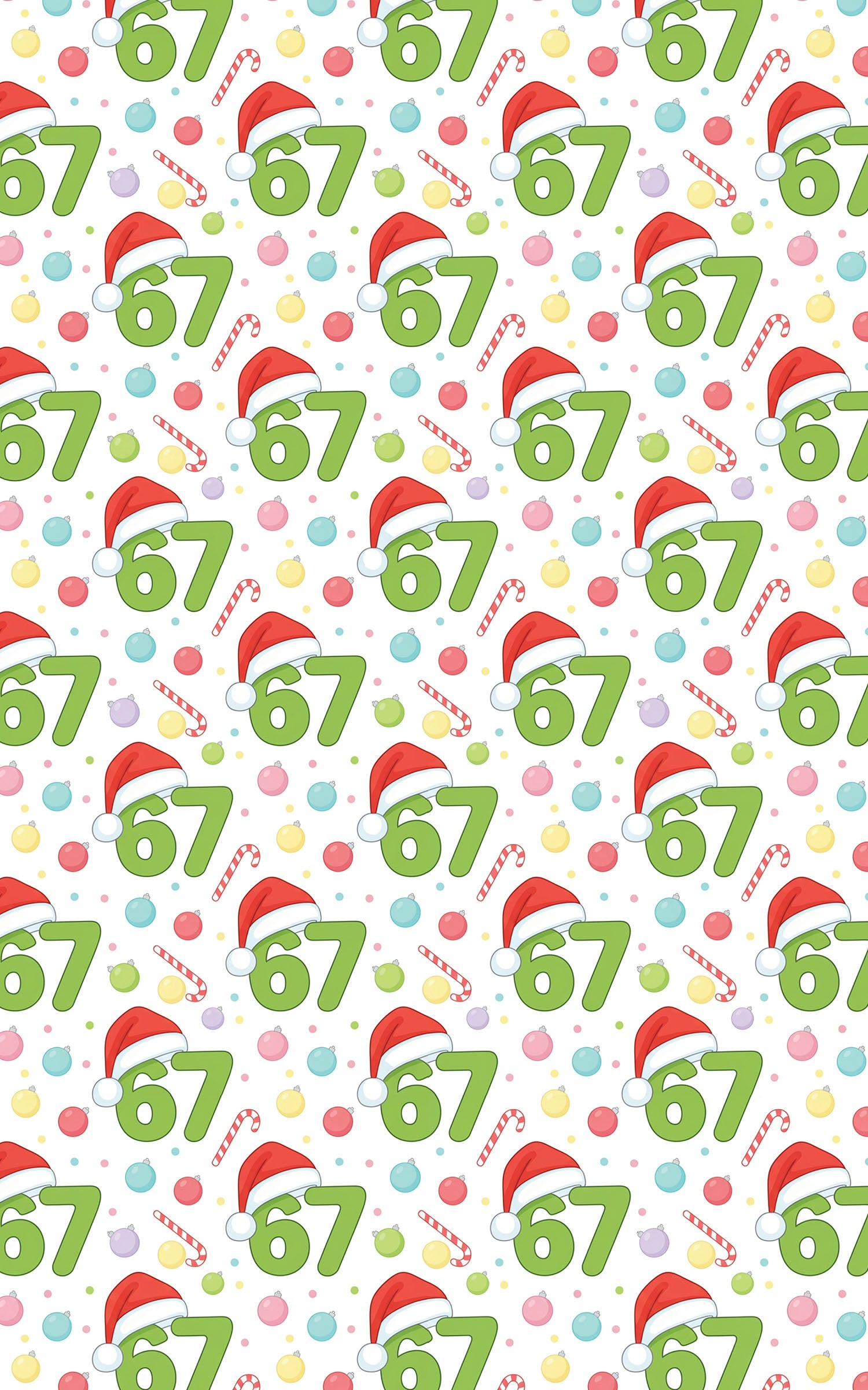 This cheerful Holiday 67 Pattern wrapping paper brings a fun, festive touch to every gift. The seamless pattern features large, playful numerals, with the “6” wearing an oversized Santa hat for a whimsical holiday feel. Candy canes and colorful baubles are scattered like confetti around the design, adding movement and charm. Bright green numbers paired with pink, red, and soft pastel accents create a lively, harmonious Christmas palette. Perfect for wrapping Christmas gifts, party favors, and seasonal packages.
