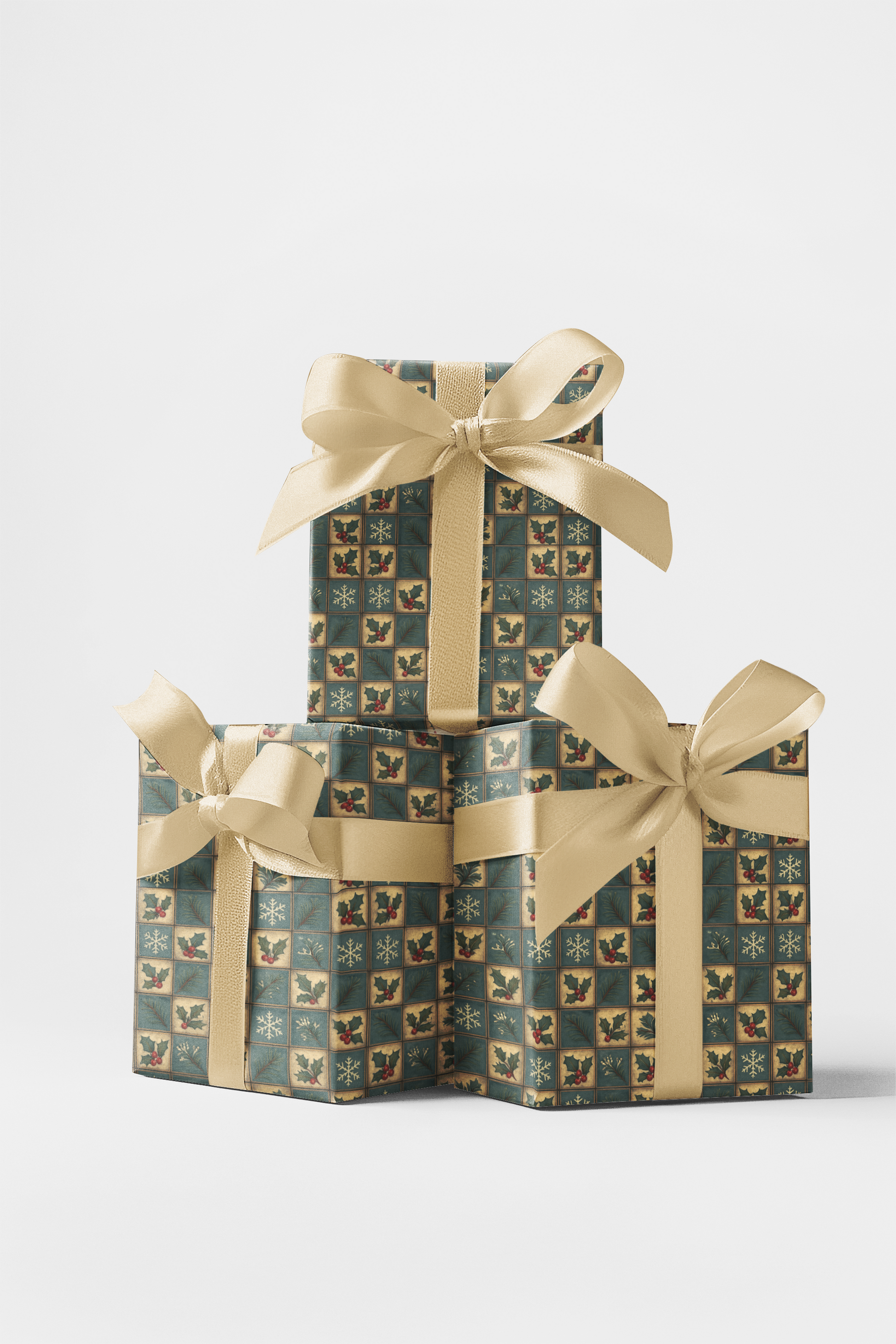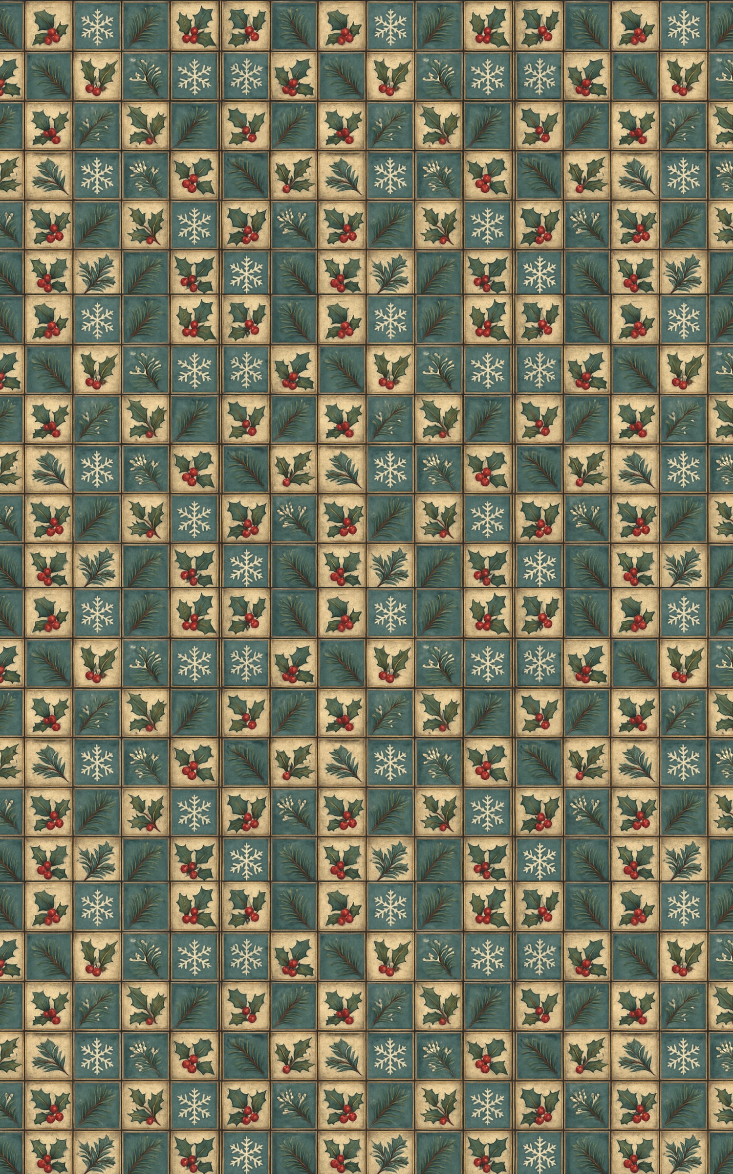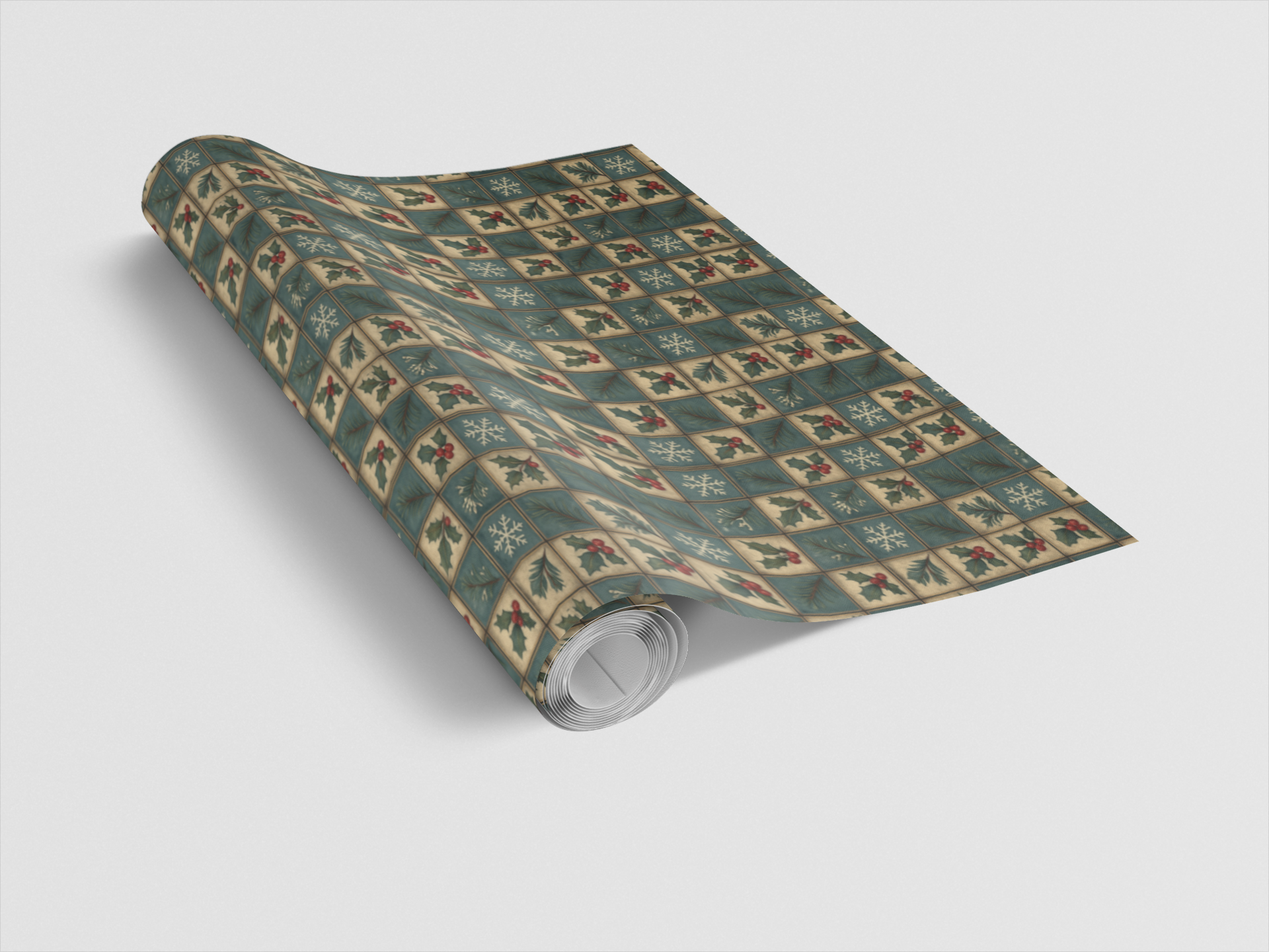 A tapestry of timeless Christmas charm, this design pieces together the season’s most beloved symbols into a beautifully patterned mosaic. Snowflakes, holly sprigs, winter berries, and evergreen branches each fill their own little square, like treasured tiles in a vintage holiday quilt. Muted teals, warm creams, and classic reds blend into a rich, nostalgic palette that feels handcrafted and heartfelt. Every fold shines with cozy, old-world magic—an intricate celebration of winter’s most iconic wonders, assembled with care and brimming with festive spirit.