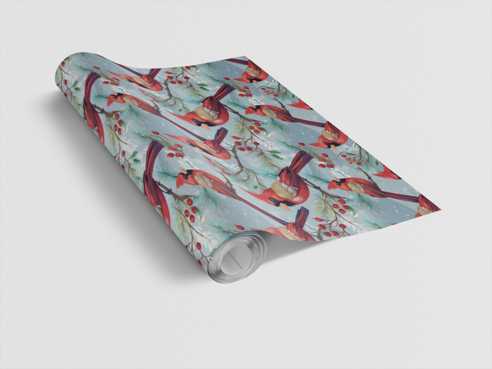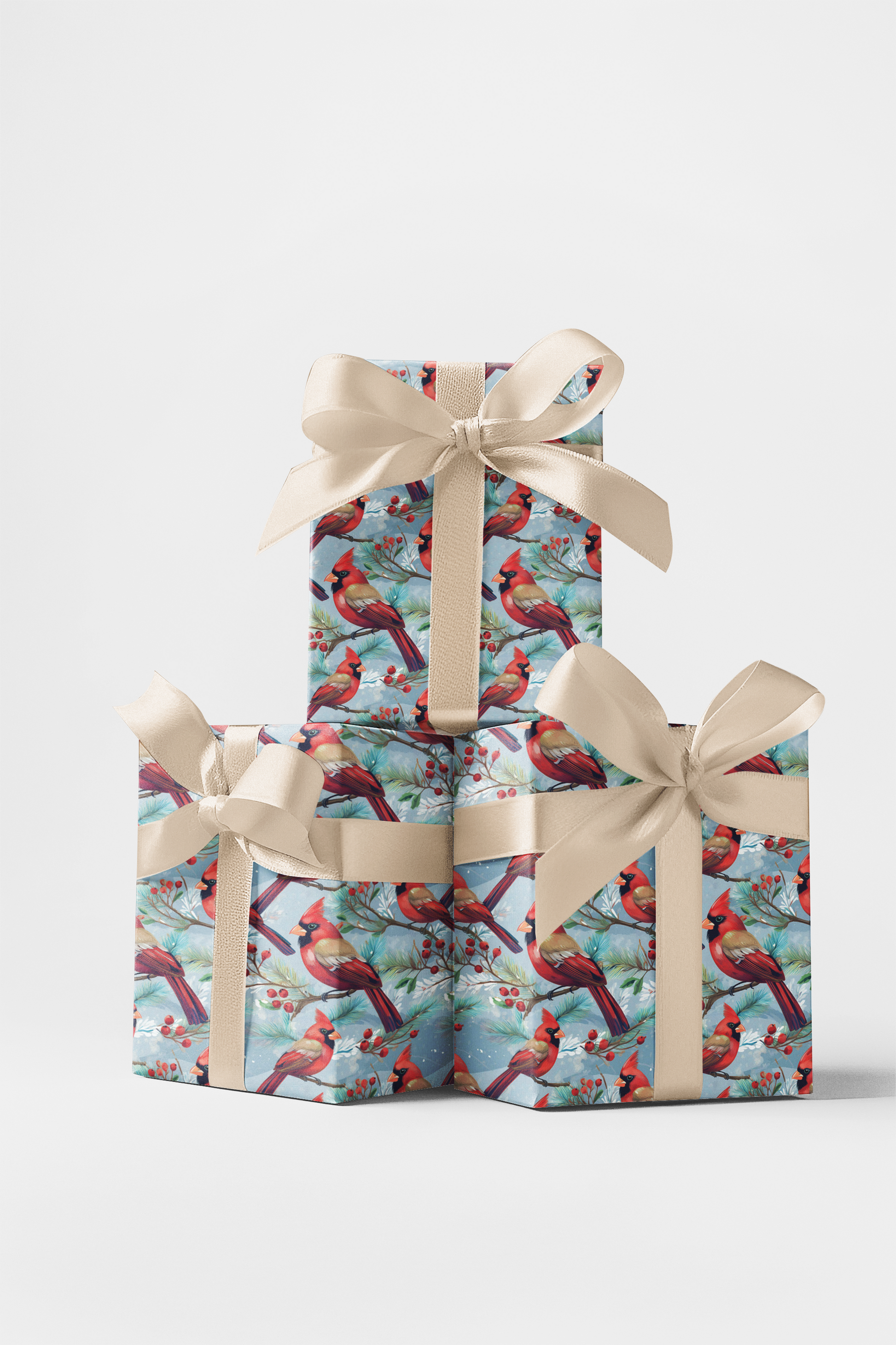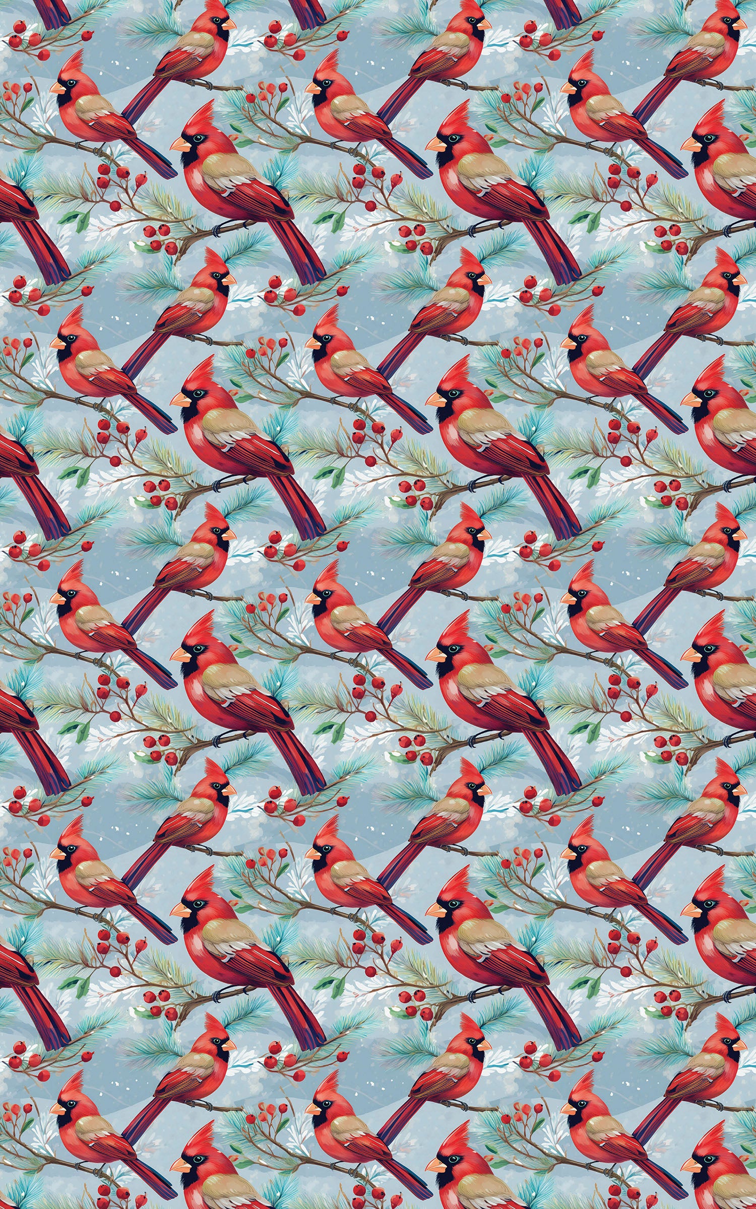 Bring the beauty of a snowy forest to your gifts with our Holly & Pine Cardinal wrapping paper! This gorgeous, seamless pattern features vibrant red male cardinals perched among snow-dusted pine boughs laden with bright red winter berries. The artwork has a rich, detailed, watercolor style, set against a softly shaded, light blue or pale winter sky background. It is the perfect wrap for Christmas, winter birthdays, bird lovers, or any occasion that calls for a rustic, colorful, and naturally beautiful holiday theme.